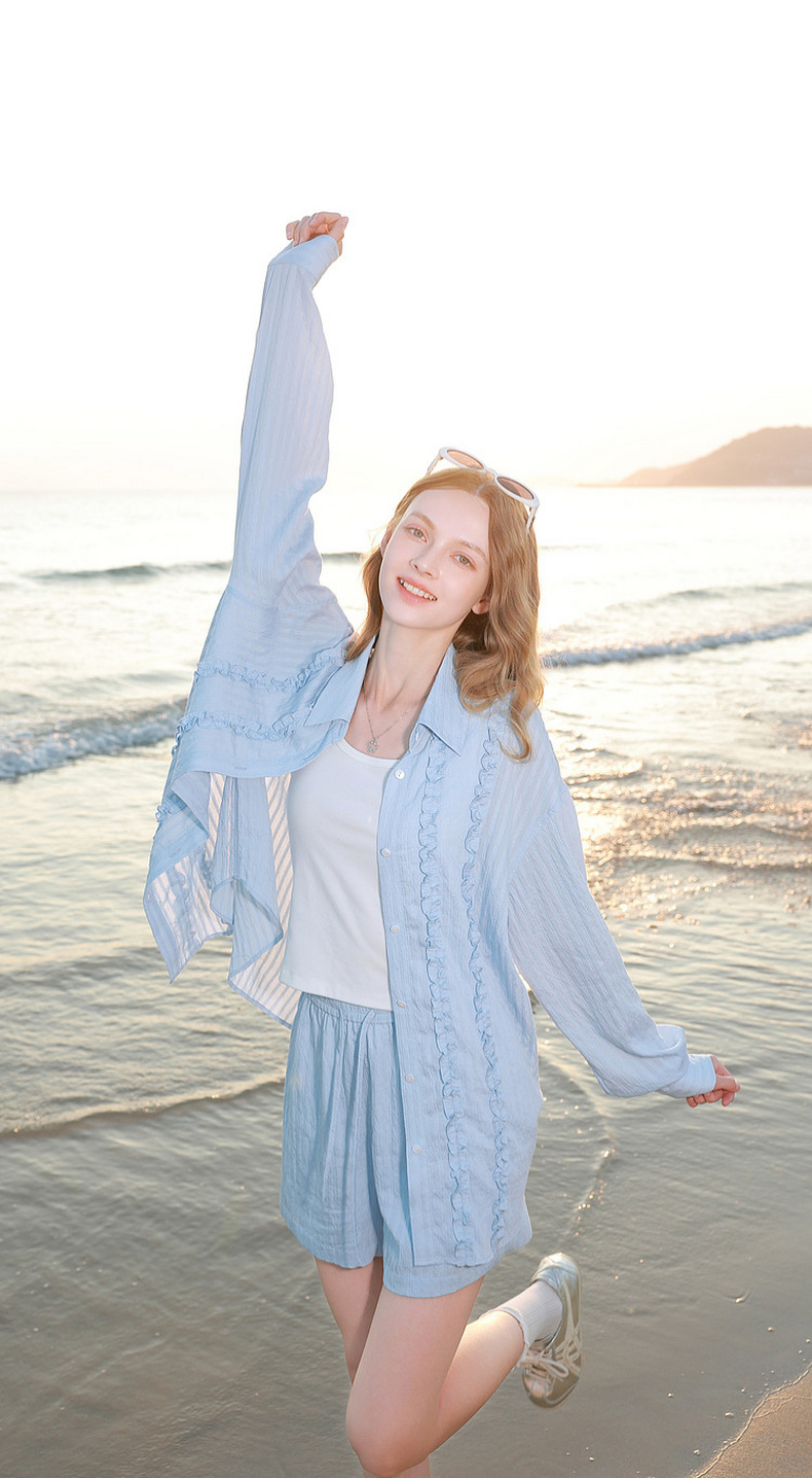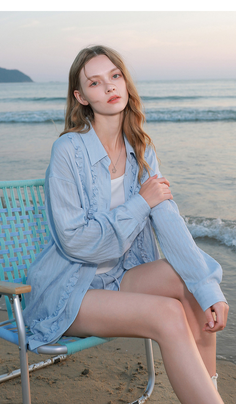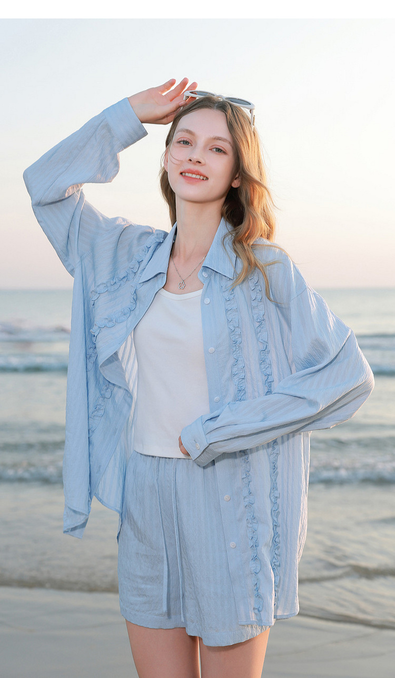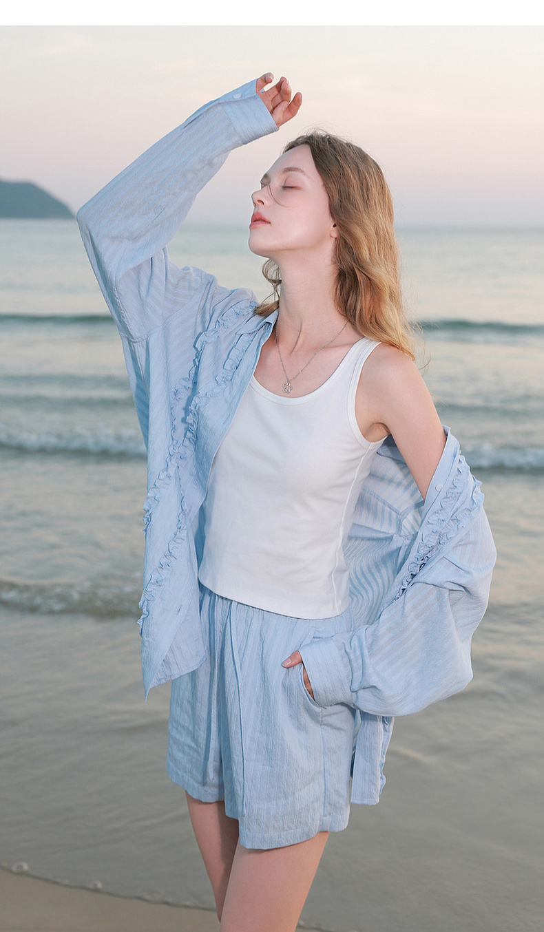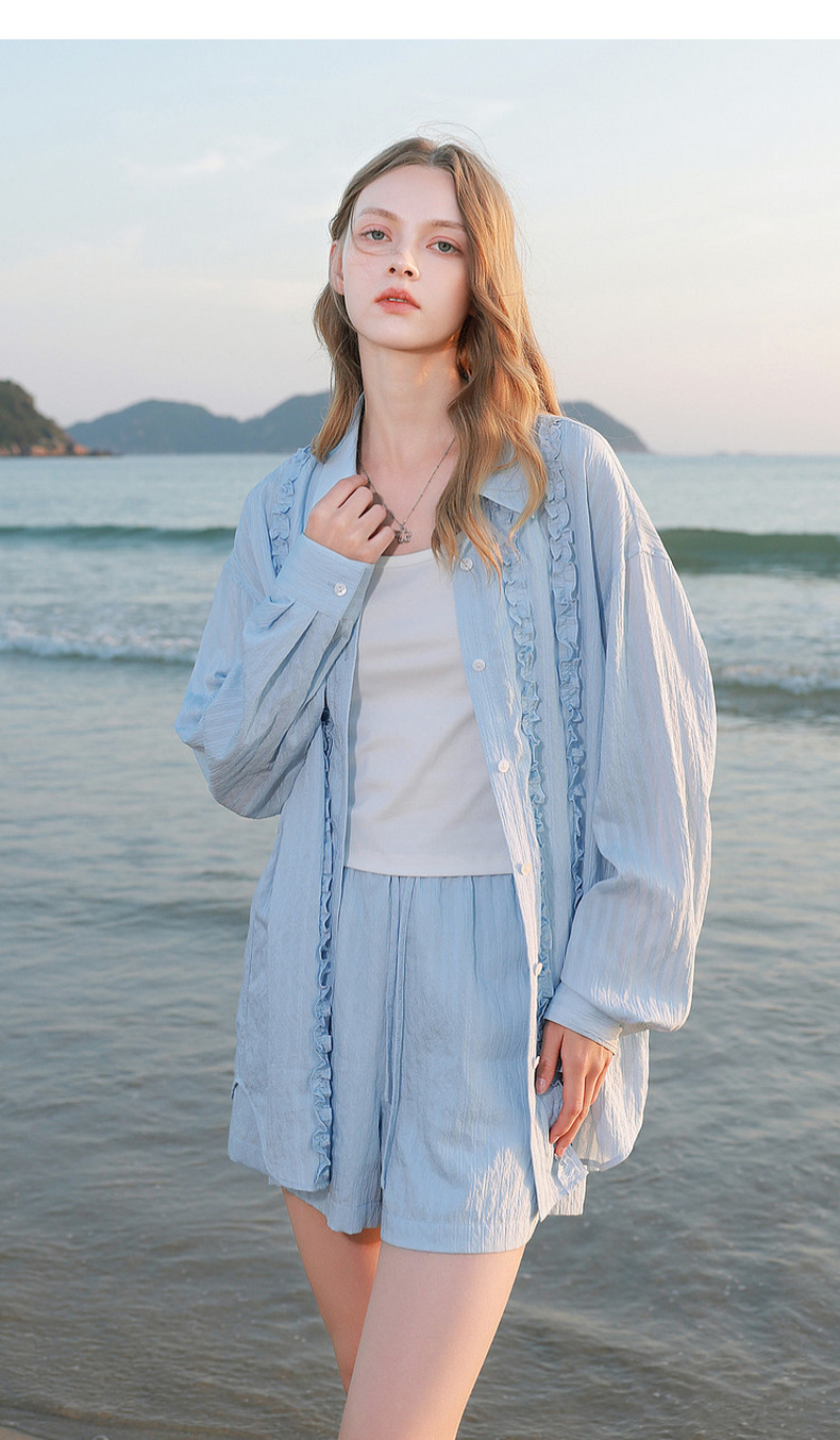 三彩2026夏季新款休闲两件套木耳边衬衫上衣高腰宽松短裤套装M