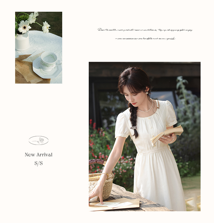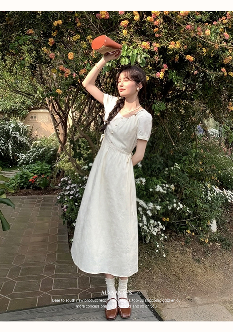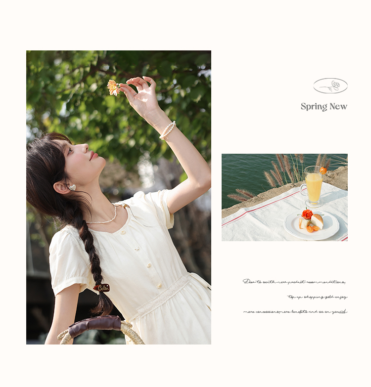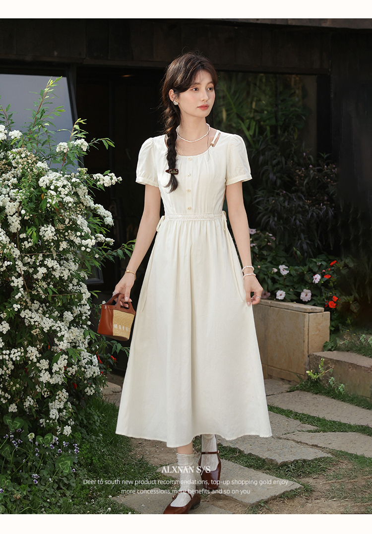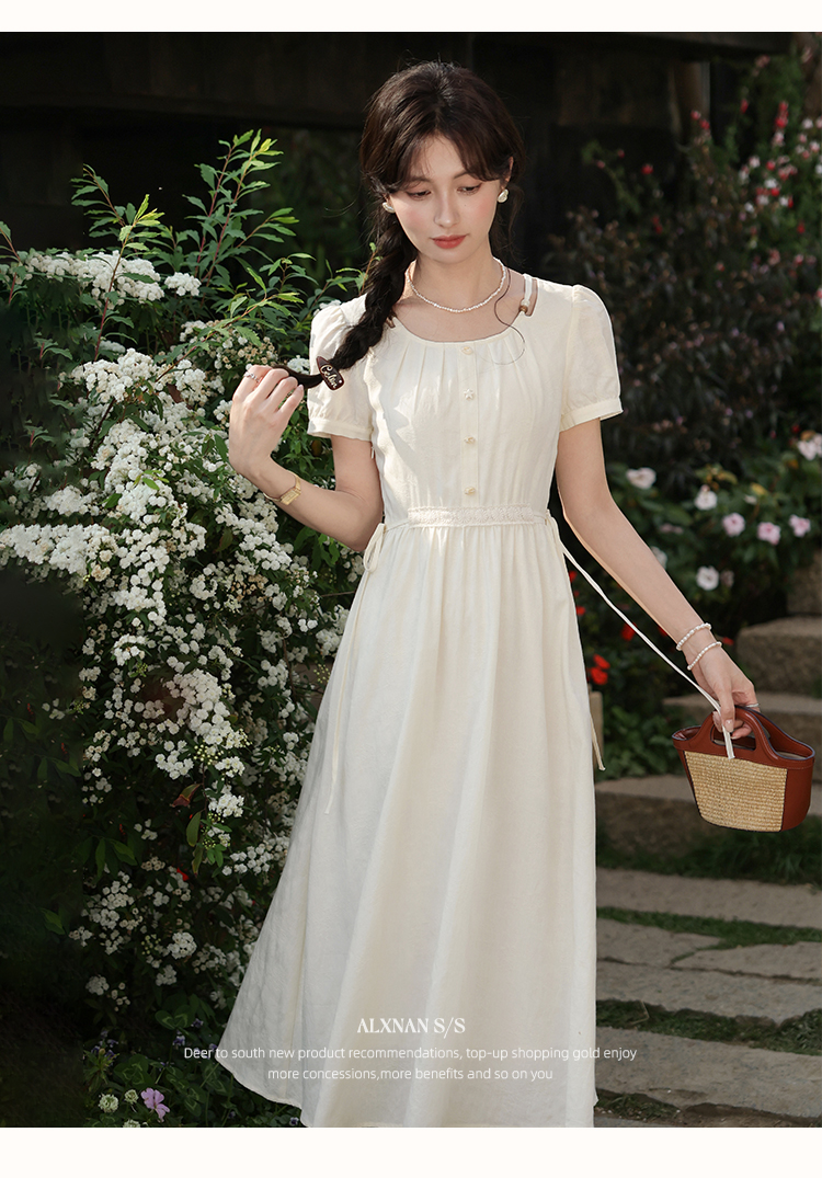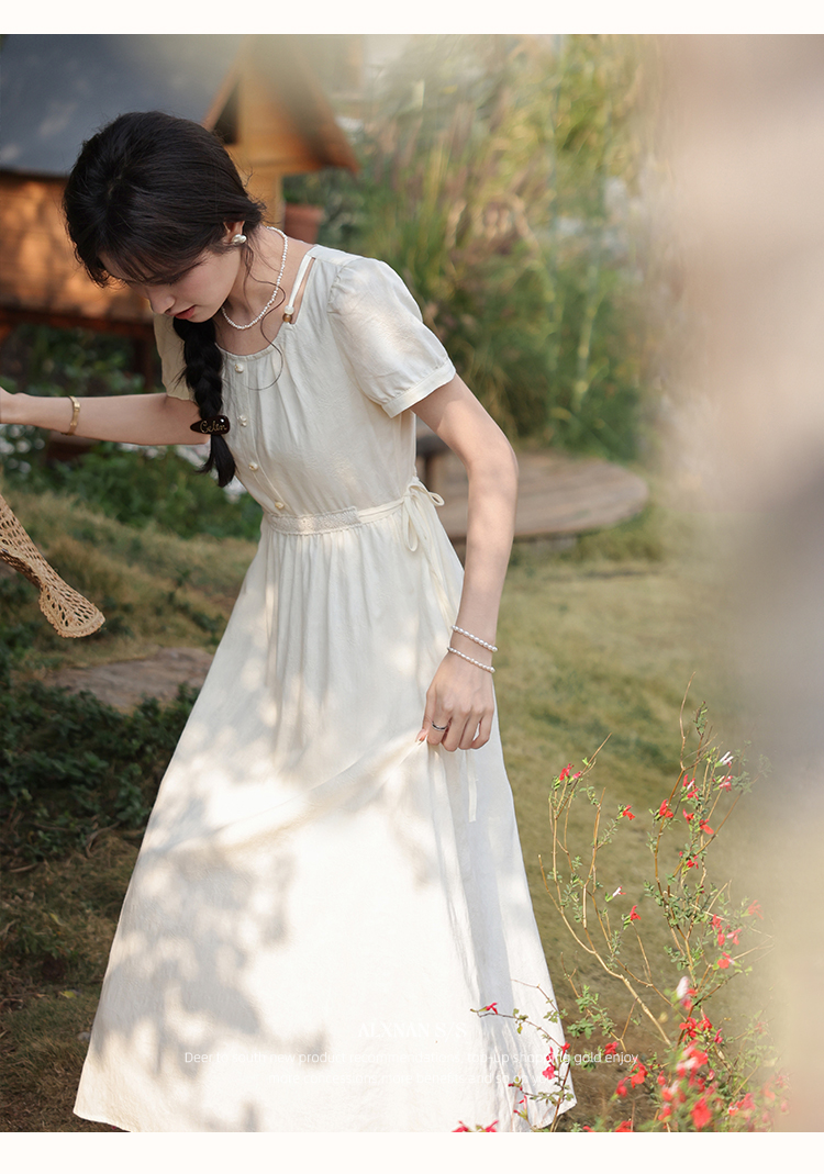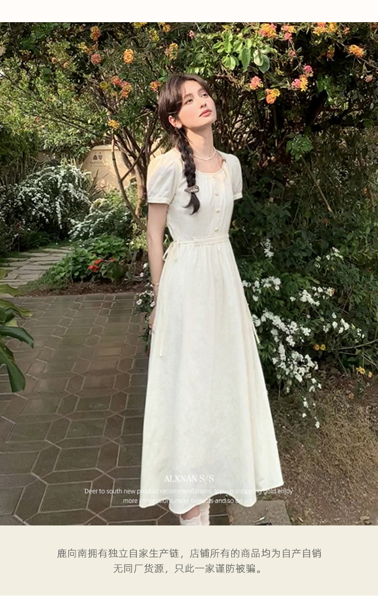 【6折秒杀】鹿向南「海岛白沙」杏色短袖连衣裙女2025年新款设计感松紧腰裙子