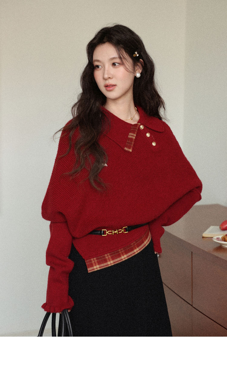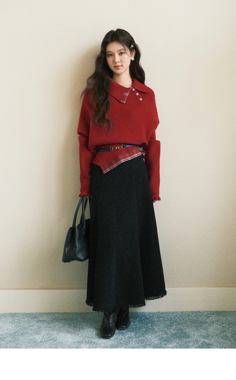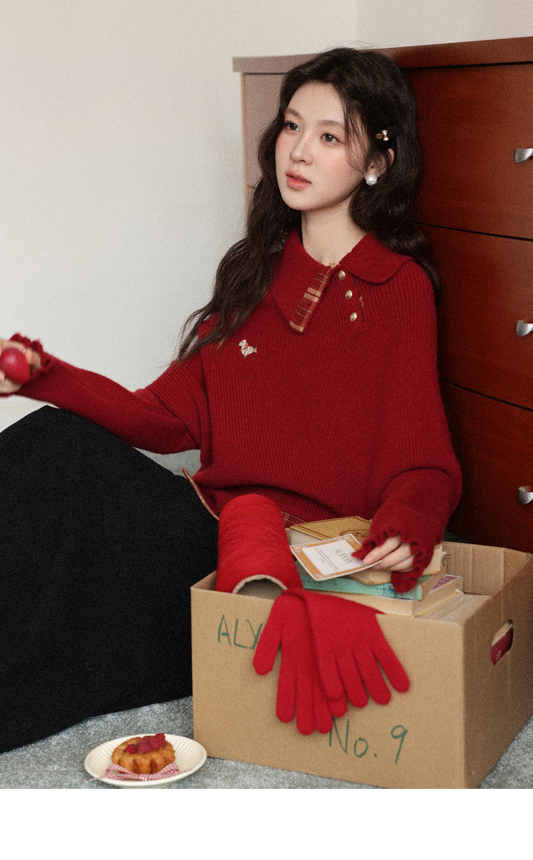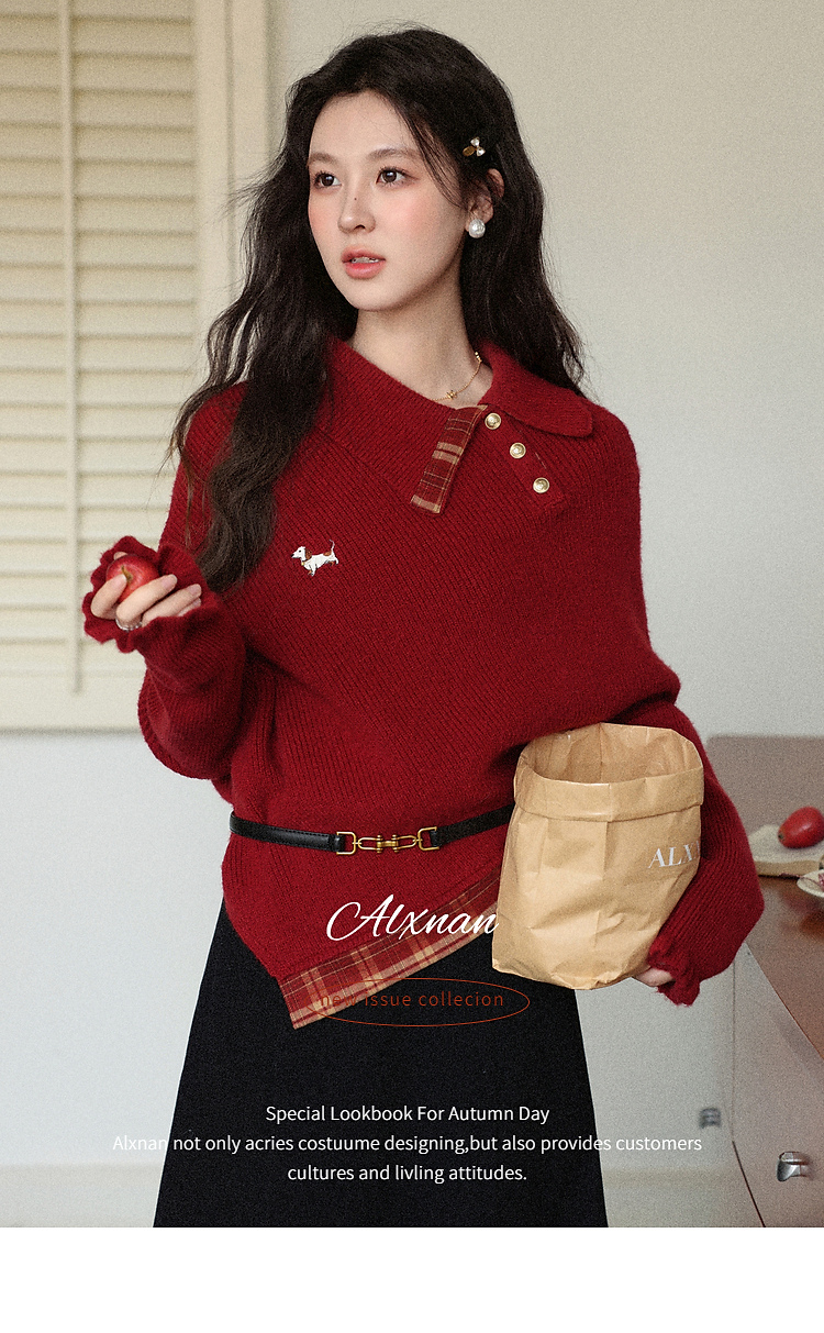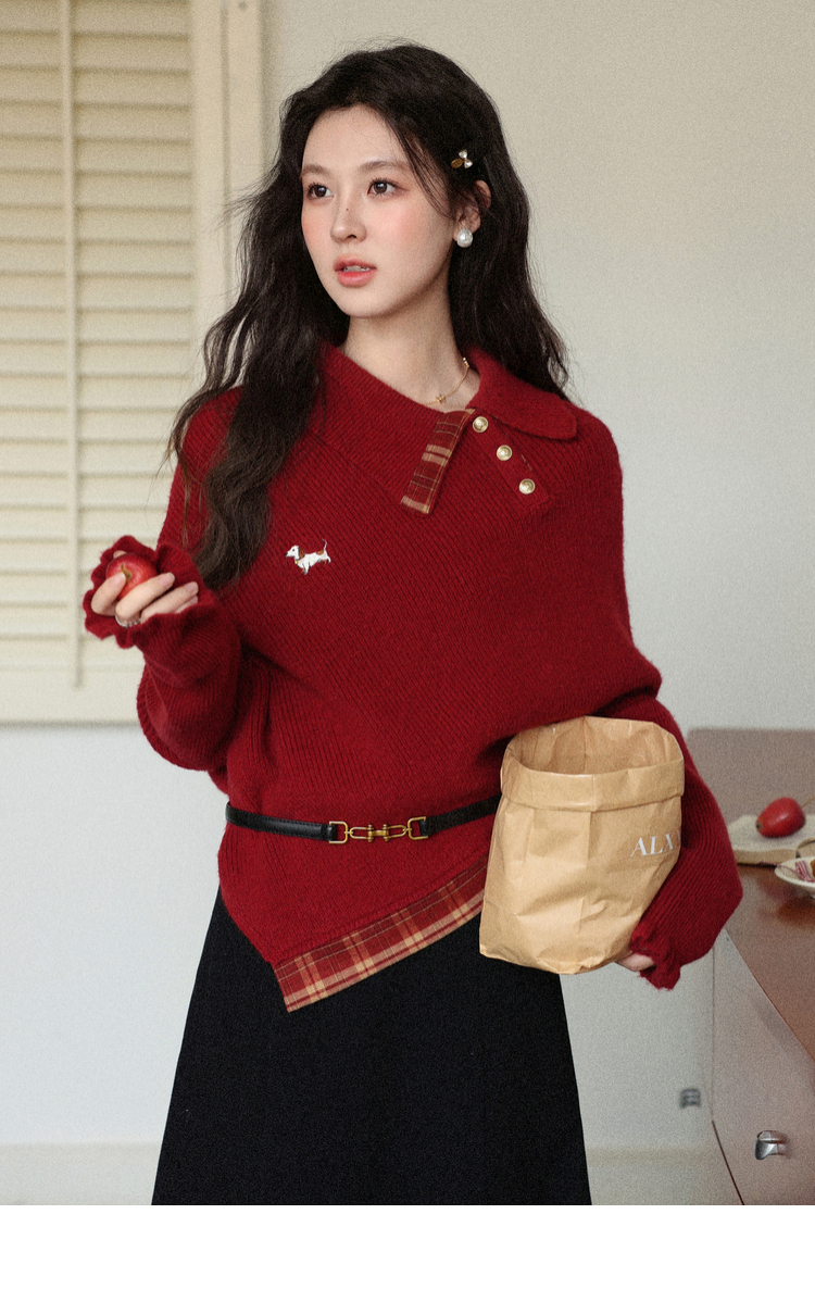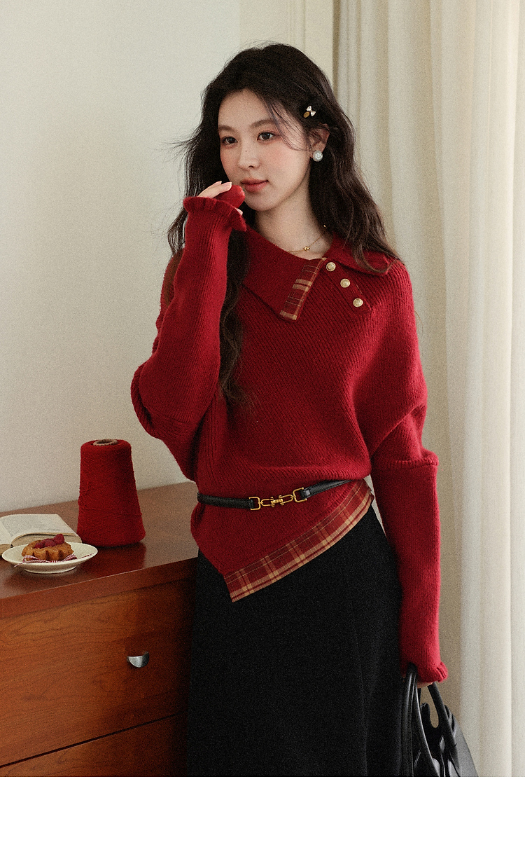 鹿向南「复古格调」设计感红色长袖毛衣女秋冬不规则保暖新款上衣