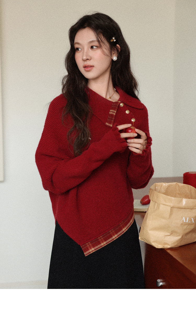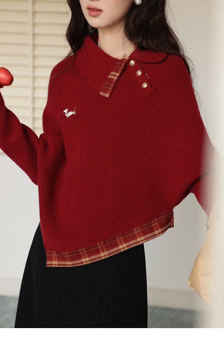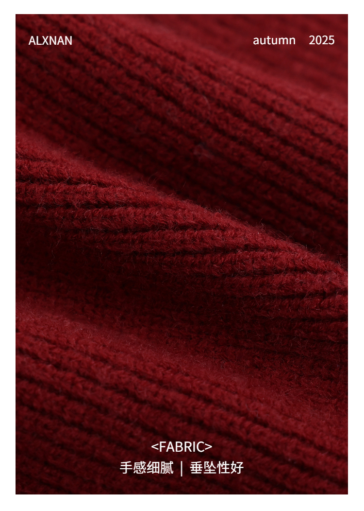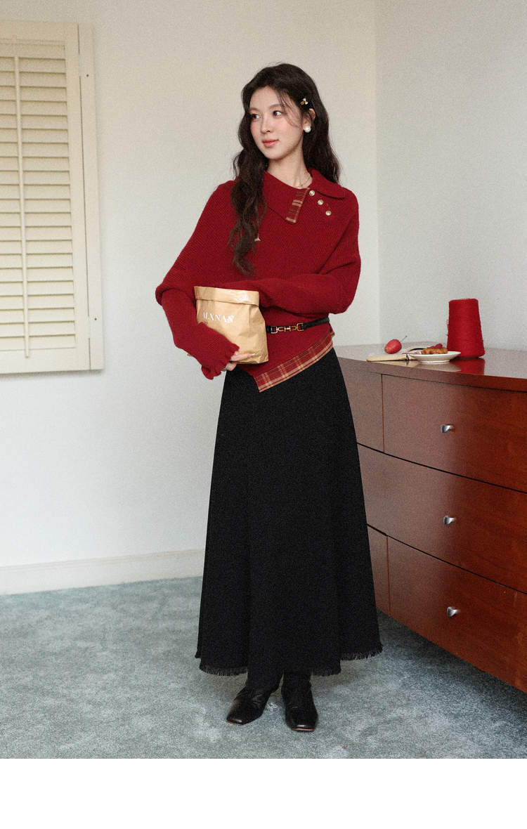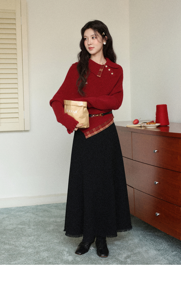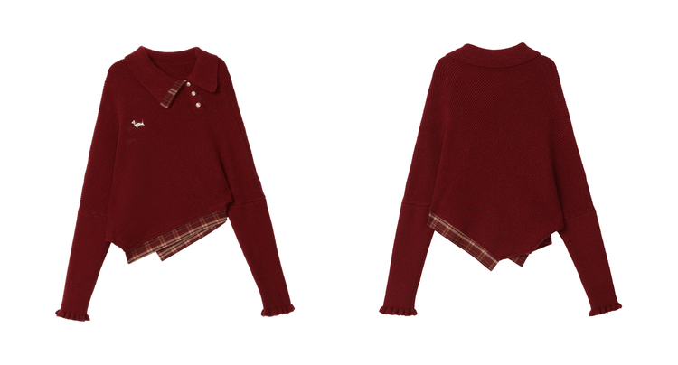 鹿向南「复古格调」设计感红色长袖毛衣女秋冬不规则保暖新款上衣