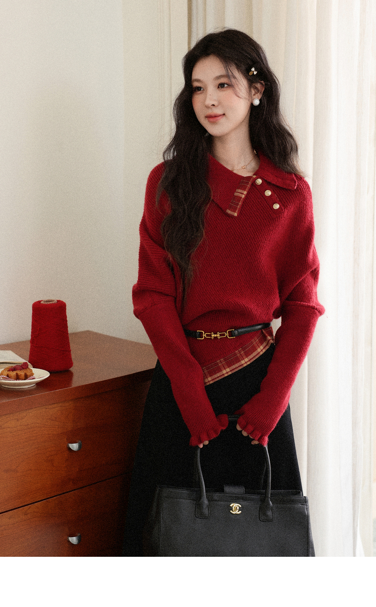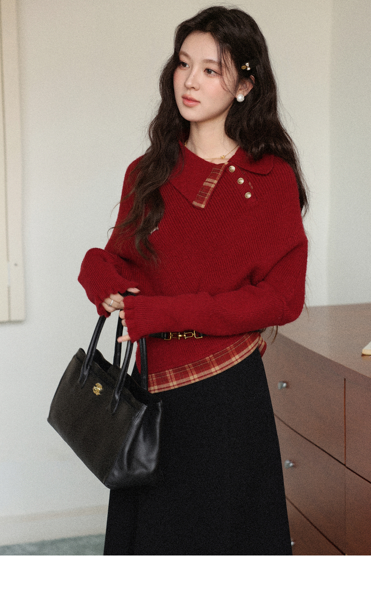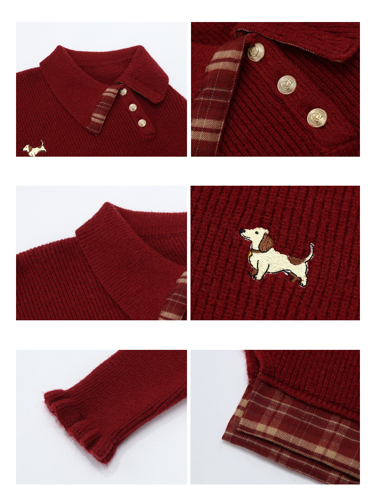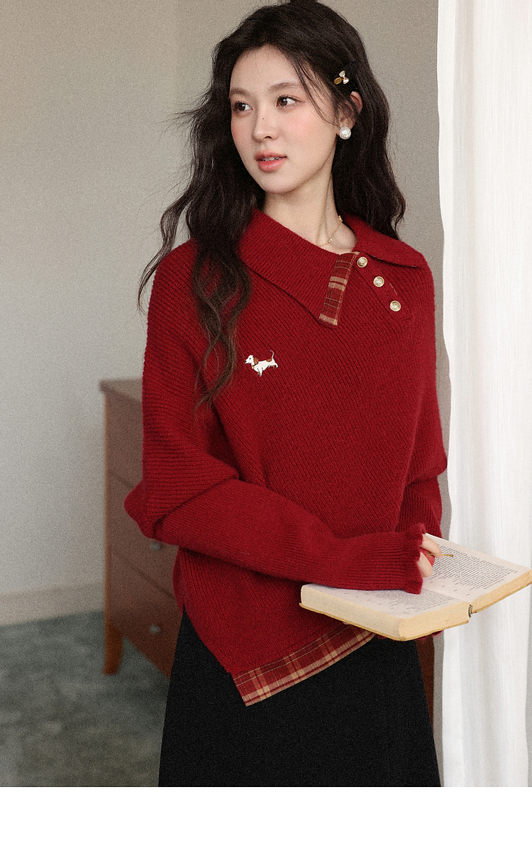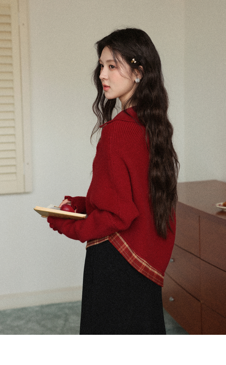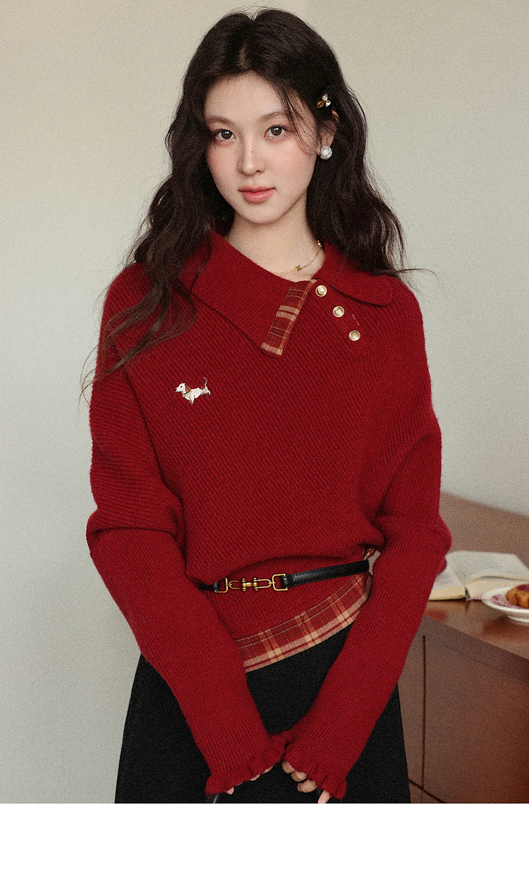 鹿向南「复古格调」设计感红色长袖毛衣女秋冬不规则保暖新款上衣