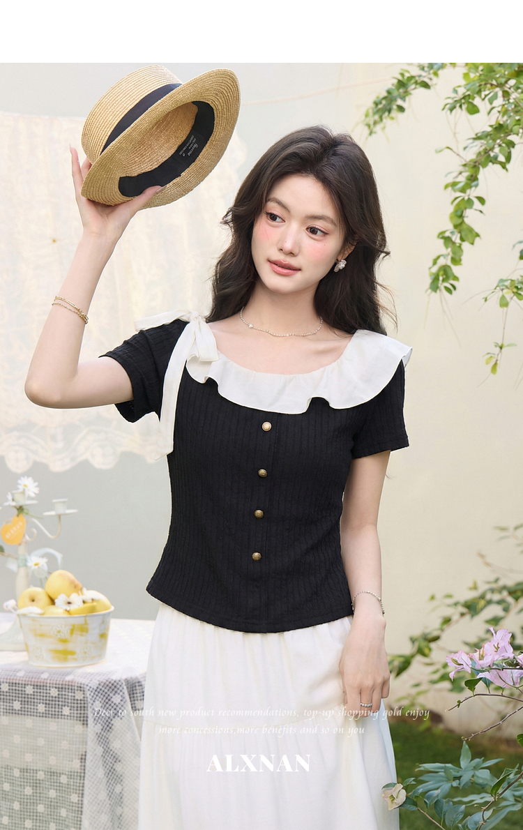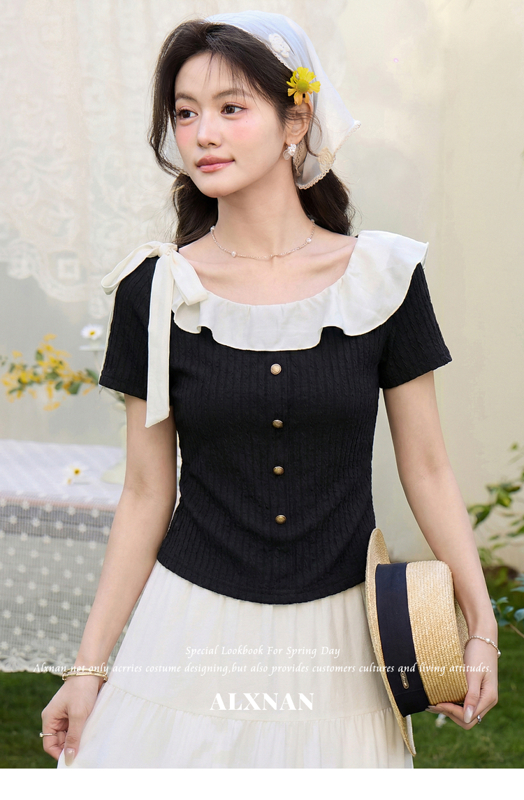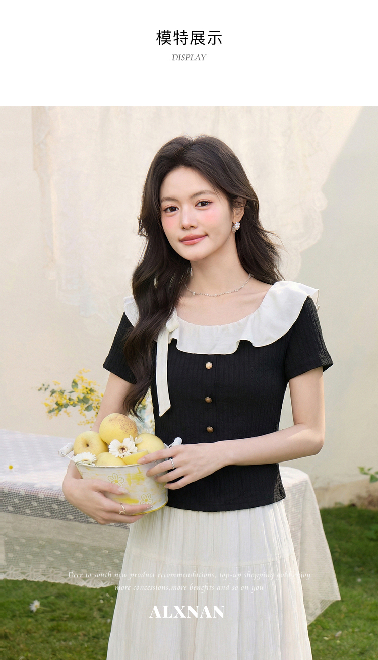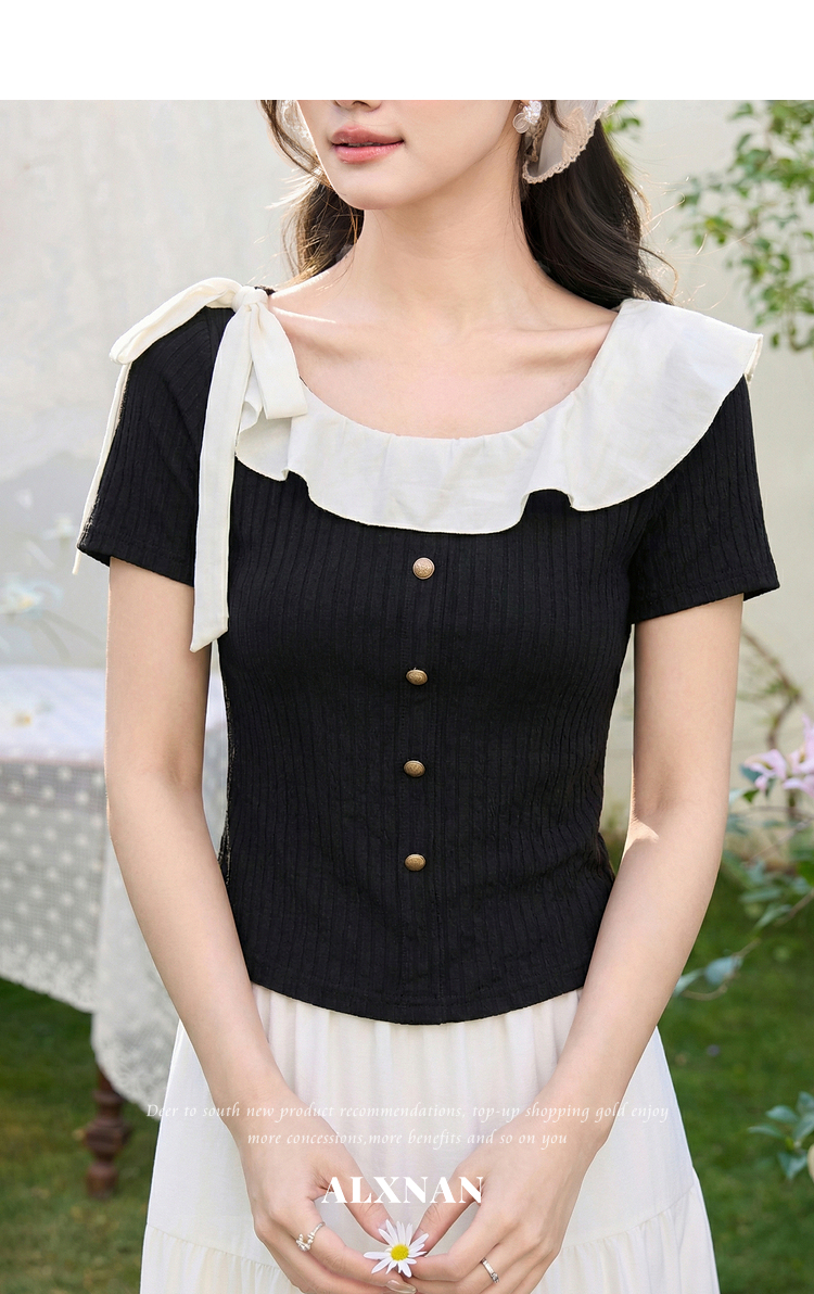 鹿向南「黑巧甜心」黑色短袖T恤女春新款时尚拼接设计感修身上衣