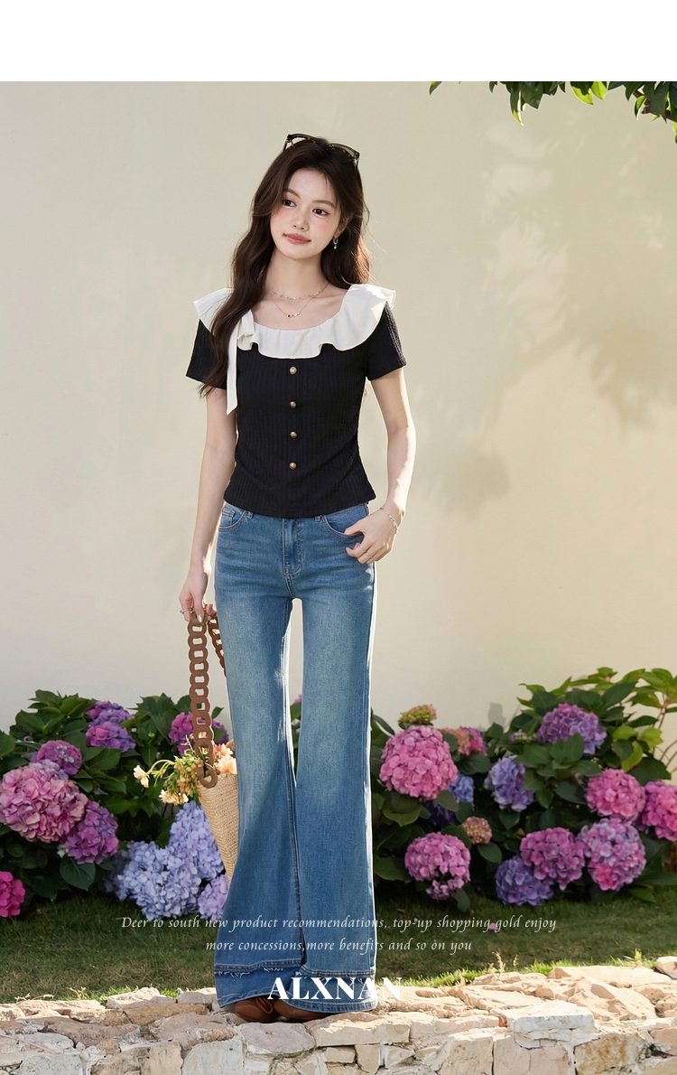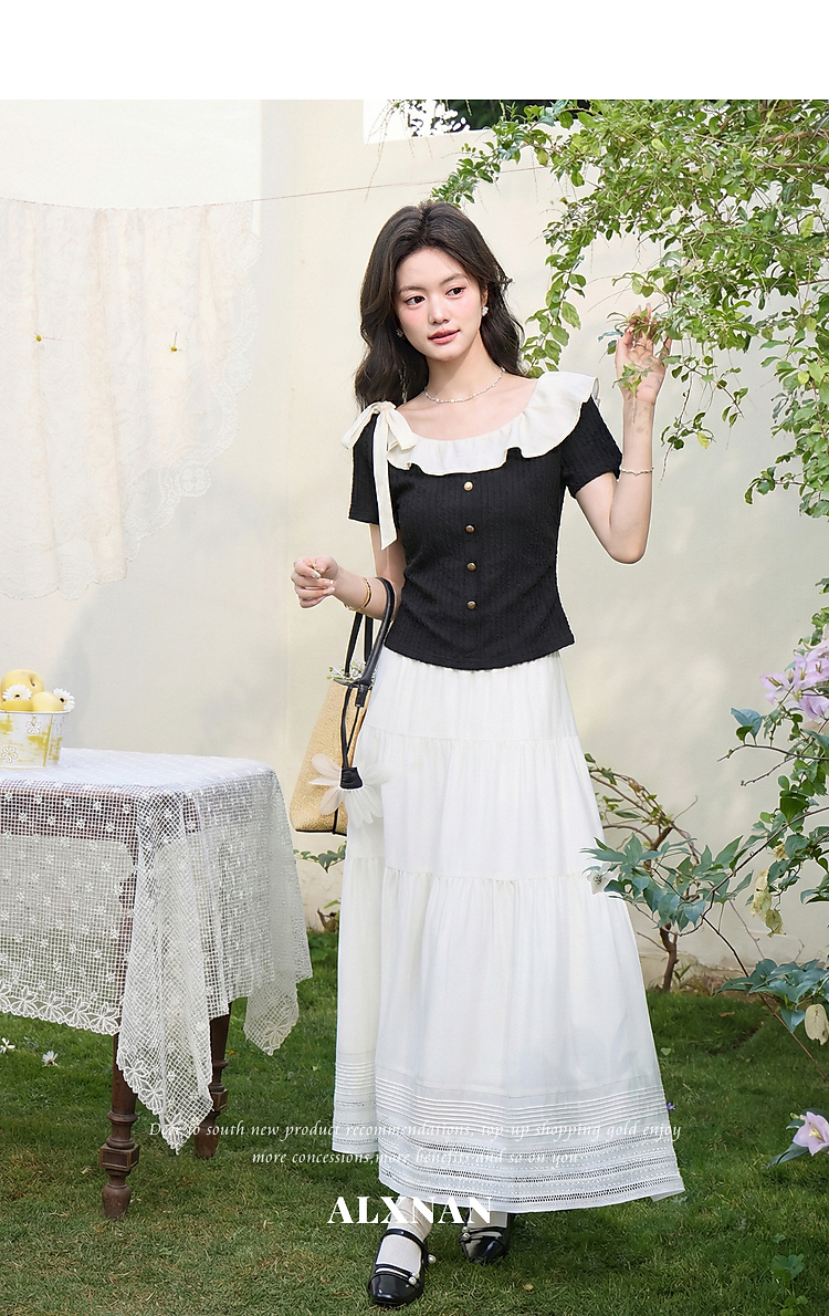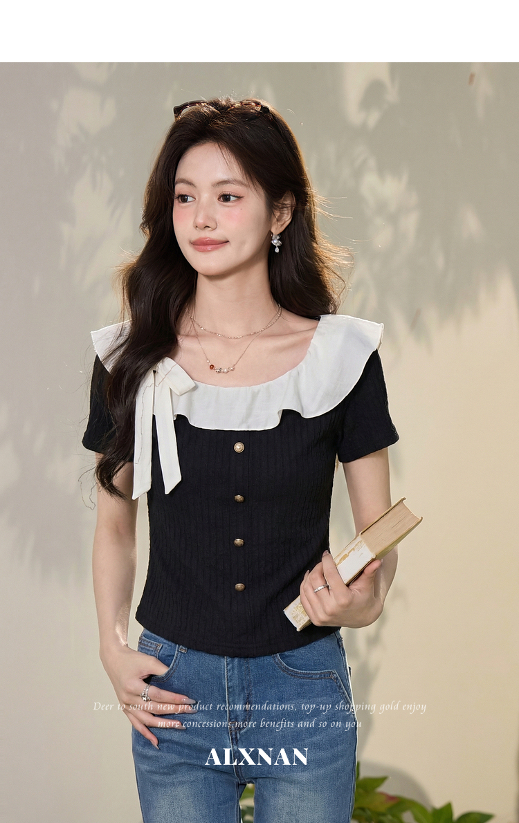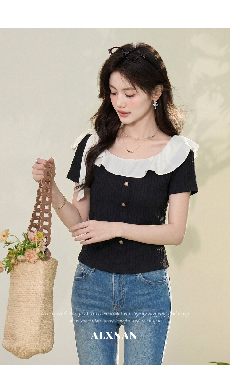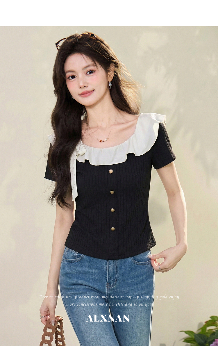 鹿向南「黑巧甜心」黑色短袖T恤女春新款时尚拼接设计感修身上衣