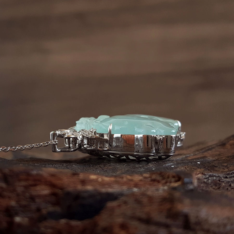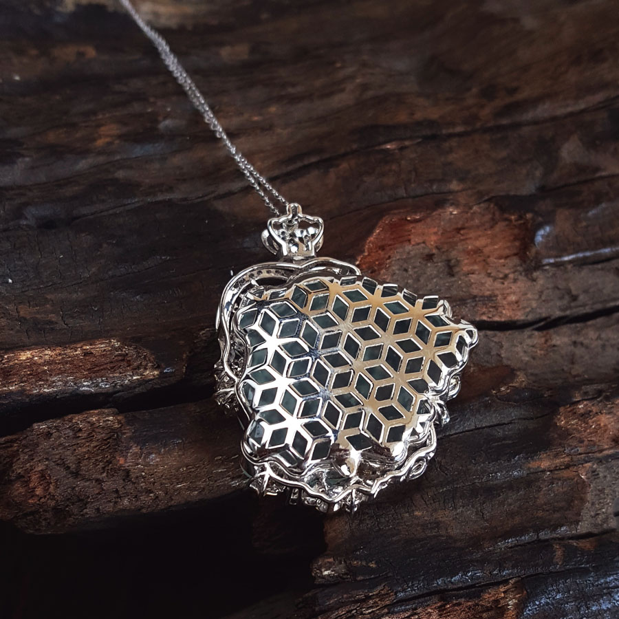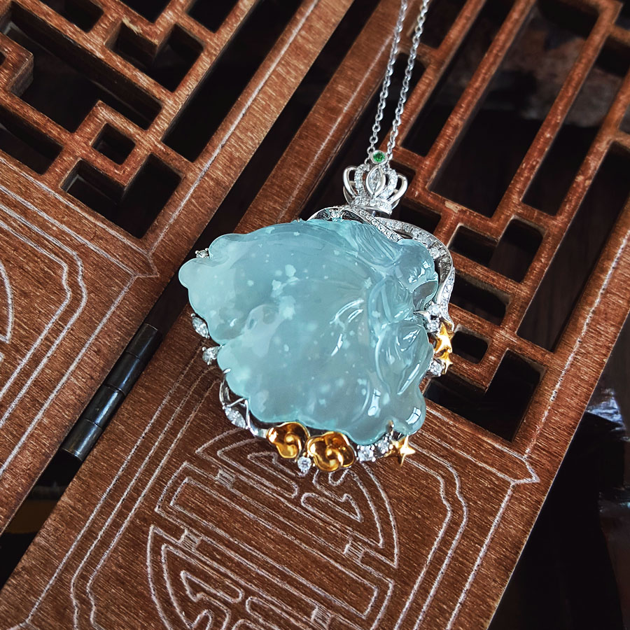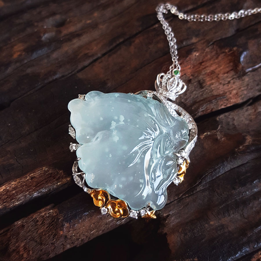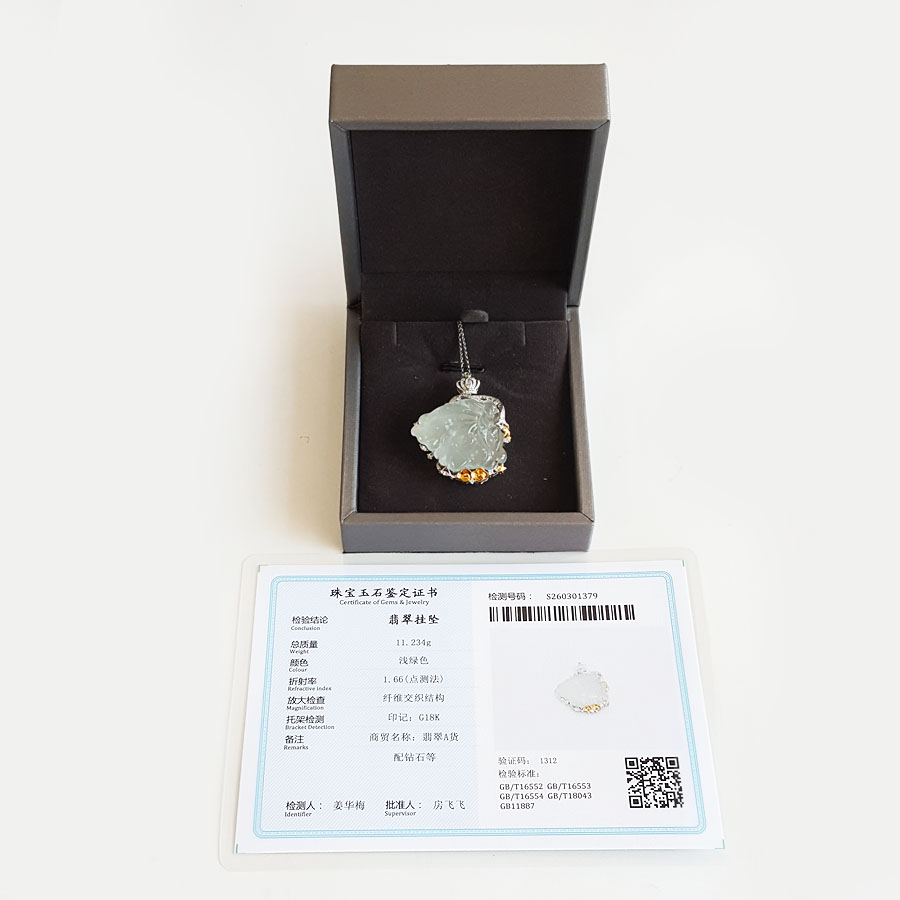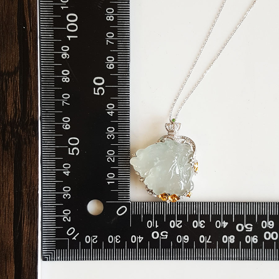 名称 | AU750收藏级双色金镶钻镶天然细腻木那雪花棉高冰种蝴蝶仙子造型翡翠吊坠项链 |