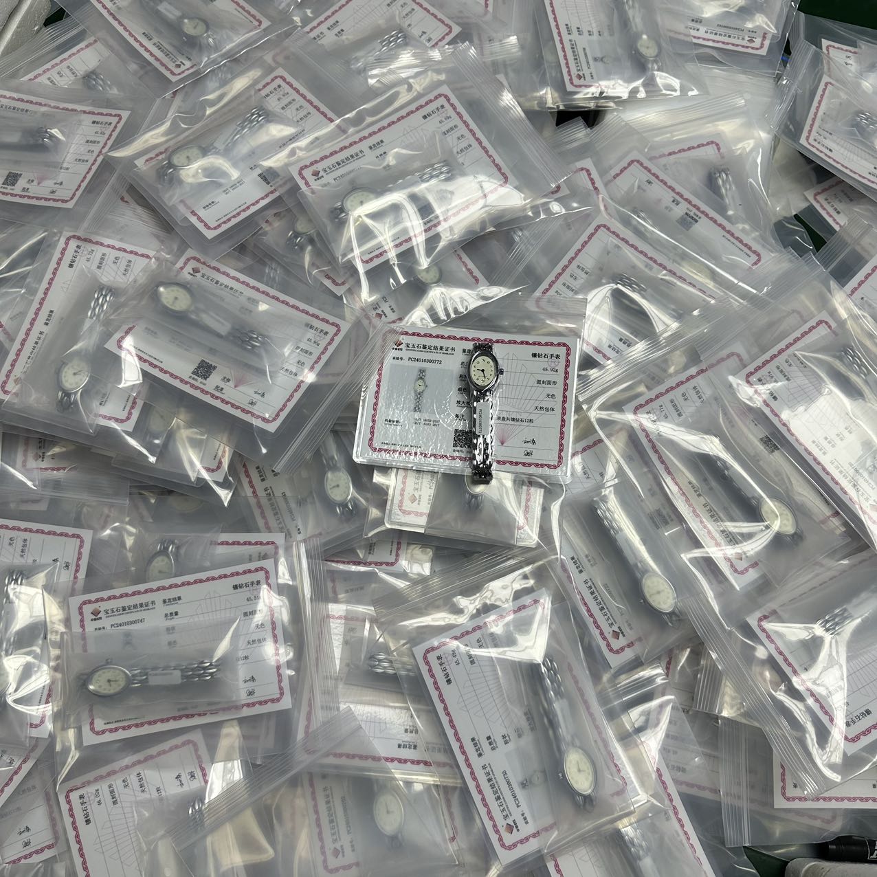 我们再说下钻石,都说钻石恒久远,一颗永流传,我们表盘镶嵌12粒天然真钻,最大1.4mm,小的0.8mm,总共12粒,每个手表都经过国检GTC检测,并配有钻石检测证书,一表一码绝不重复,全网可查,就这价格买手表,单钻石就超级划算了