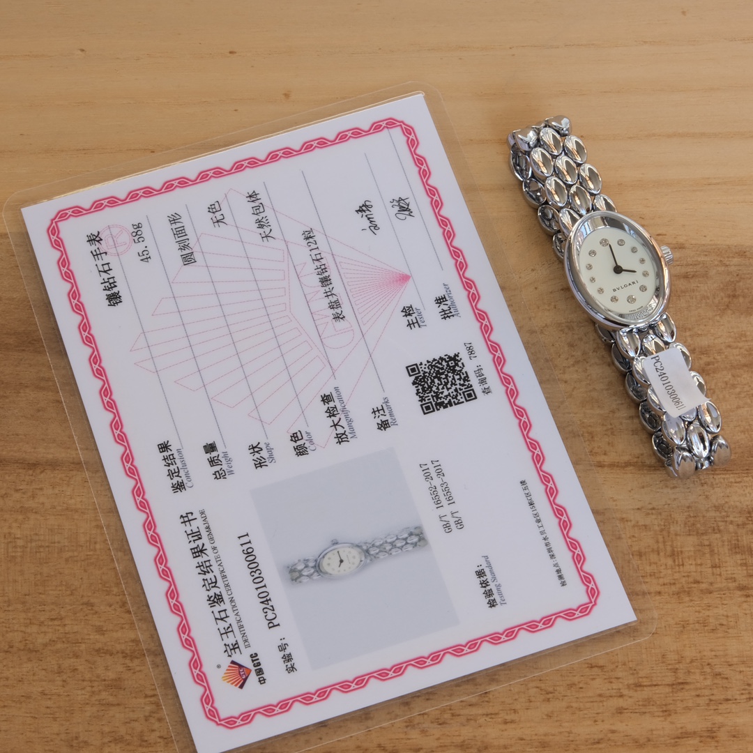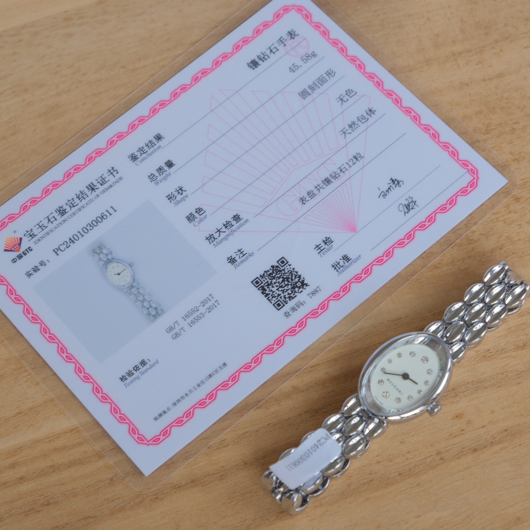 表盘上镶嵌12粒大小不一高低不一的天然真钻,最大的有1.4mm,小的0.8mm,气质奢华典雅,一表一码配省检GTC证书,可全网查询