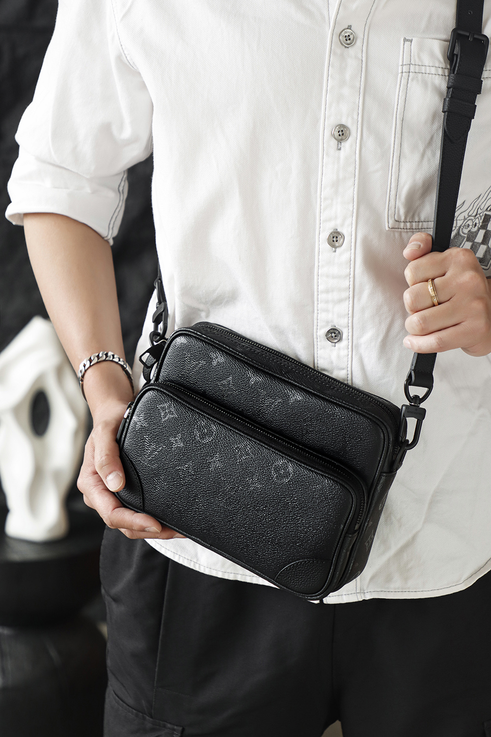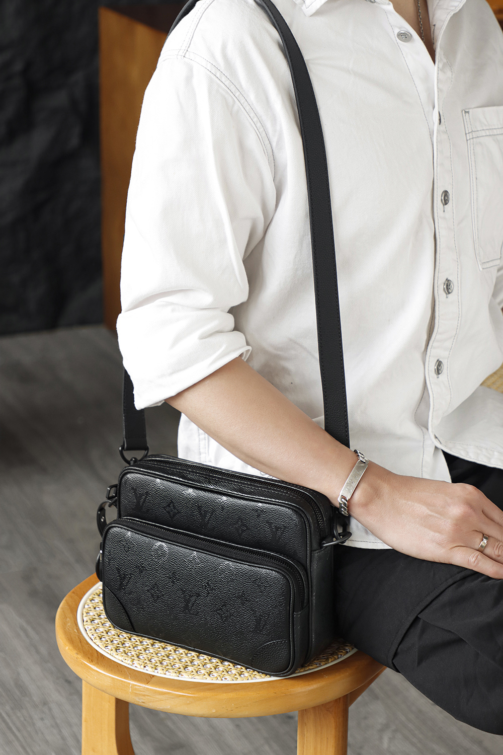 Nil斜挎包午夜黑是男士通勤包的天花板,雅致配色烘托內斂復古構型,拆卸頂部手柄與肩帶提供多樣背攜選擇。