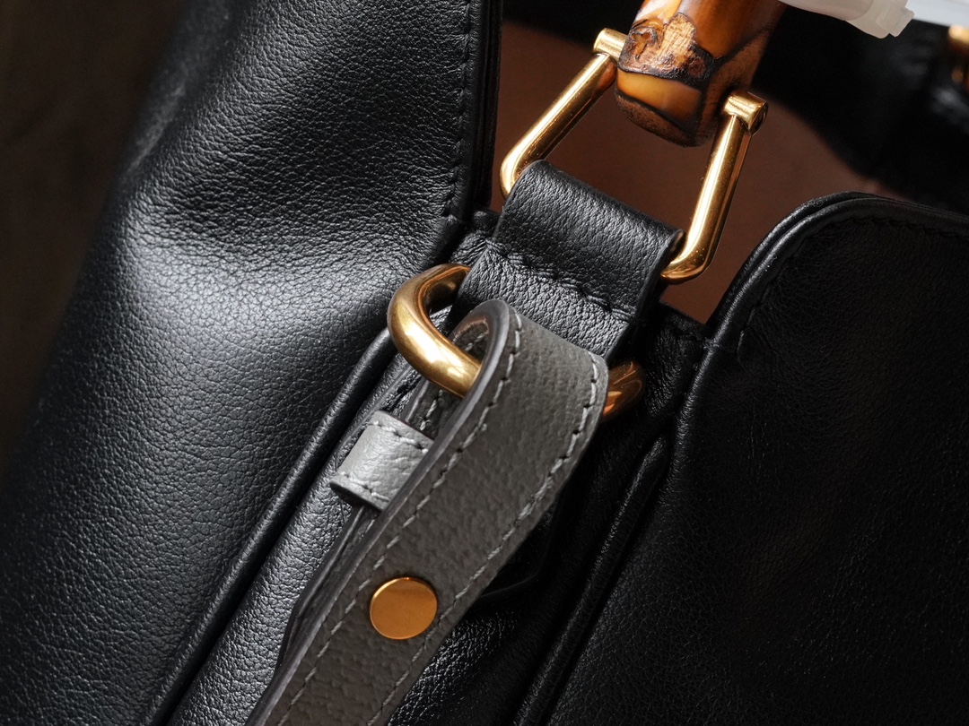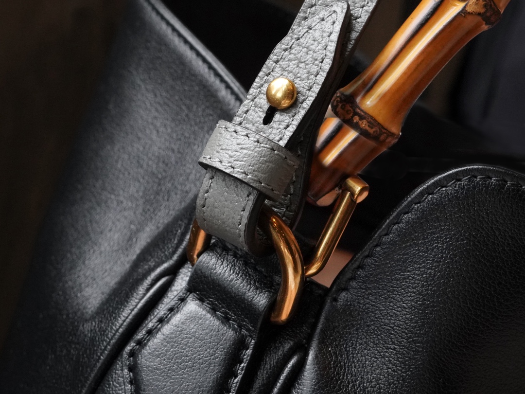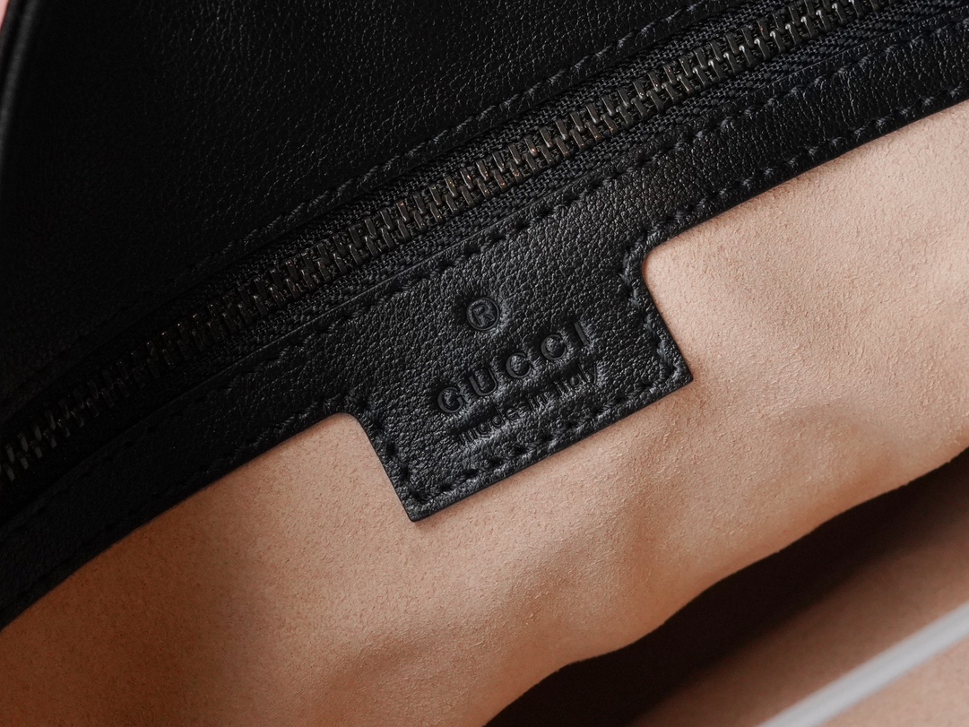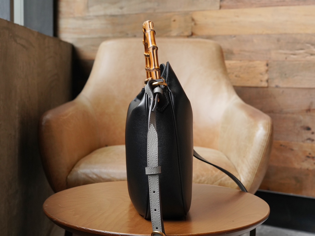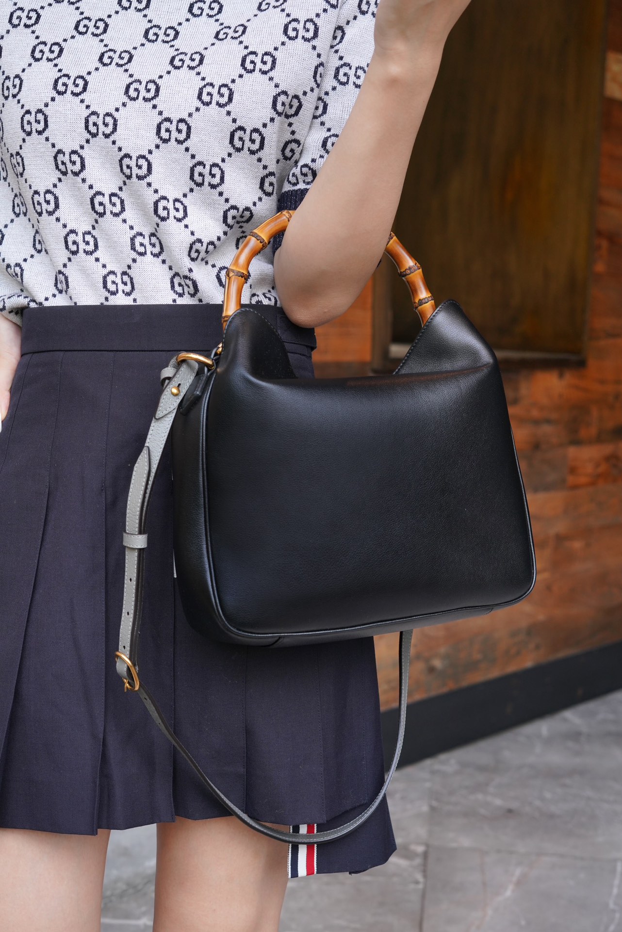 这款中号肩背包巧妙糅合品牌颇具辨识度的两大元素——竹节提手和双G配件,赋予整个造型以独特魅力。这款配饰以黑色皮革匠心打造,配以灰色撞色皮革肩带,令整个设计更加亮眼。