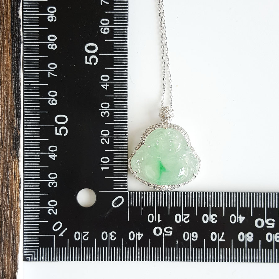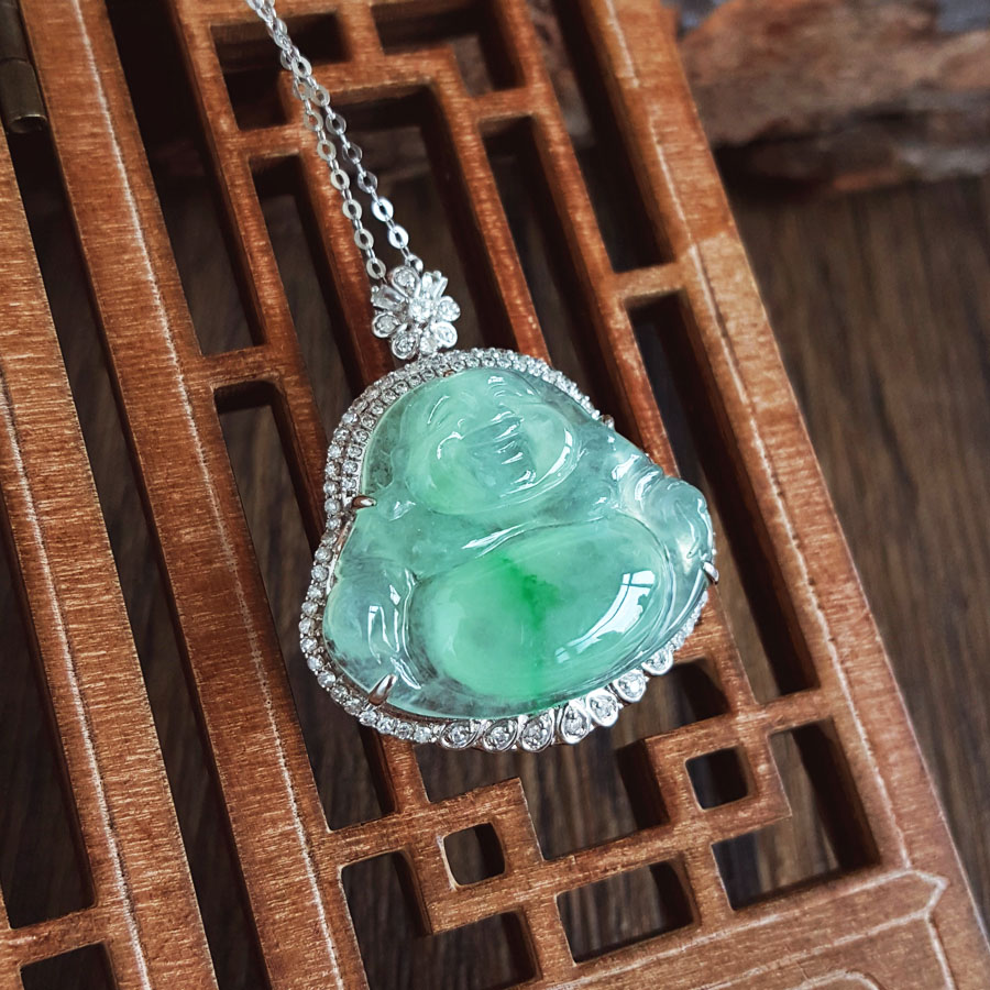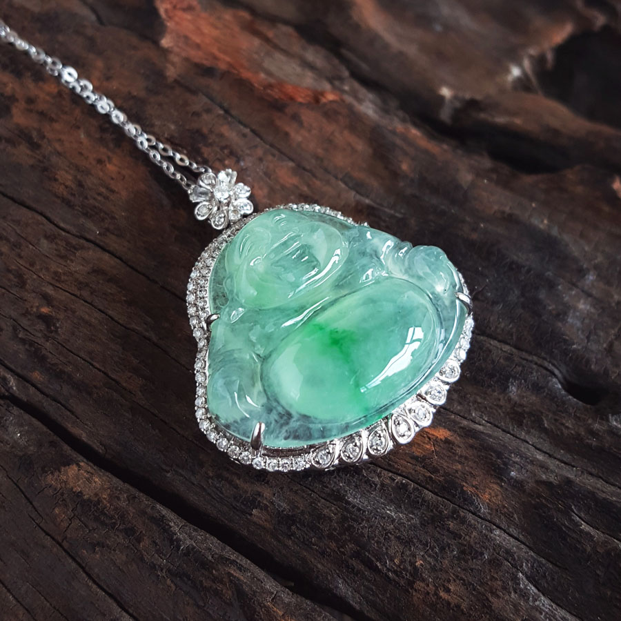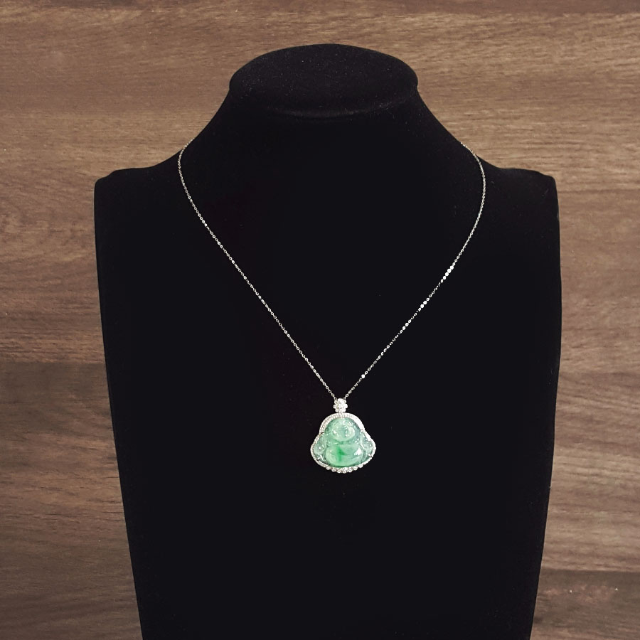 名称 | AU750白金豪镶钻镶天然细腻冰种飘阳绿佛公翡翠吊坠项链 |