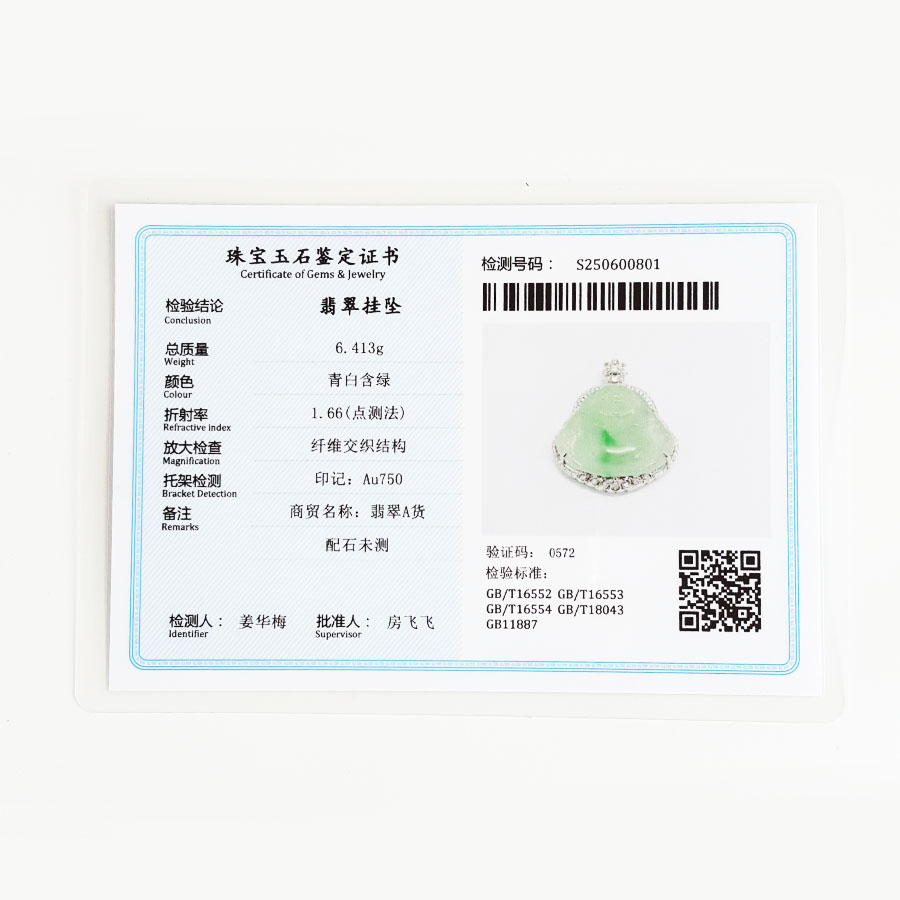 【天然正品】A货翡翠AU750白金豪镶钻镶天然细腻冰种飘阳绿佛公翡翠吊坠项链31.2*27.0*9.7MM(皆取最大值)女士现售价:6880!180625NJ06