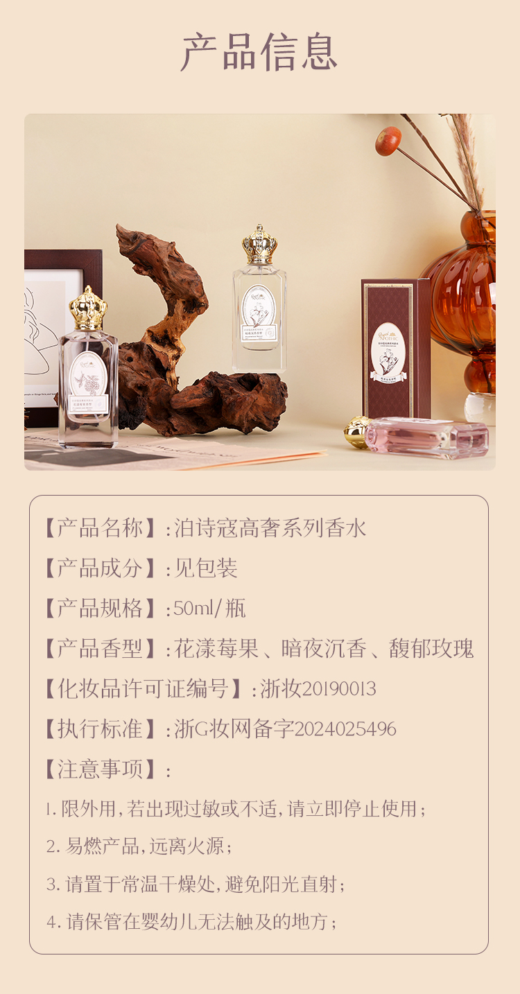 品名:泊诗蔻高奢系列香水 规格:50ml/瓶 发货地:浙江 发货时间:下单一般48小时内发货(周末、节假日除外) 发货快递:中通快递(以实际发货为准,暂不支持指定快递) 运费模板:该商品全国部分地区包邮(宁夏、甘肃、青海、内蒙需补差运费10元/单,新疆需补差运费15元/单,西藏、港澳台不发货,请知悉) 售后政策:本品包装配件完整、未拆封、不影响二次销售支持7天无理由退换货(无运费险),请知悉 |