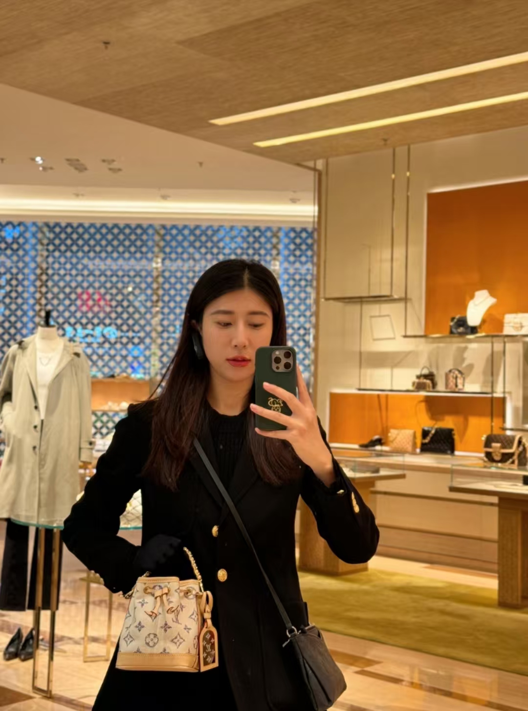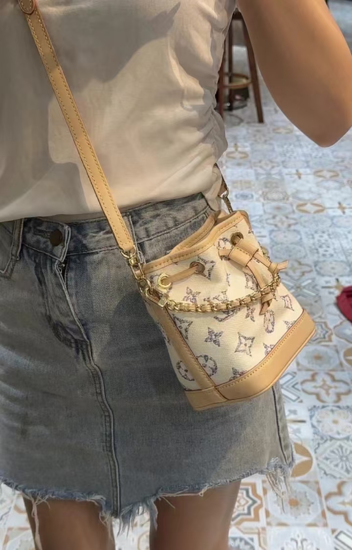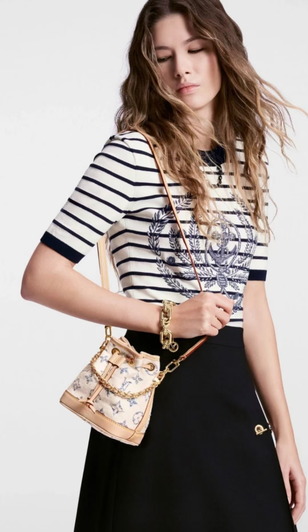 本款 nano noé手袋浓缩 noé 手袋的经典构型,以monogram 提花织物描摹粗花呢肌理,再为底部勾勒皮革饰边。可拆卸系带金属链条充当手柄,抽绳开合和可拆卸并调节的肩带完善细节。尺寸:13x16x10cm