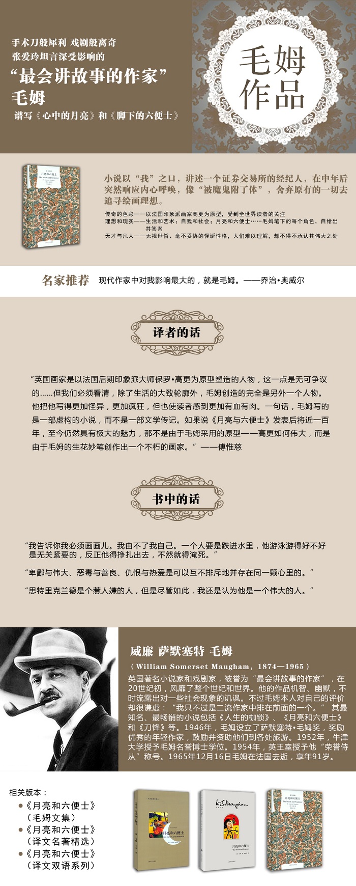 | 《译文经典:月亮和六便士》是毛姆的三大长篇力作之一,完成于1919年。毛姆,一个出生于法国的英国人,他是以戏剧成名的小说家,也是一个拥有博士学位的骑士,他在20世纪初,风靡了整个世纪和世界。他的这部小说问世后,以情节入胜、文字深刻在文坛轰动一时,人们争相传看。在这部小说里,毛姆用一人称的叙述手法,借“我”之口,叙述了整个故事,有人认为这篇小说的原型是法国印象派画家高更,这更增加了它的传奇色彩,受到了全世界读者的关注。 《译文经典:月亮和六便士》中讲述了主人公原是位证券经纪人,人届中年后突然响应内心的呼唤,合弃一切到南太平洋的塔希提岛与土著人一起生活,获得灵感,创作出许多艺术杰作。毛姆在小说中深入探讨了生活和艺术两者的矛盾和相互作用 |