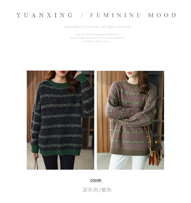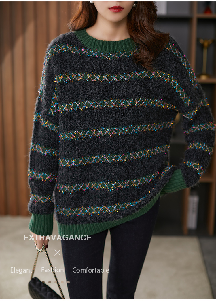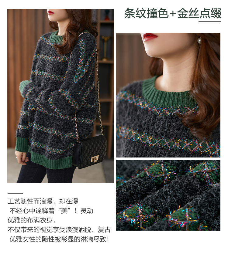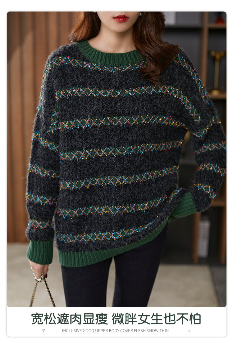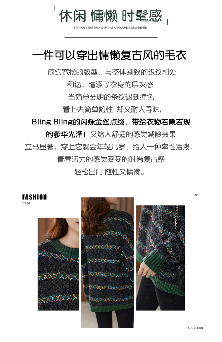 宽松毛衣女套头慵懒2023春秋新款时尚彩线条纹针织打底衫外穿