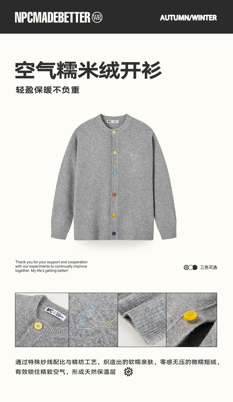 NPC潮牌胸口刺绣【空气糯米绒】针织开衫彩虹植绒扣秋冬男NP5CSW06