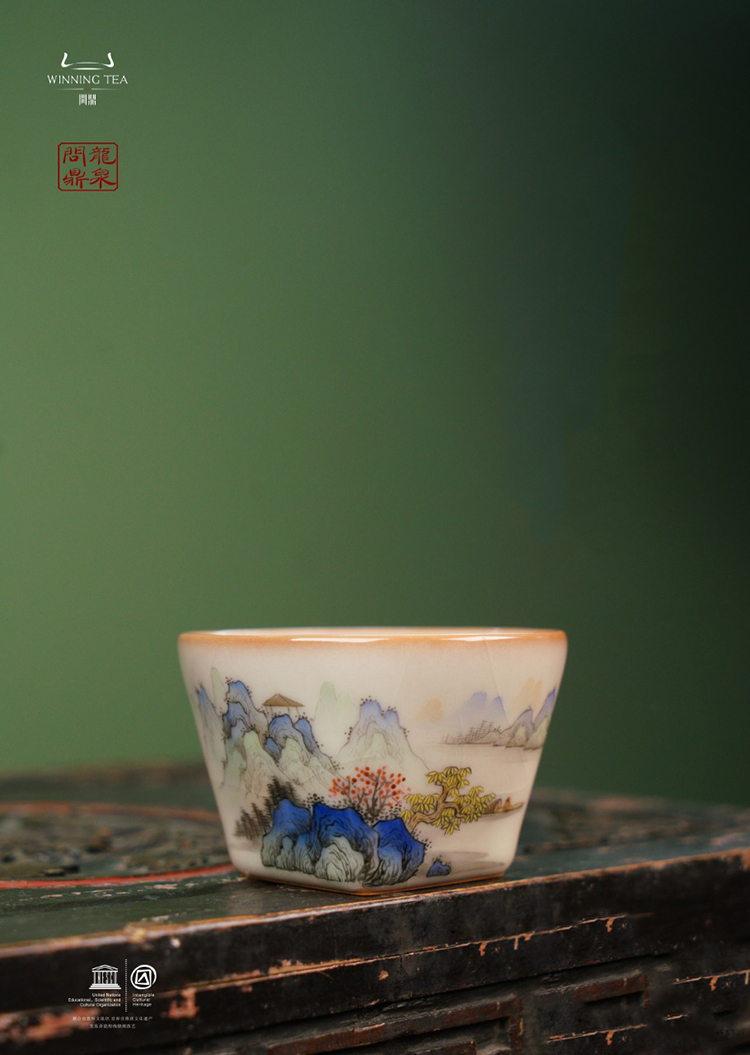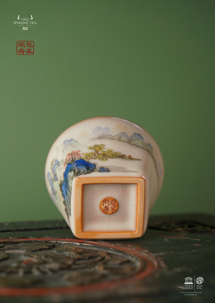 龙泉问鼎彩绘哥窑持照杯(青绿山水)(缺货)