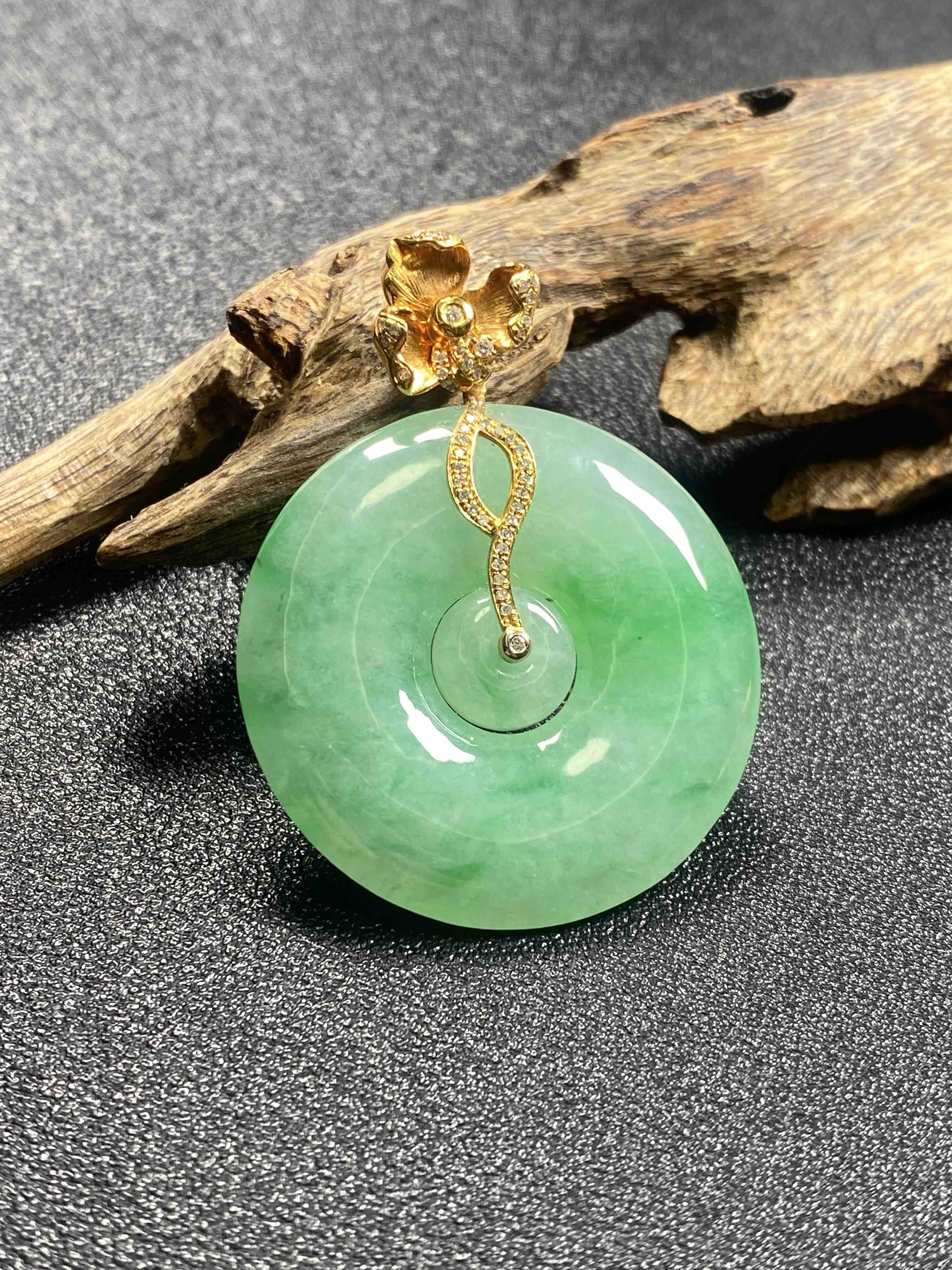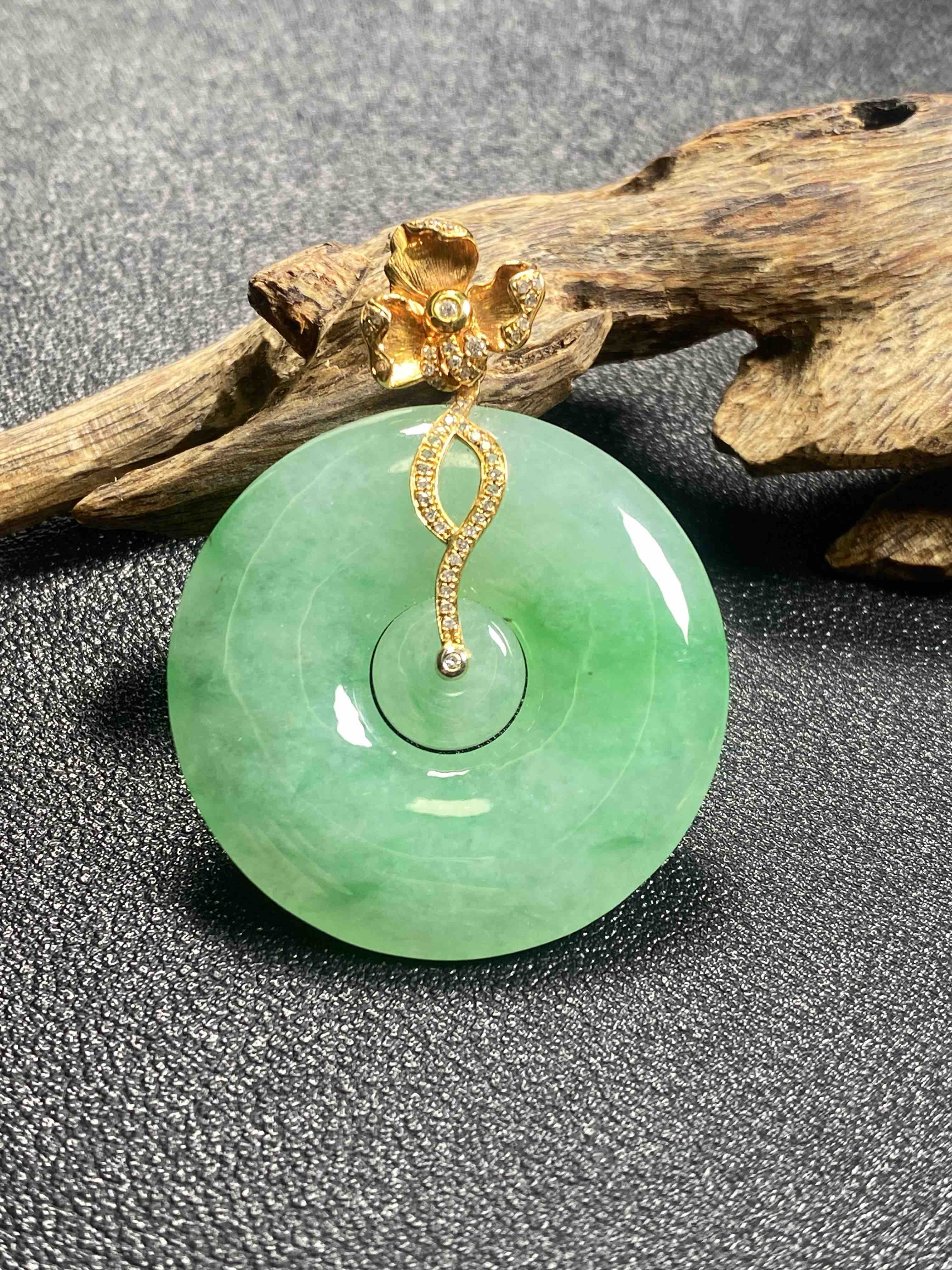 【FC0112】18K镶嵌翡翠冰飘绿平安扣吊坠 玉质温润 飘花灵动 美观大气