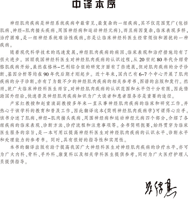 译者:卢家红,医学博士,复旦大学医学院附属华山医院神经内科教授,硕士生导师,中华医学会神经病学分会委员,神经肌病学组委员兼秘书。长期从事神经内科临床工作,擅长神经肌病和神经免疫病的诊治,参与《实用神经病学》、《实用内科学》部分章节的编写,并负责《默克诊疗手册》神经病学部分的翻译。赵重波,医学博士,复旦大学院附属华山医院神经内科副教授,硕士生导师,中华医学会神经病学分会神经肌病学组委员,上海医学会神经内科专科委员会神经肌病组委员,一直从事神经免疫疾病和肌病的临床工作,参与《现代内科学》、《实用内科学》、《神经病学》等著作的编写,主编《神经内科病例分析——入门与提高》。