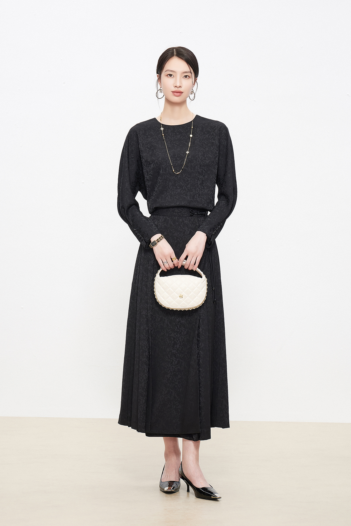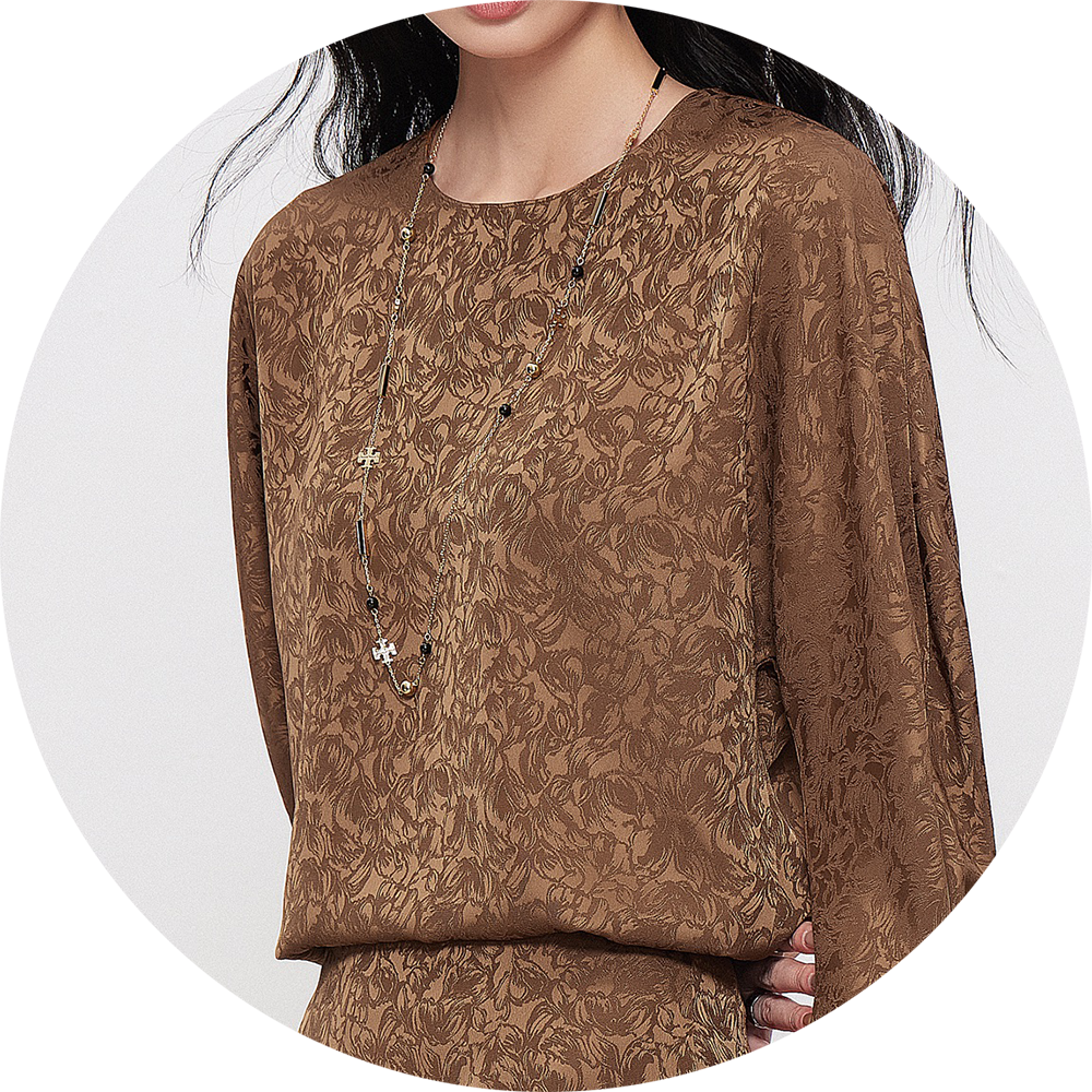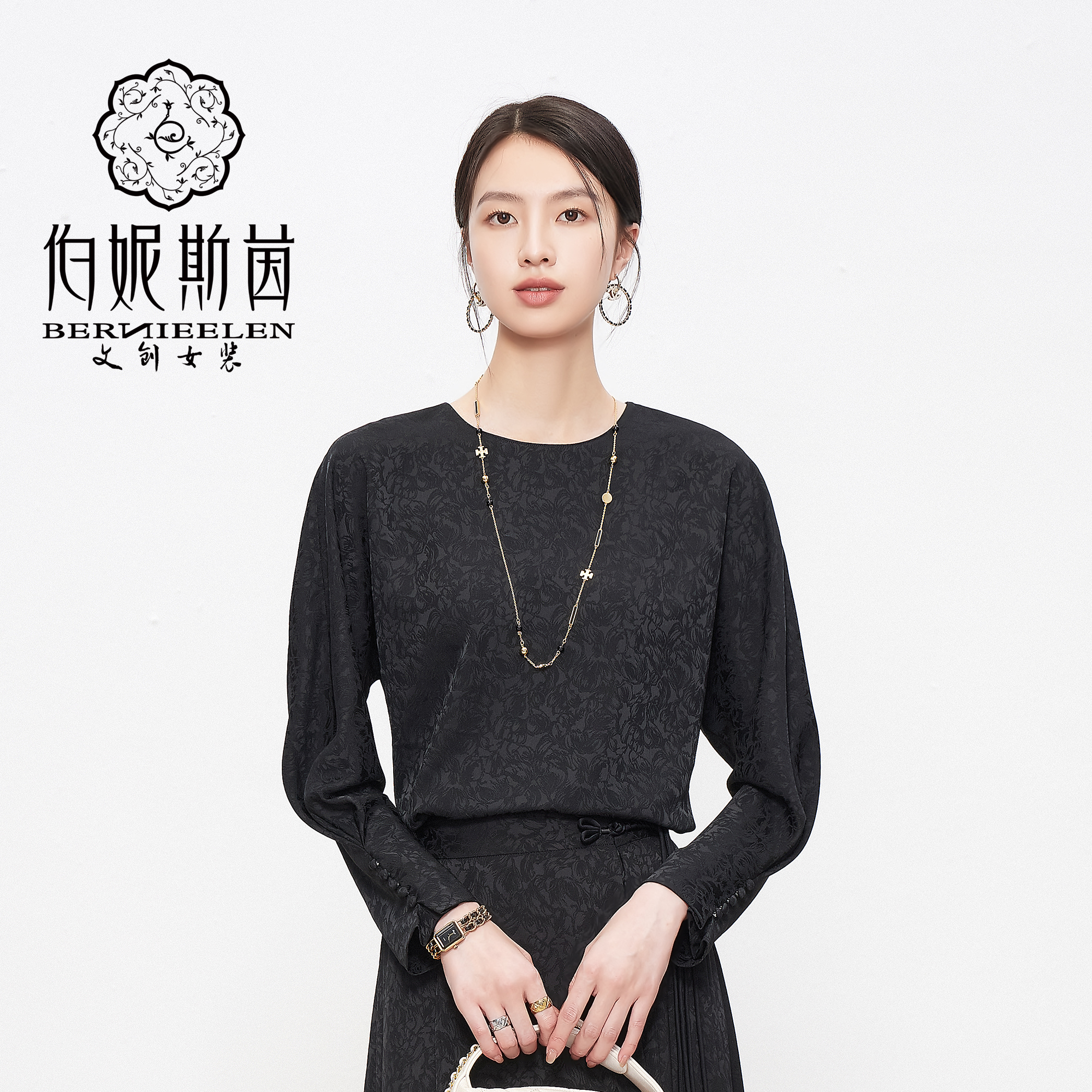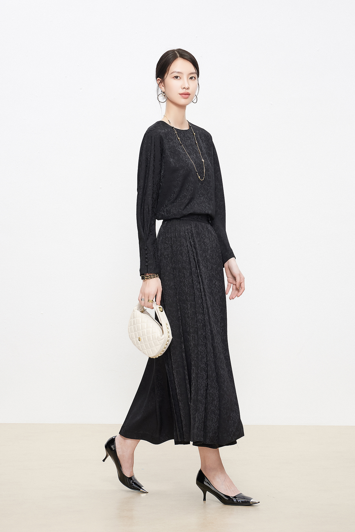 HJ1T13_栗壳色 / 漆黑色_ T 恤_四季_气质优雅暗纹提花圆领蝙蝠袖长袖垂感显瘦百搭上衣_高级女装_BERNIEELEN 伯妮斯茵