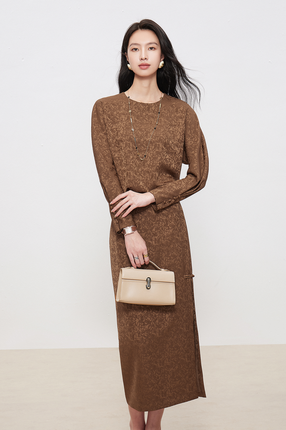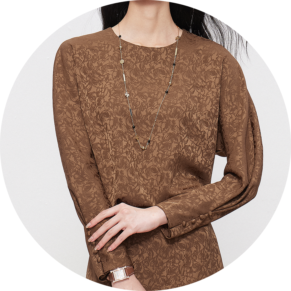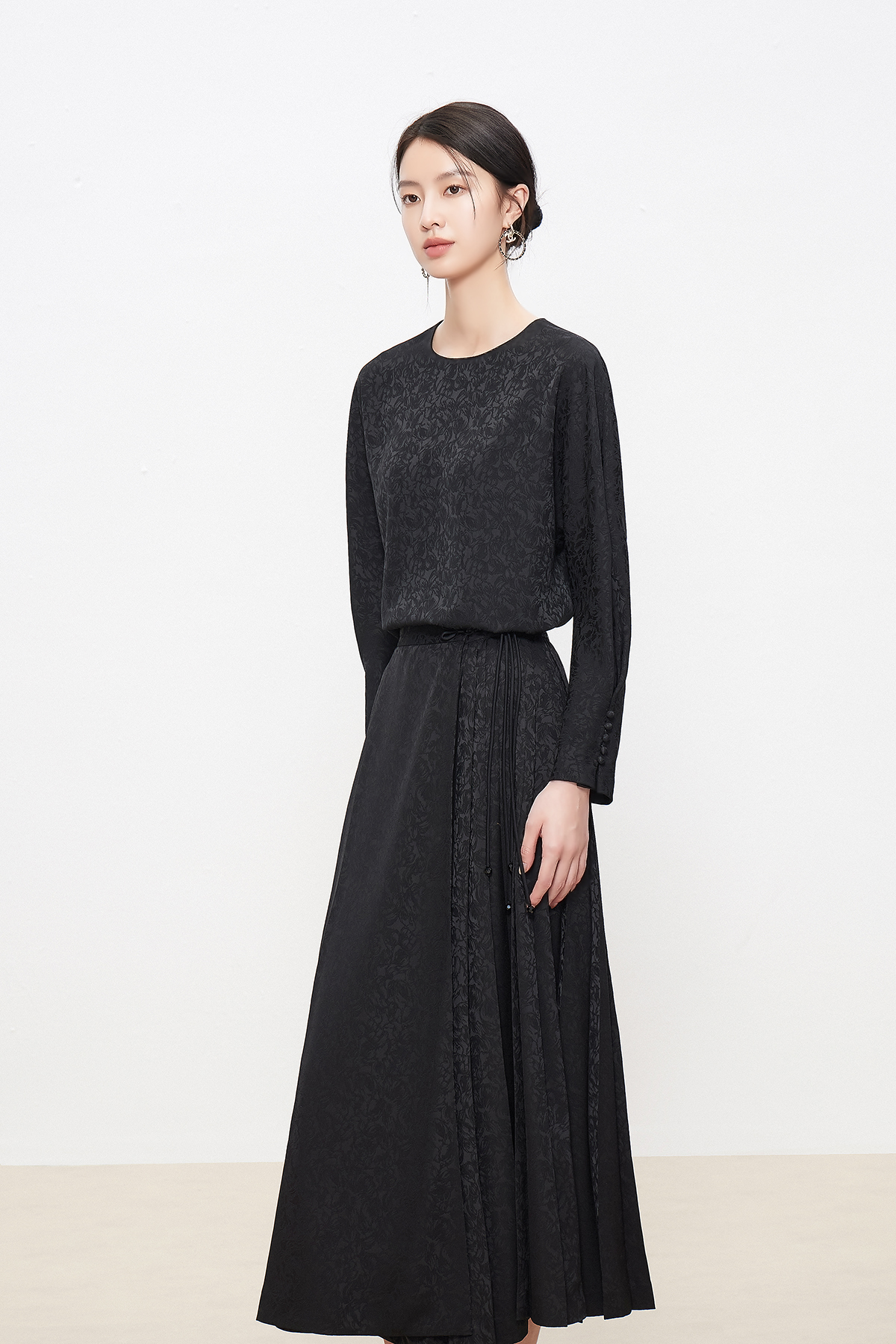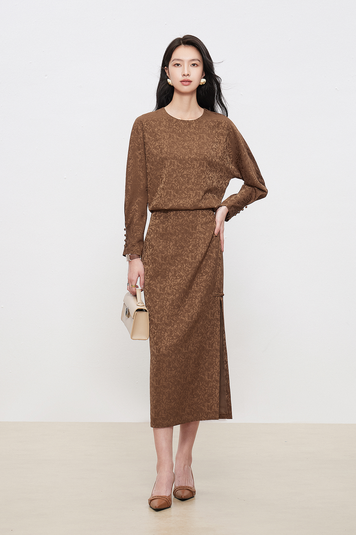 HJ1T13_栗壳色 / 漆黑色_ T 恤_四季_气质优雅暗纹提花圆领蝙蝠袖长袖垂感显瘦百搭上衣_高级女装_BERNIEELEN 伯妮斯茵