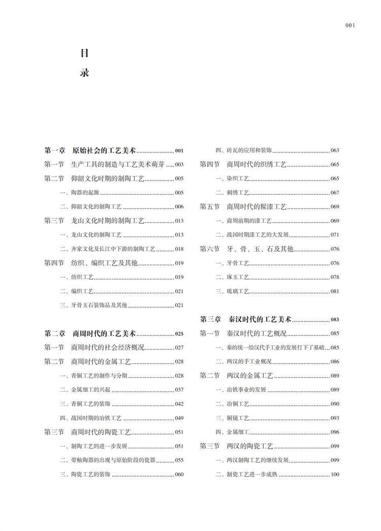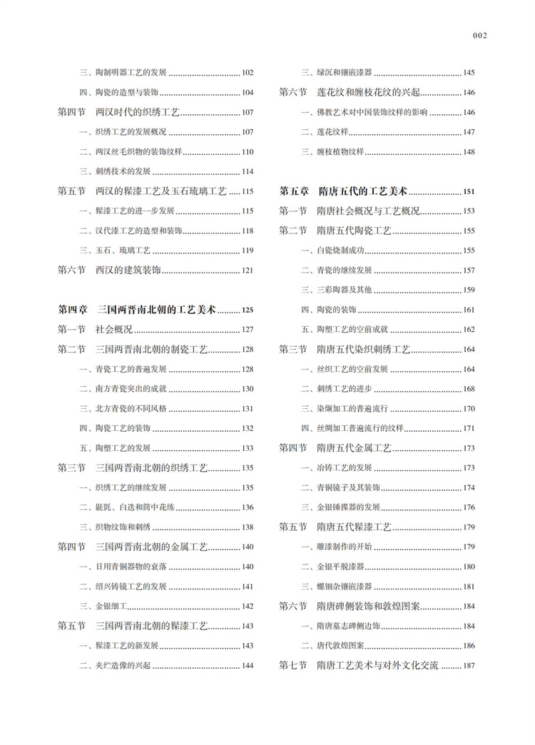 系统性。全书以时代为经,根据工艺美术的发展特点划定分期,分为原始社会、商周、秦汉、三国两晋南北朝、隋唐、两宋、元、明、清九章;以工艺品种为纬,阐述了陶瓷、青铜、染织、刺绣、玉器、金属细工、漆器、木雕、建筑彩画等的发展状况。时间跨度大、涉及门类全、引述作品文献多。