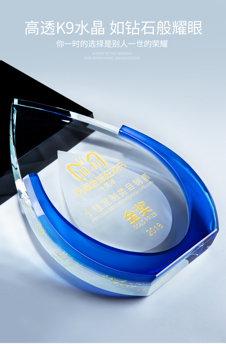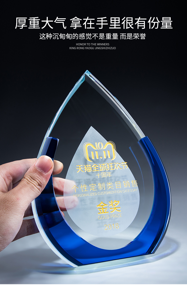 蓝色磨砂水晶奖杯定制创意奖杯刻字授权牌定做荣誉奖牌比赛纪念品