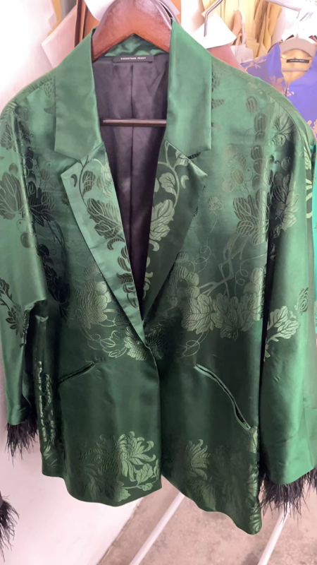 盛唐牡丹| 民国真丝老面料配鸵鸟毛西装外套-绿色