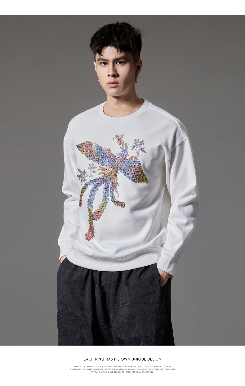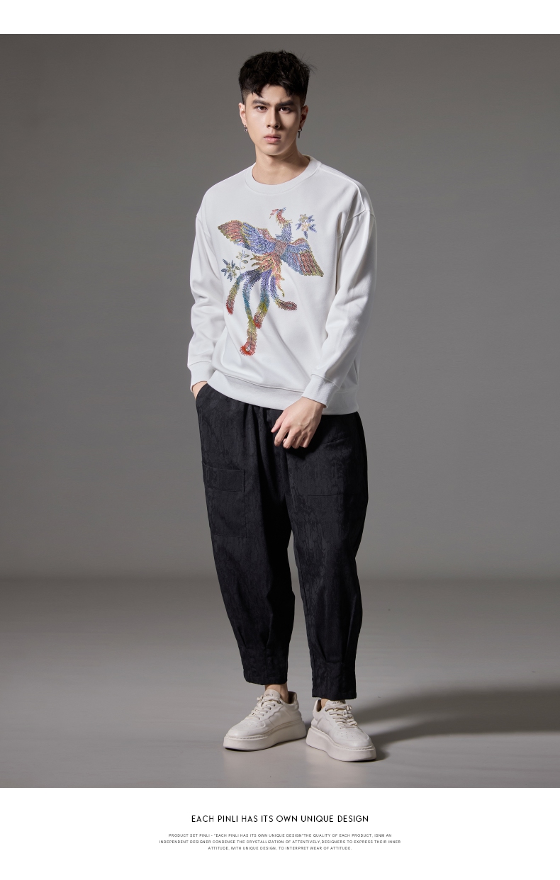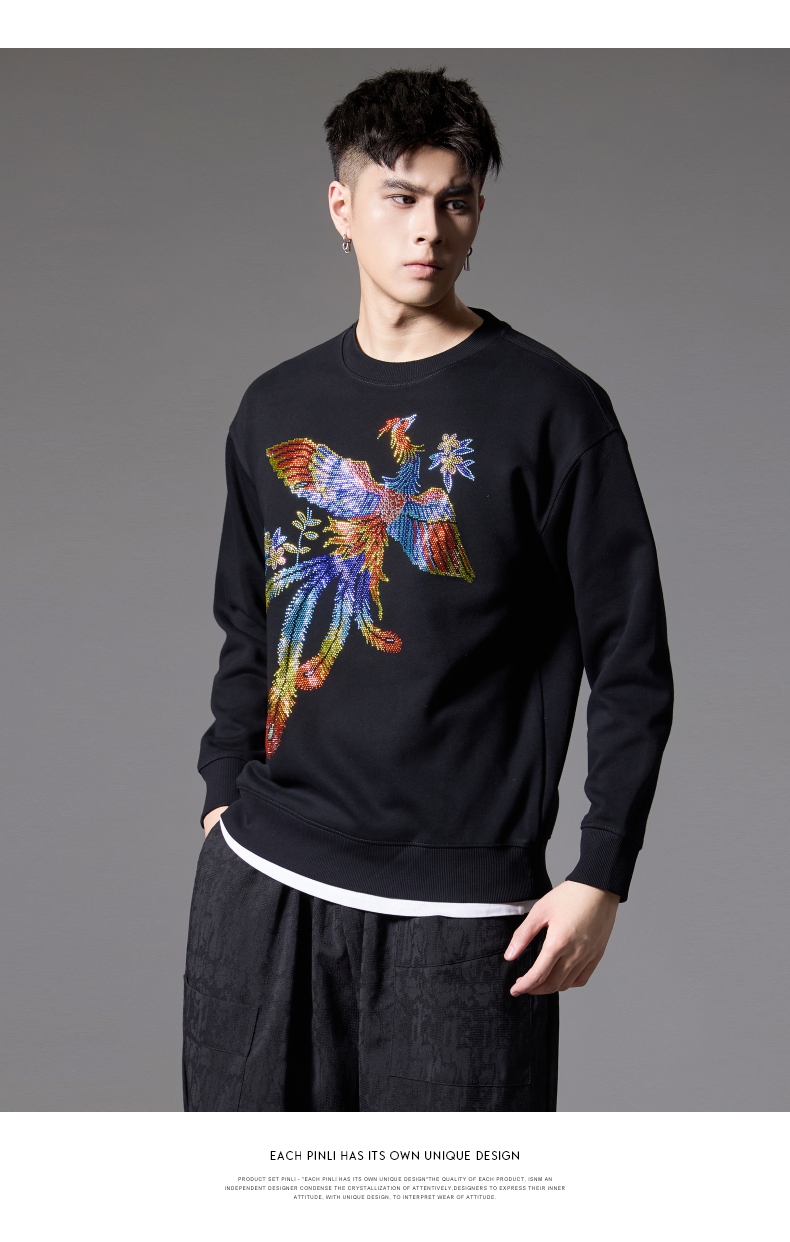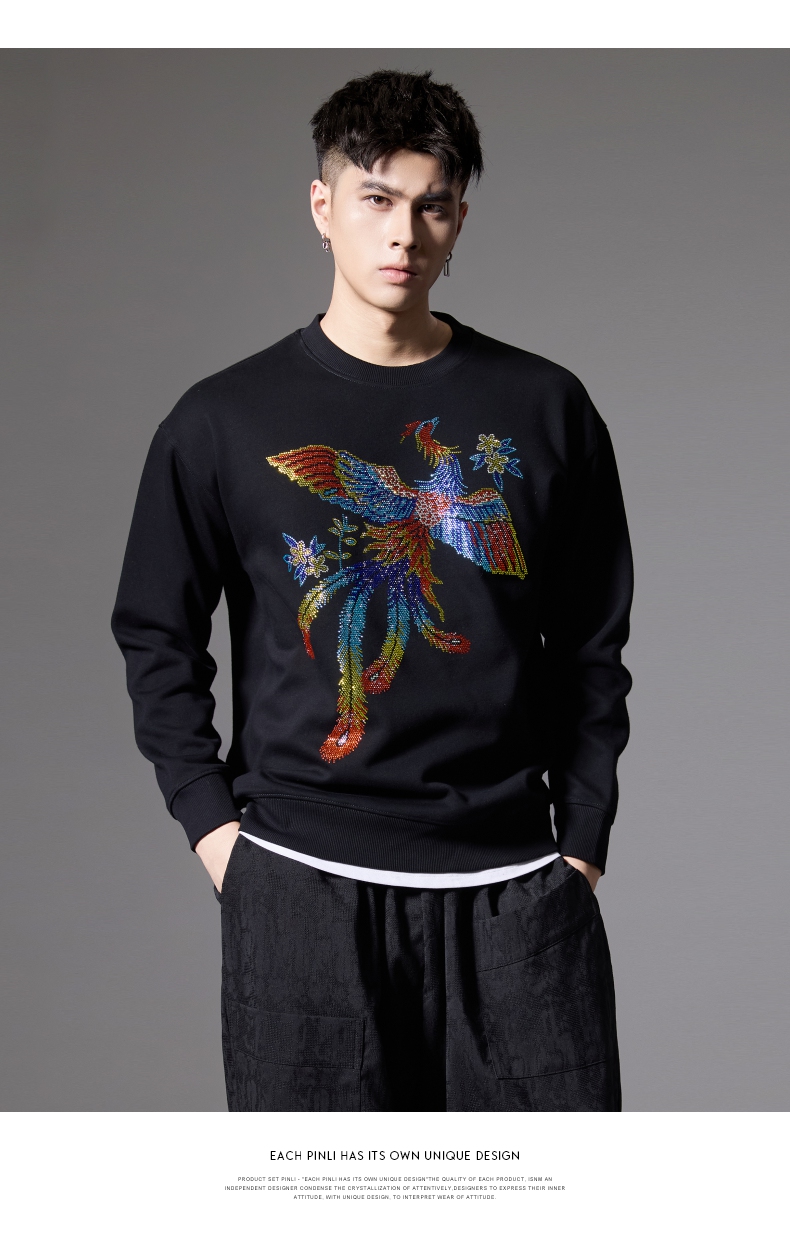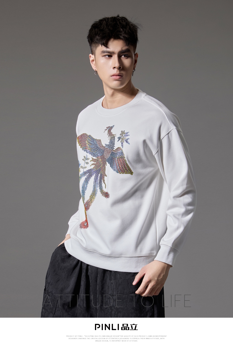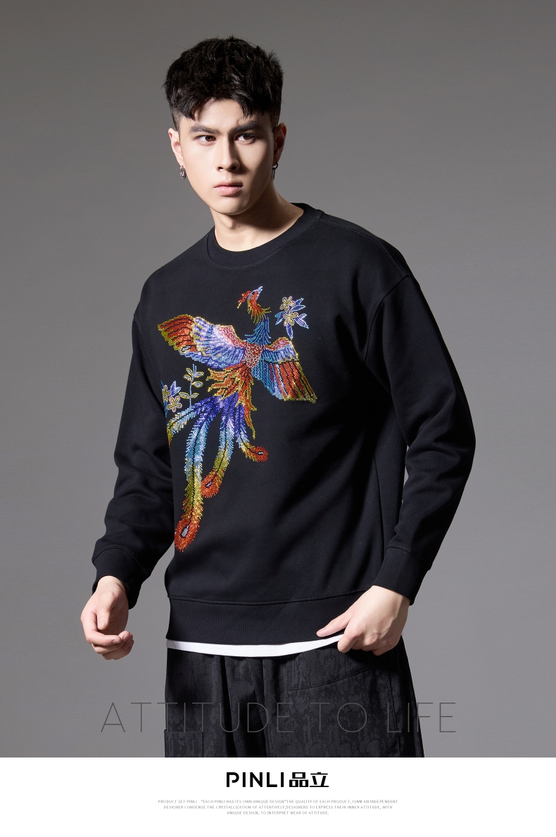 PINLI品立2024秋季新款凤凰彩钻套头卫衣国潮休闲宽松圆领男上衣BG243109010