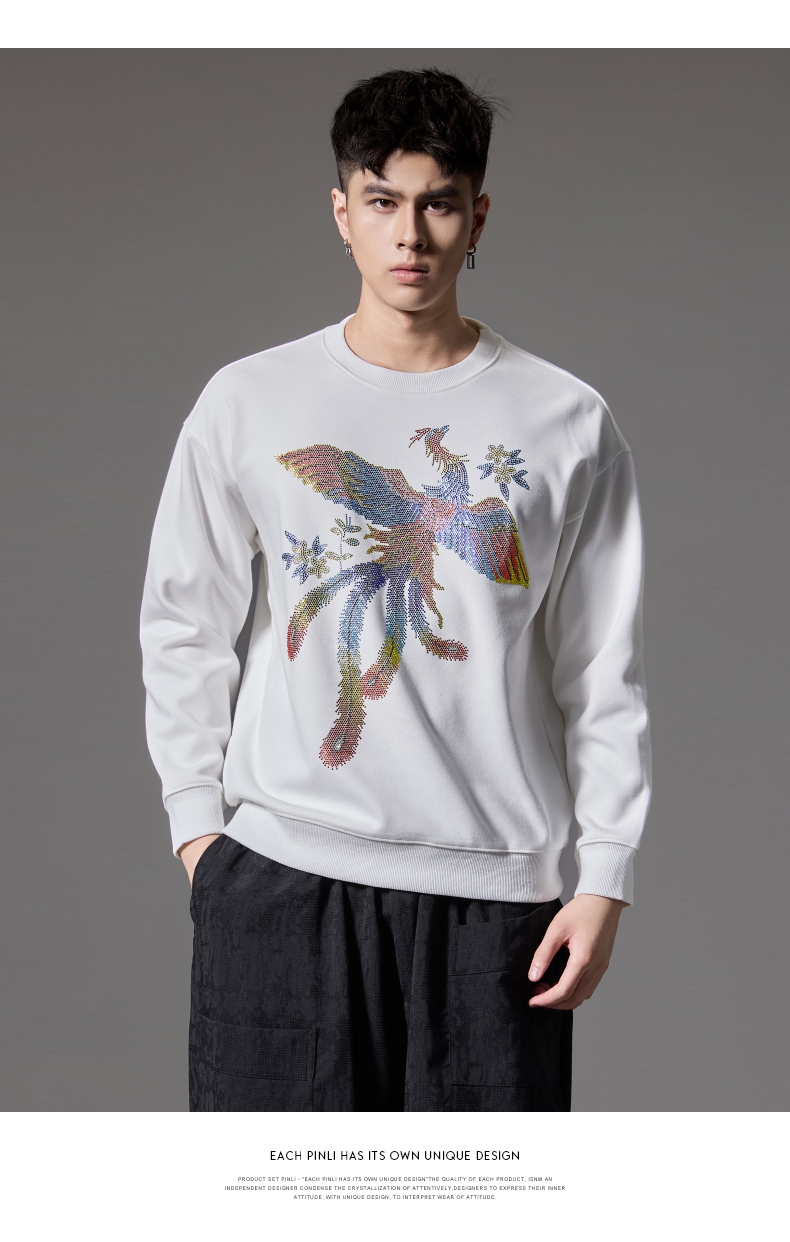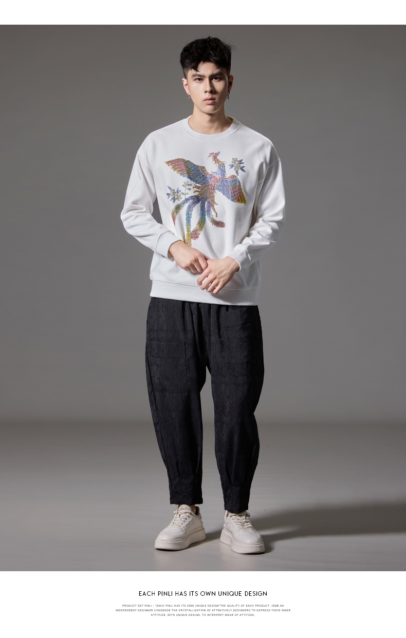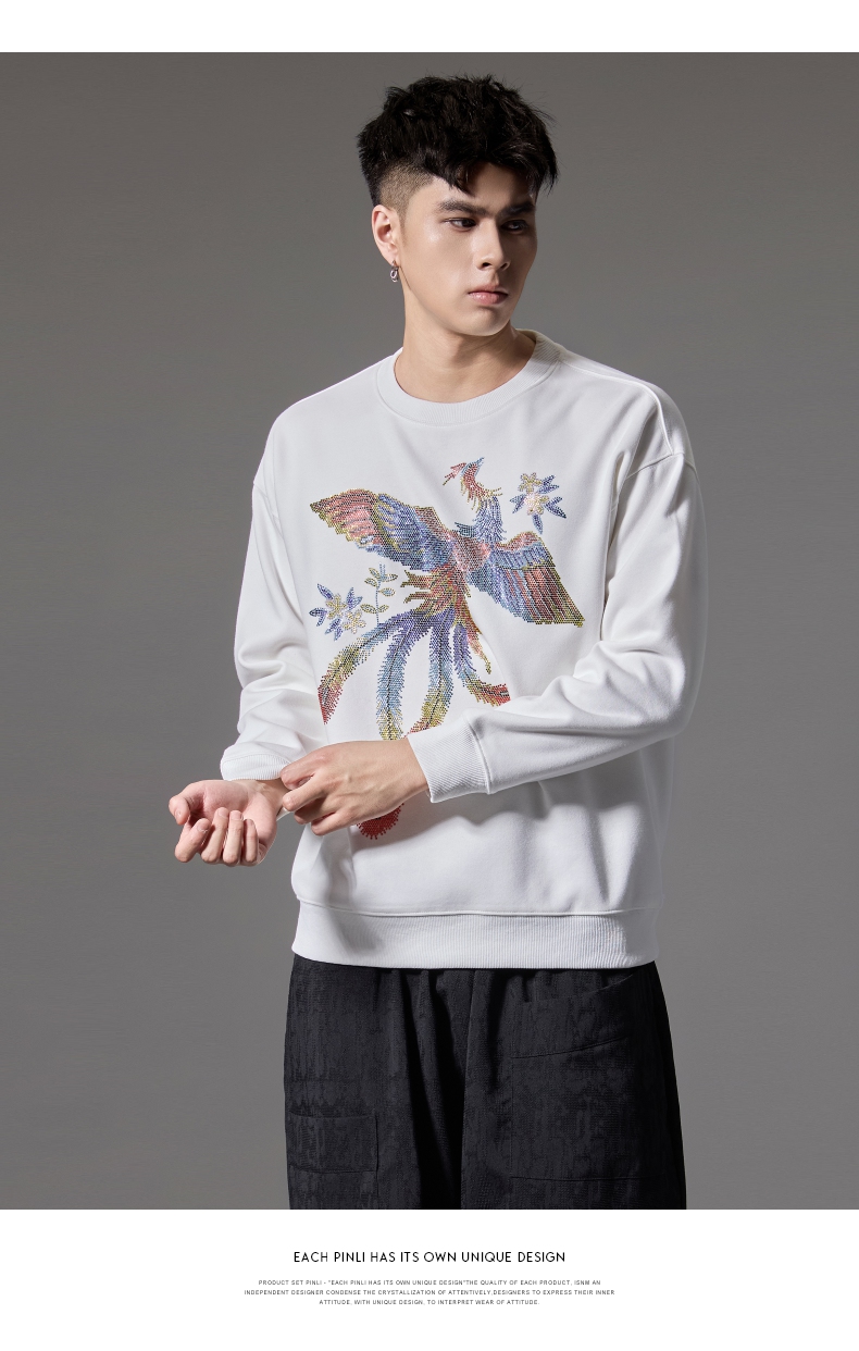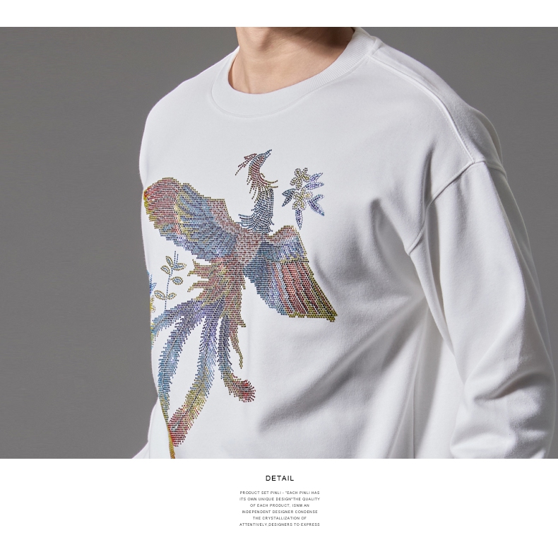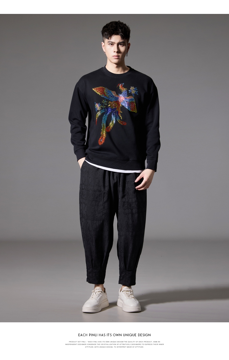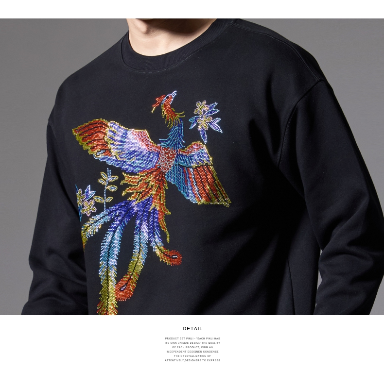 PINLI品立2024秋季新款凤凰彩钻套头卫衣国潮休闲宽松圆领男上衣BG243109010