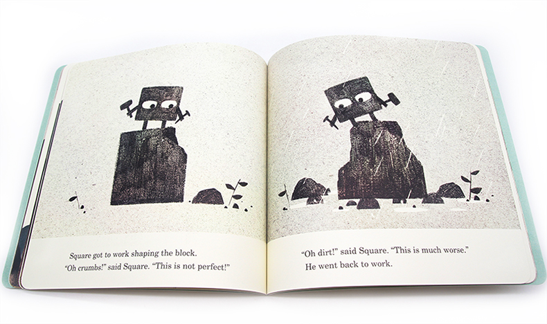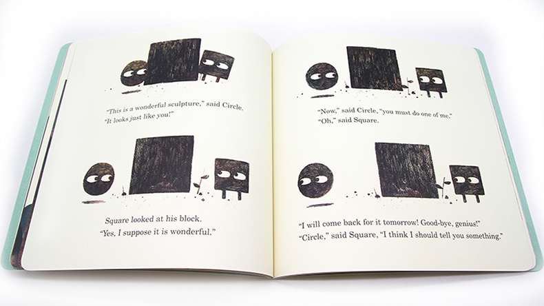 Every day, Square brings a block out of his cave and pushes it up a steep hill. This is his work. When Circle floats by, she declares Square a genius, a sculptor! “This is a wonderful statue,” she says. “It looks just like you!” But now Circle wants a sculpture of her own, a circle! Will the genius manage to create one? Even accidentally?