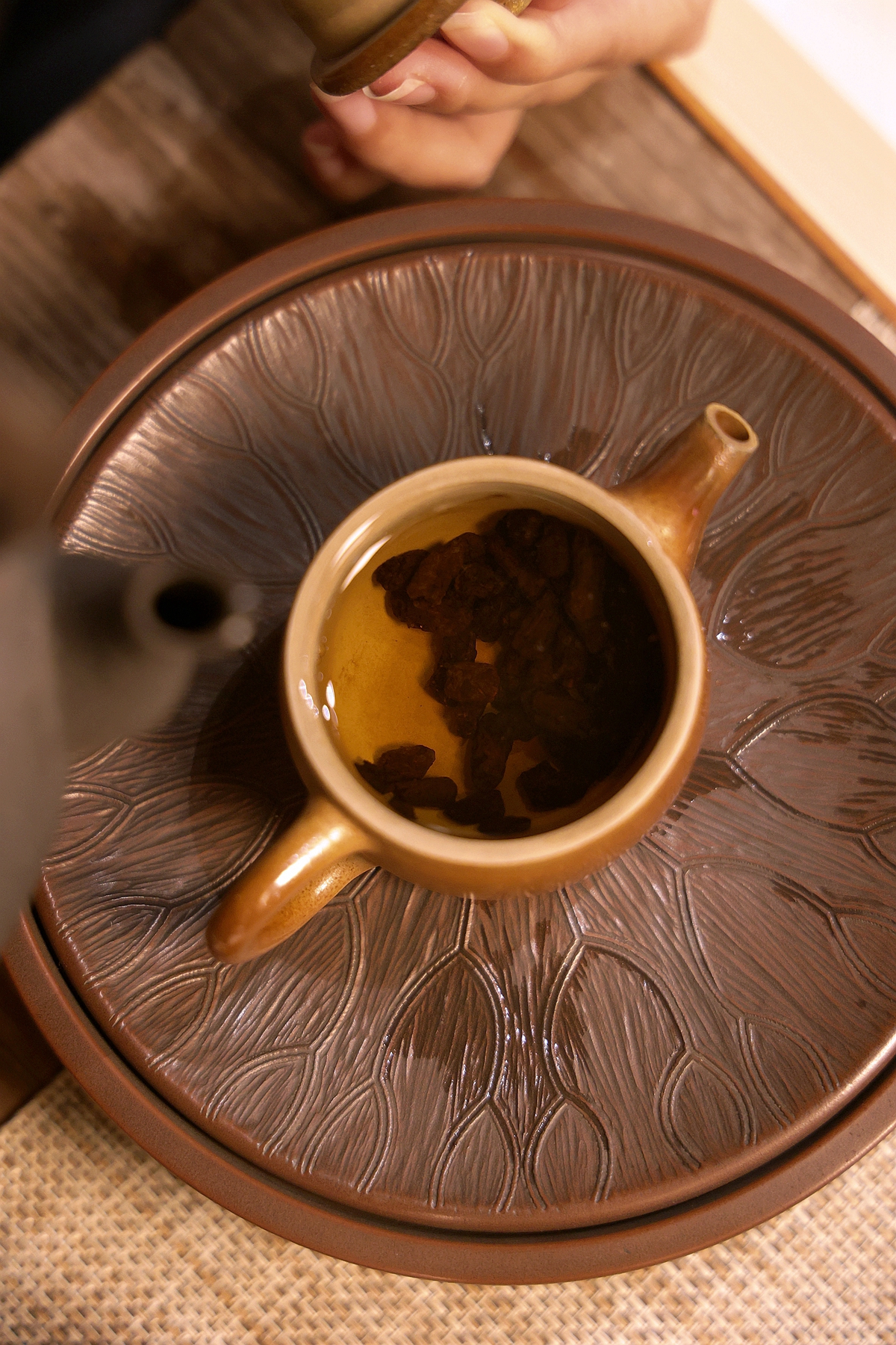 关键一刻:水浸没茶叶的刹那,请侧耳倾听,那“咕噜咕噜”的冒泡声,正是茶化石被唤醒、开始“呼吸”的声音。这个过程持续数秒,气泡细密而活跃,是判断其工艺与活性的趣味所在。