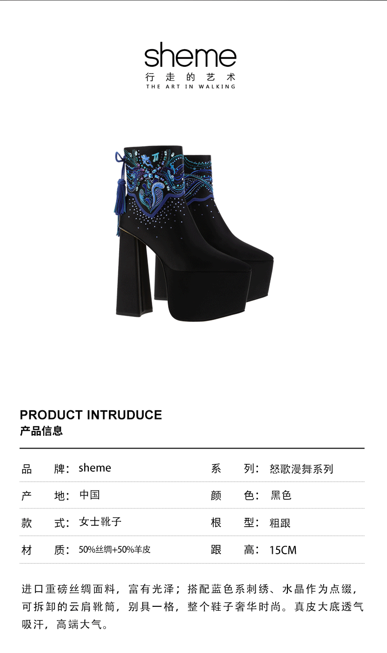 sheme怒歌漫舞系列精美刺绣水晶点缀可拆卸靴筒厚水台奢华新中式女士短靴可定制