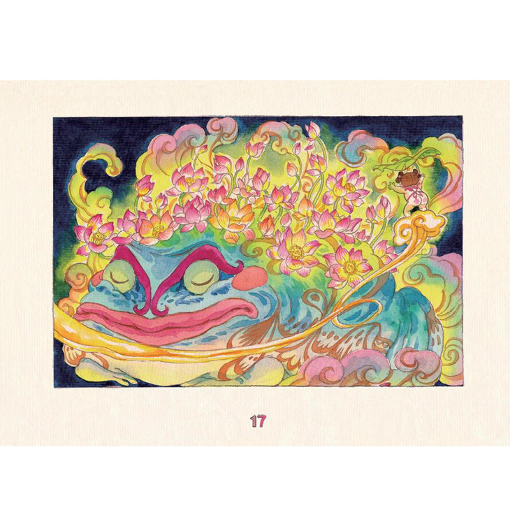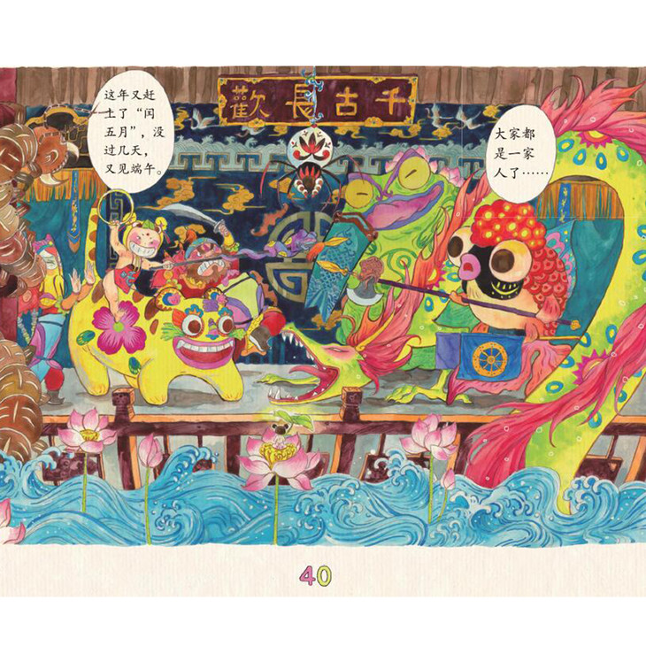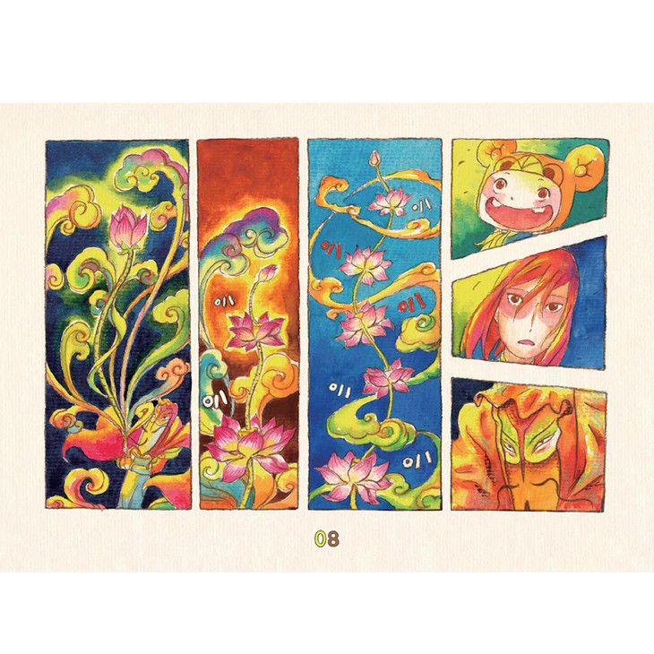2、全彩手绘,富有传统中国风味的民俗童画。作者用画绘本的手法做多格漫画,水墨画一样的晕染结合了年画一样的浓烈色彩,绚烂又别致。
