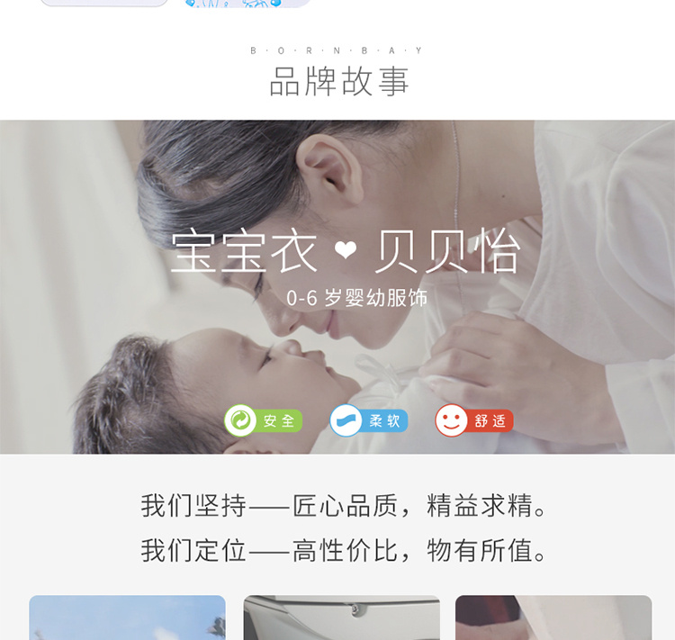 - 贝贝怡专注0-6岁婴幼儿服饰,坚持安全、柔软、舒适的产品理念,为千万中国家庭提供超高品质、安全可靠的婴幼儿服饰产品,妈妈放心,宝宝开心!