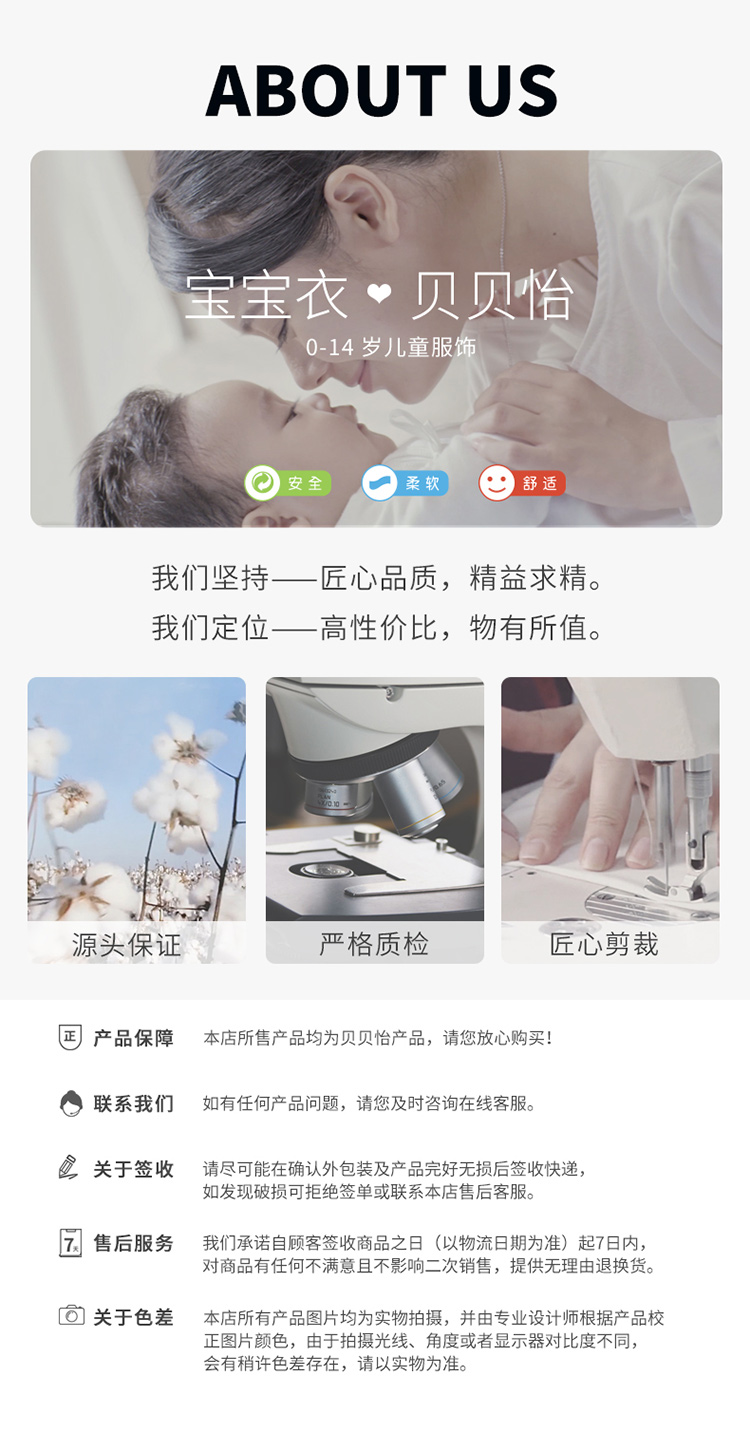 - 贝贝怡专注0-6岁婴幼儿服饰,坚持安全、柔软、舒适的产品理念,为千万中国家庭提供超高品质、安全可靠的婴幼儿服饰产品,妈妈放心,宝宝开心!