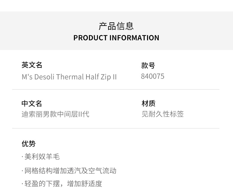 HOUDINI胡丁尼 Desoli 迪索丽 II代 男美利奴羊毛保暖半拉链打底衫长袖 840075