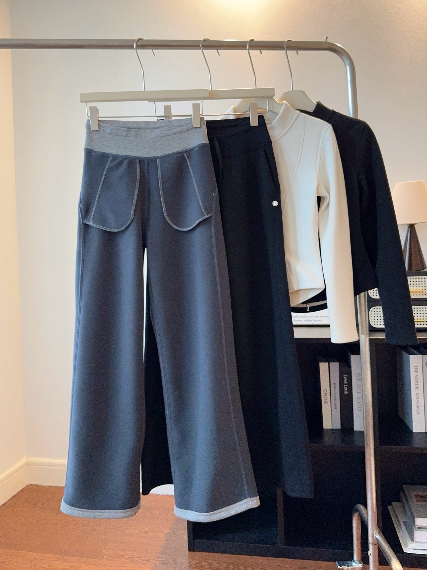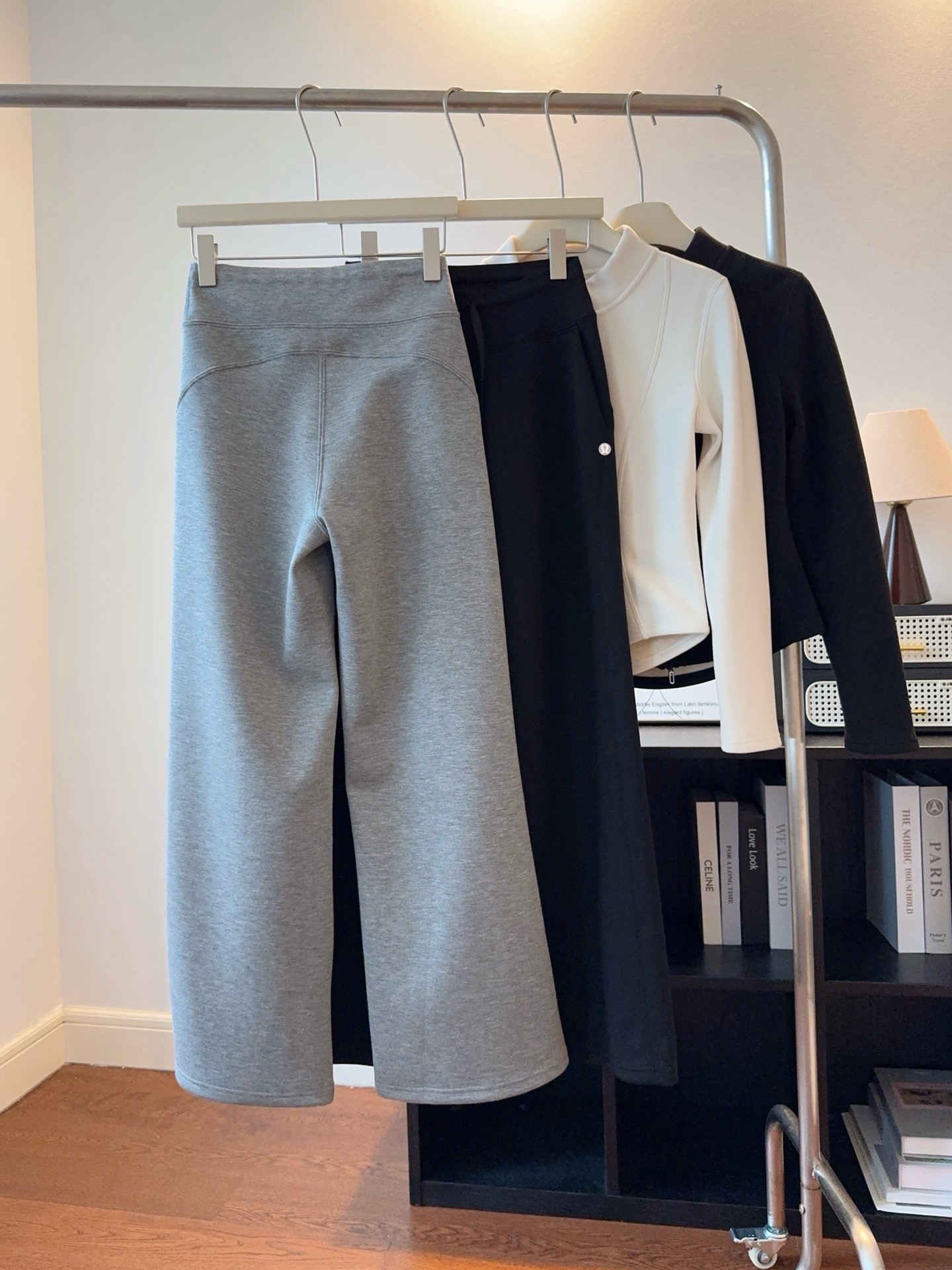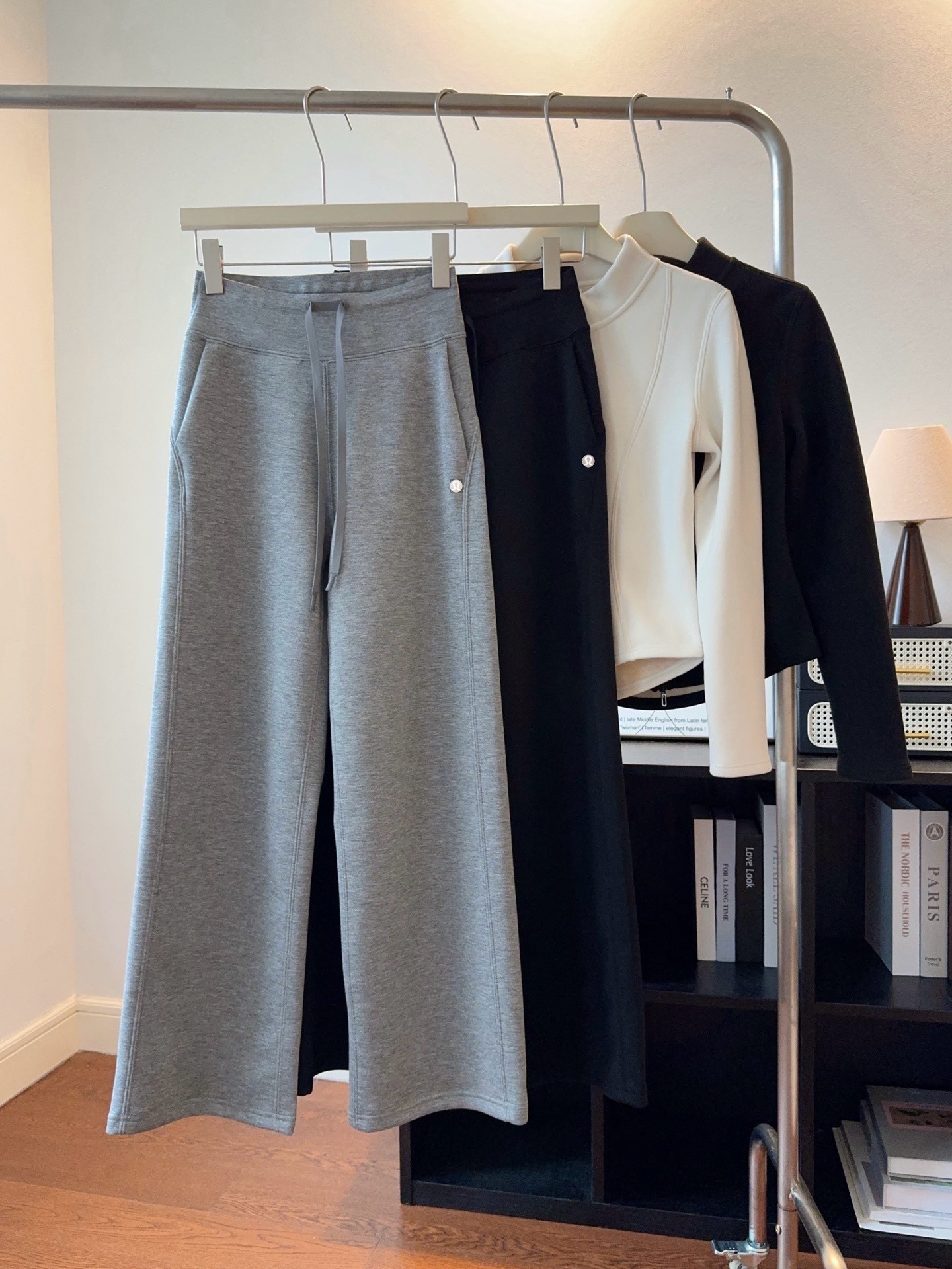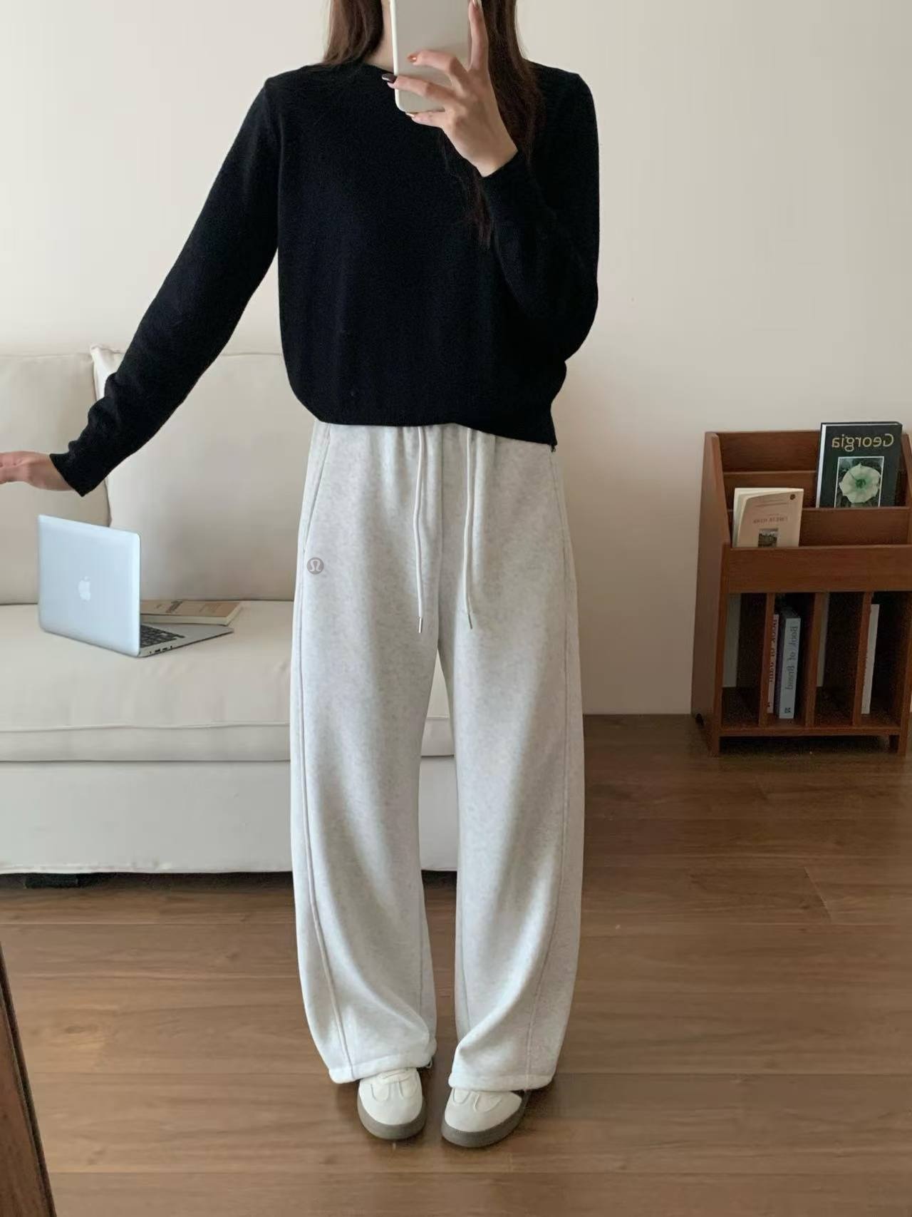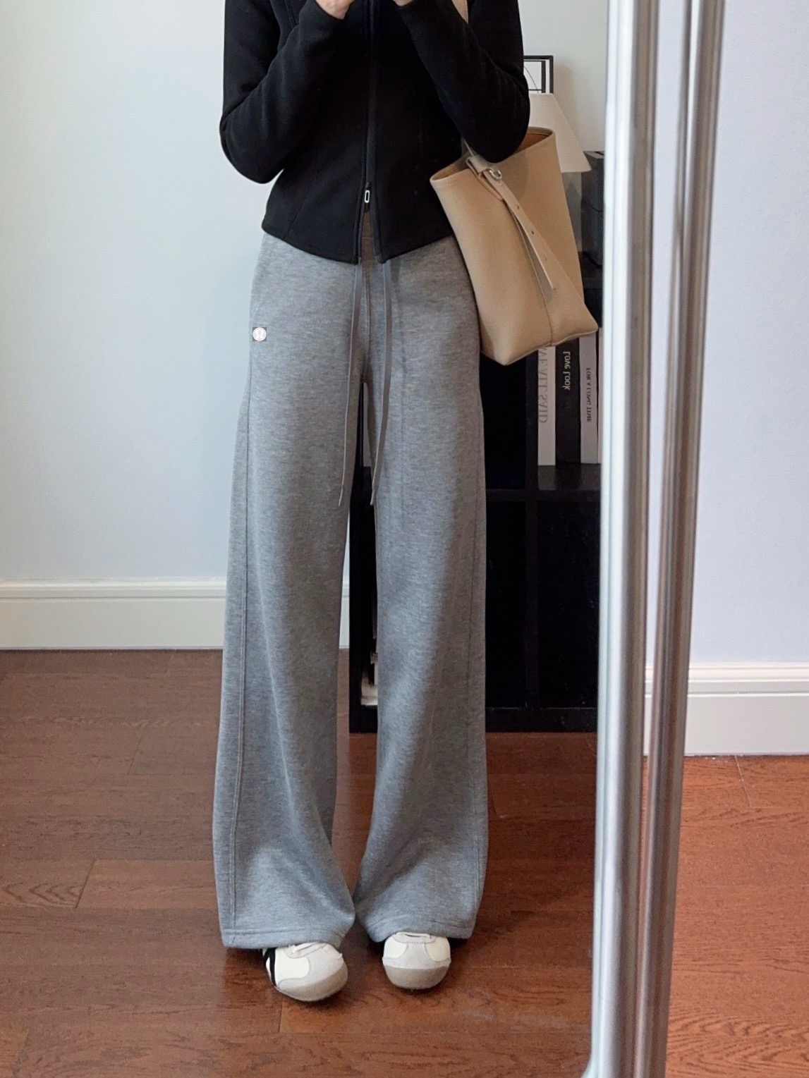 加绒裤升级款阔腿裤加绒款 裤子采用空气层面料,追求一种恰到好处的宽松度和流畅的垂坠感,从大腿或膝盖处开始自然向下、向外微扩,形成优雅的直筒效果,线条流畅利落,是打造长腿和气场的利器。裤子采用仿砂洗工艺,软糯亲肤,里面做了加绒处理,又保暖