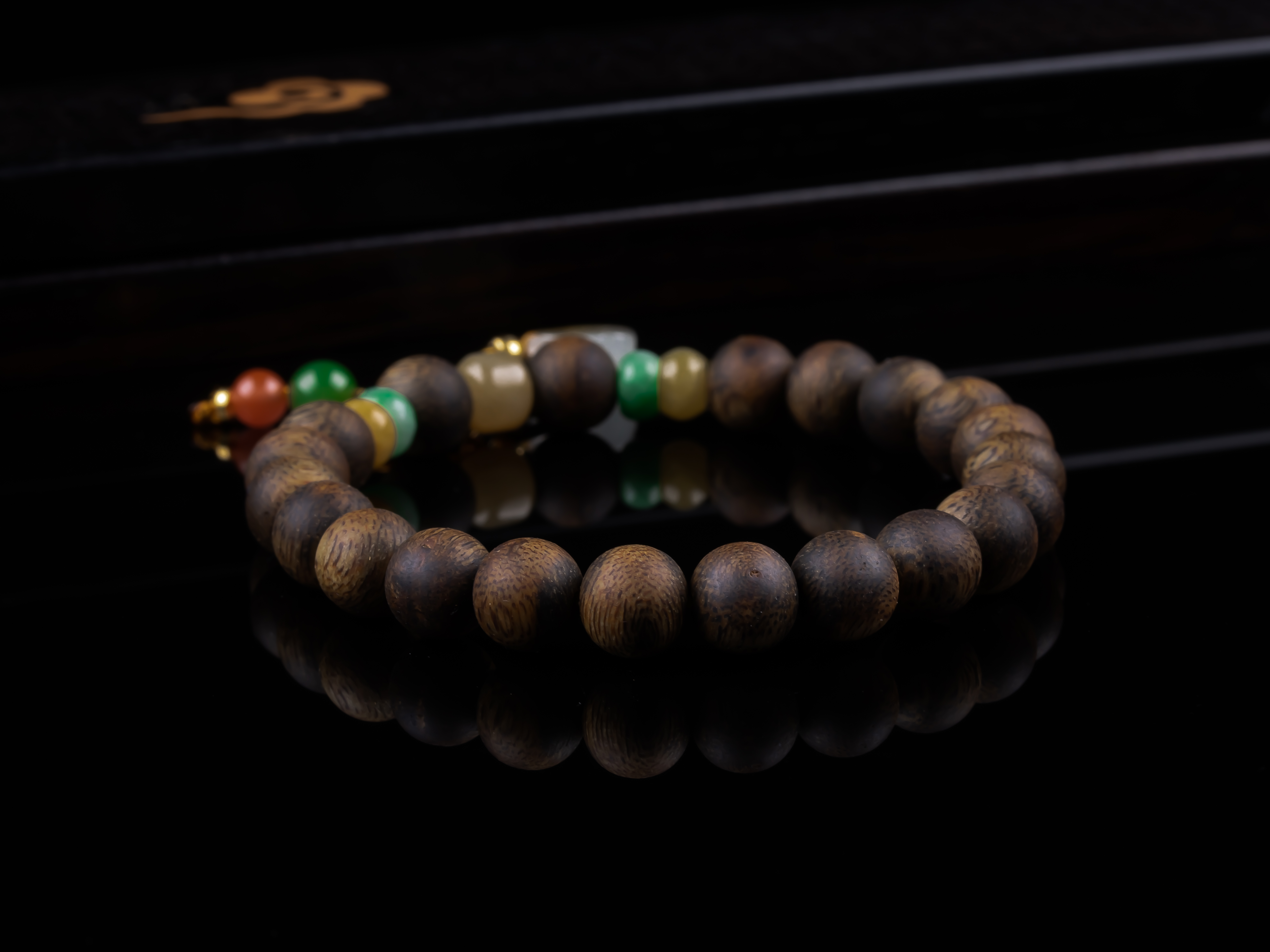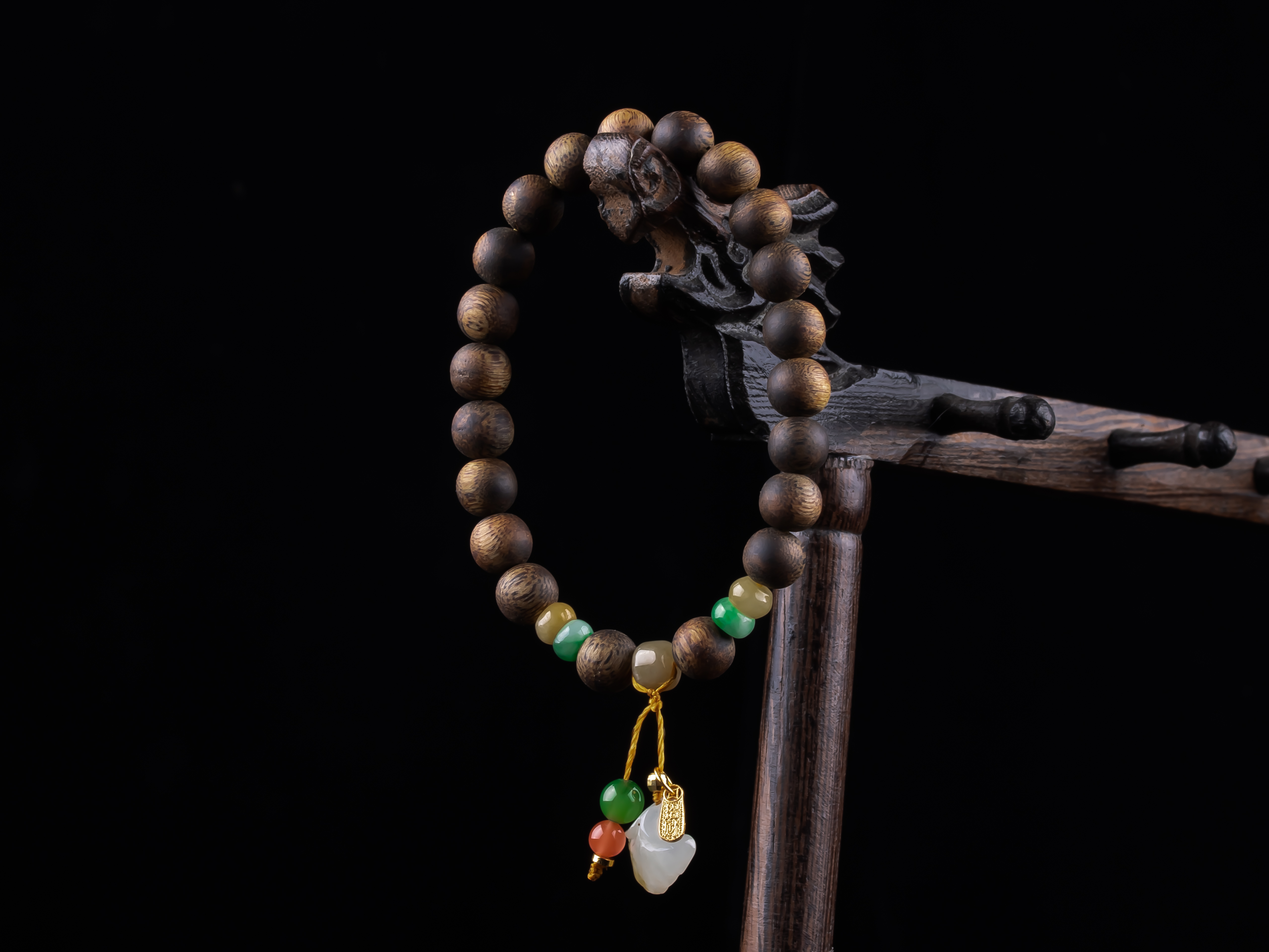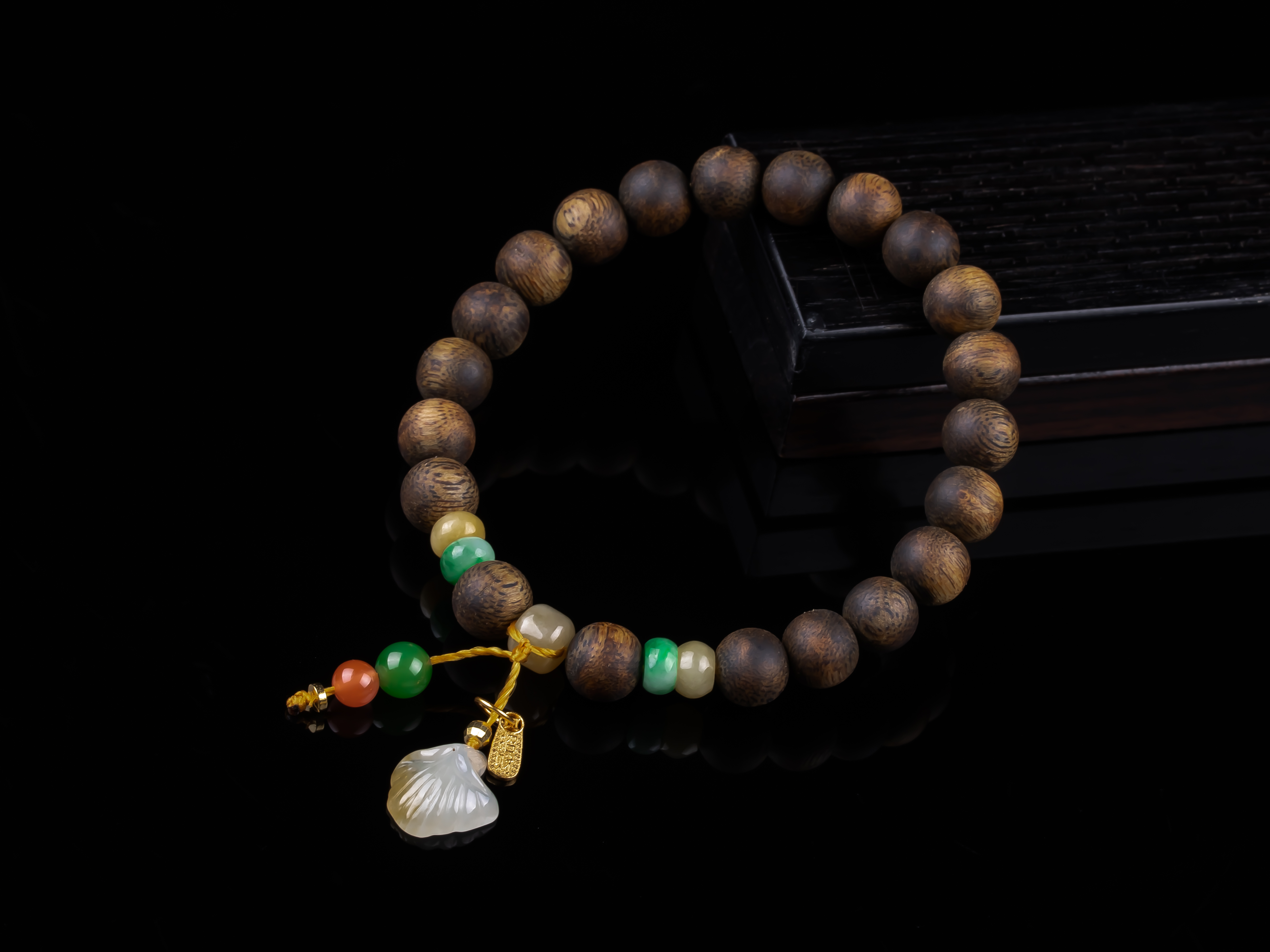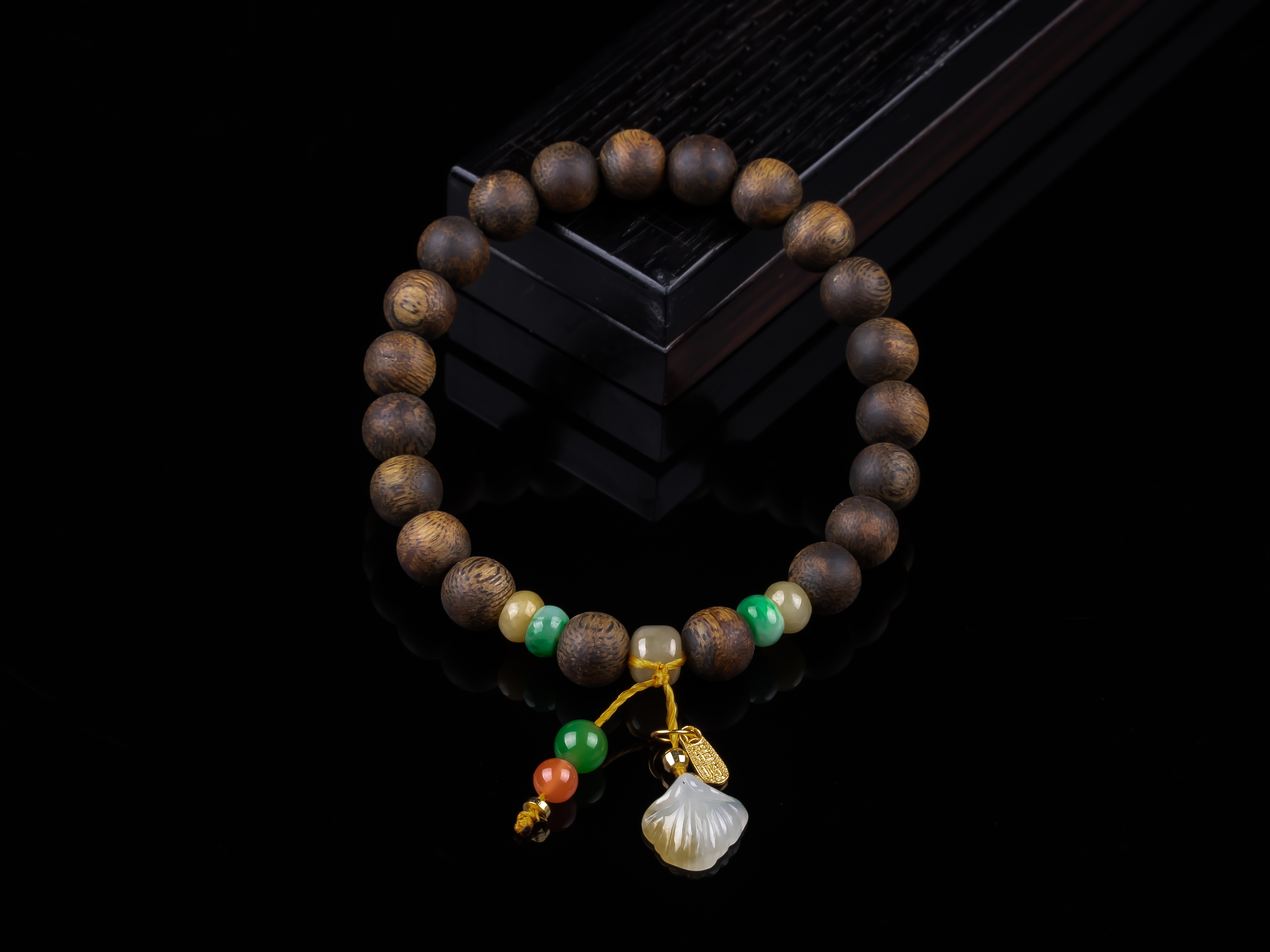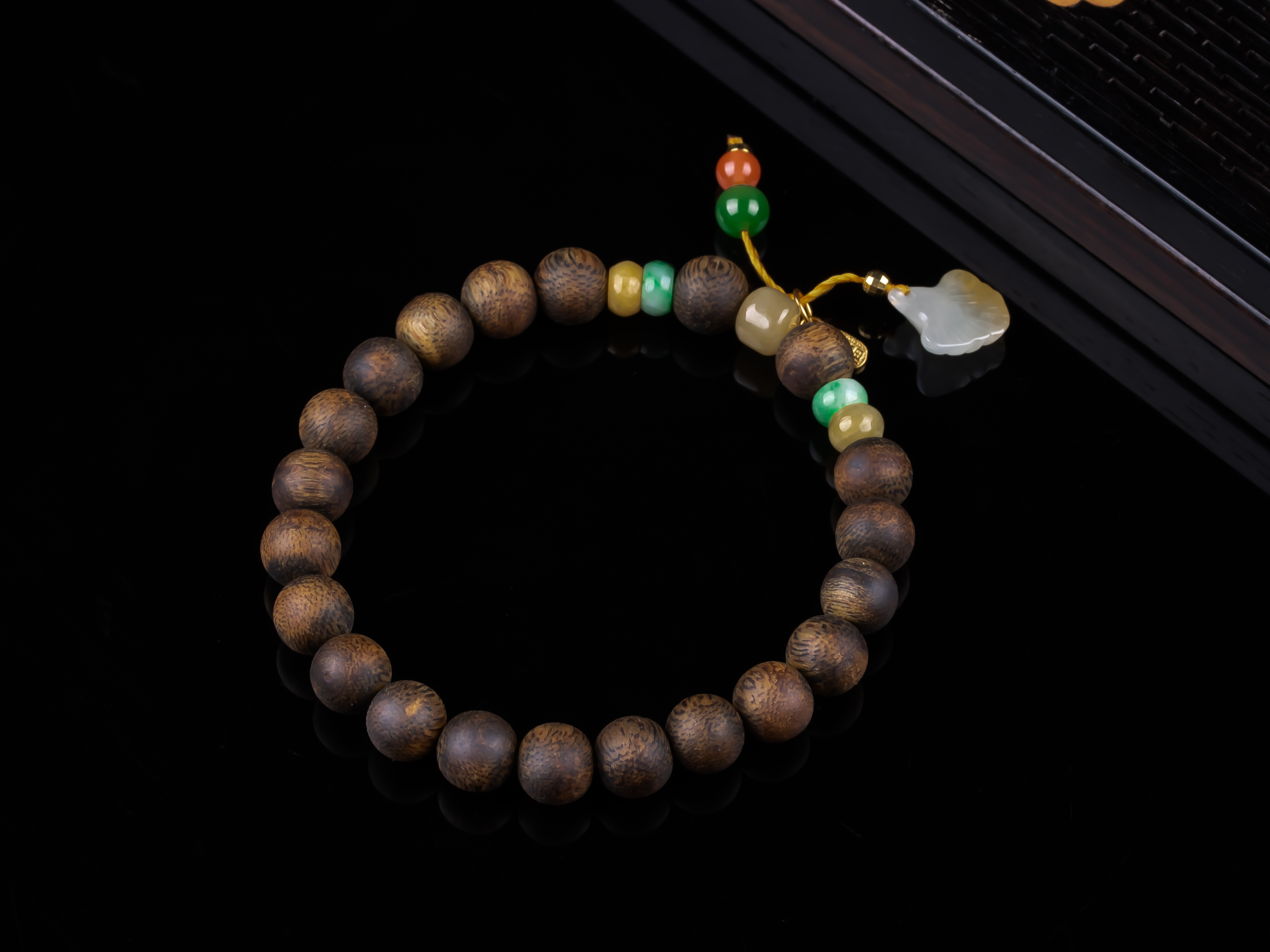 XY0239沉香+翡翠银杏叶小坠手串,天然沉香9.3mm,原色原味,香味自然清甜,搭配翡翠、碧玉、南红、925银,一颗冰润的银杏叶小坠子飘着一抹黄色,仿佛看到银杏叶飘动的风景。