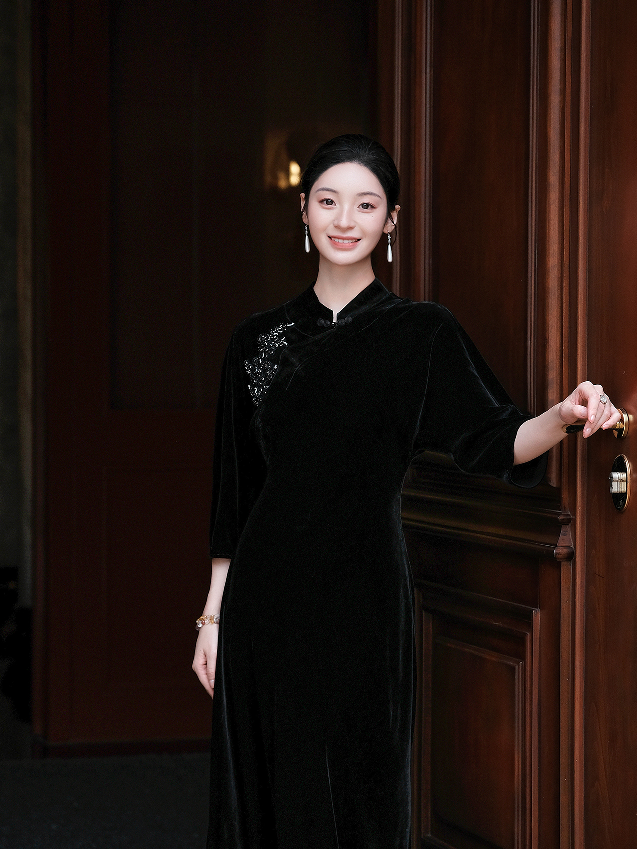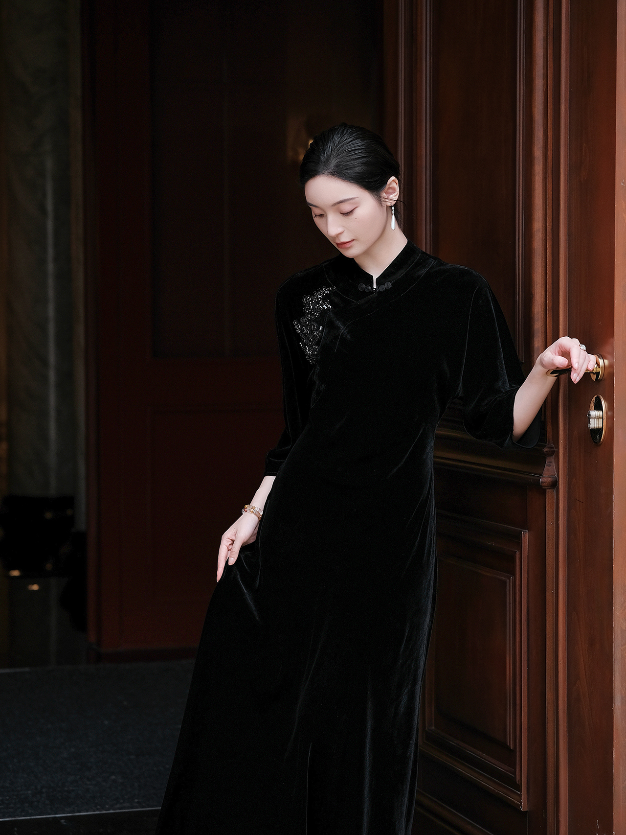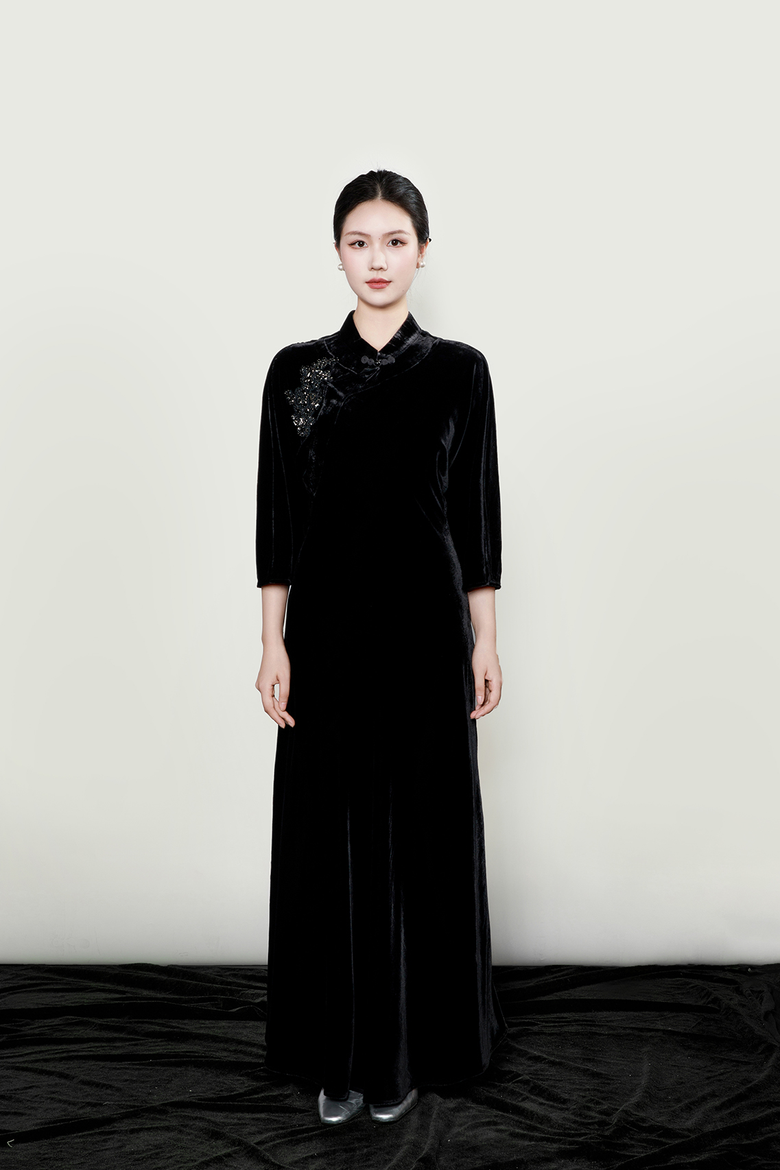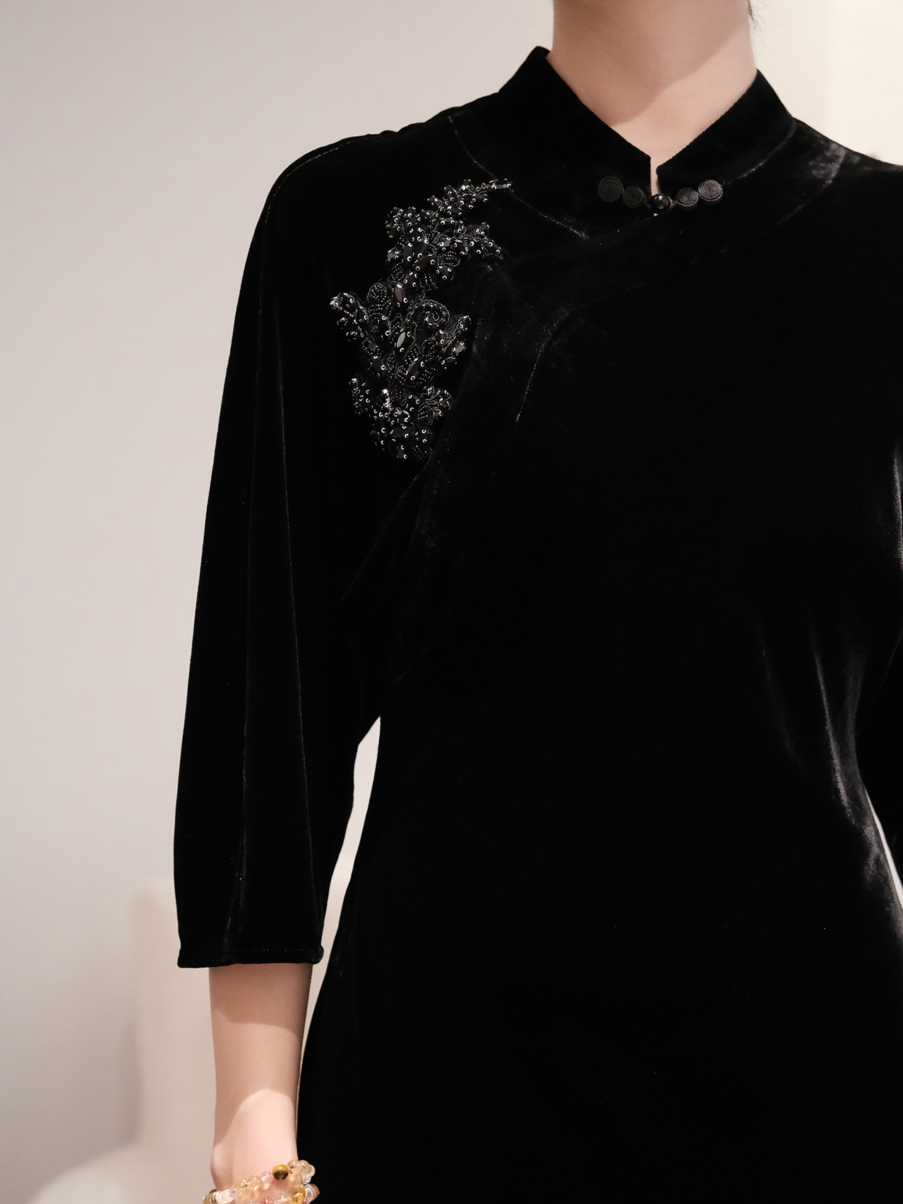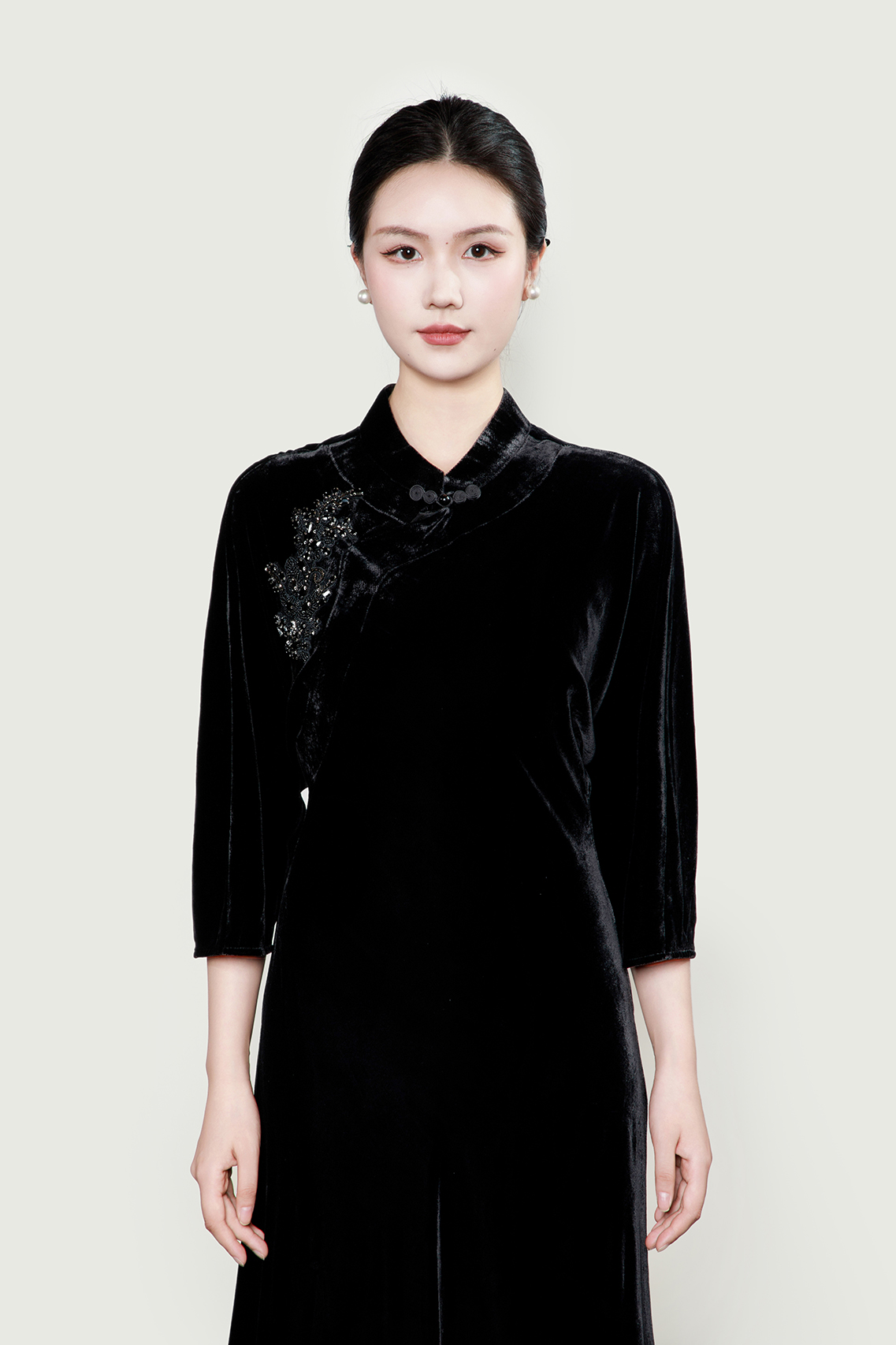 盛唐婧| 重磅真丝绒重工珠绣七分袖连衣裙