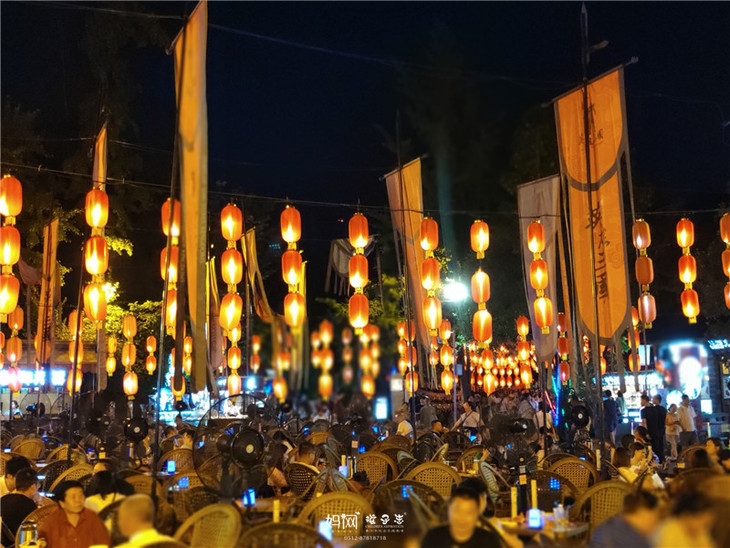 有各种小摊饭馆及化妆成卡通人物的艺人表演