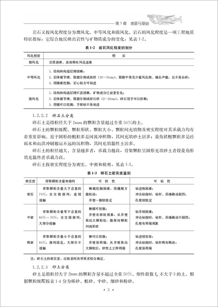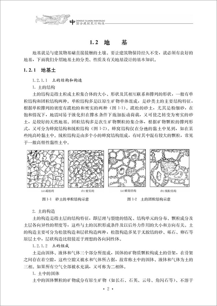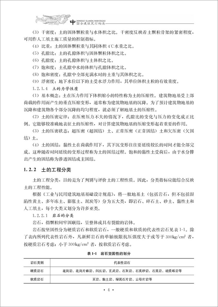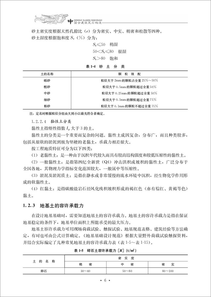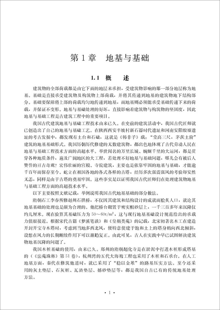 《中国古建筑瓦石构造·中国古建筑营造技术丛书》一书第一章介绍的地基设计和基础知识,只针对中国古建筑,因其主要以柱子传递轴心压力,且多为一层,楼房也就二三层,荷载不大,故没有考虑其他受力状态的设计原理。第二章介绍的中国古建筑基址,是依据不同文献介绍的一些古建筑独立基础的做法,没有做力学方面的分析,有的桥梁、塔幢,其基础也做了柏木桩,桩上有承台,从受力的角度看,恐怕已兼有端承桩和摩擦桩两种功能了。台基、墙壁、屋顶、地面等章节大多取材于《中国古建筑瓦石营法》第一版中有关构造部分的内容,当然,也拓展了其他的一些资料。