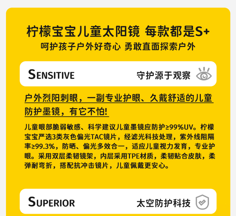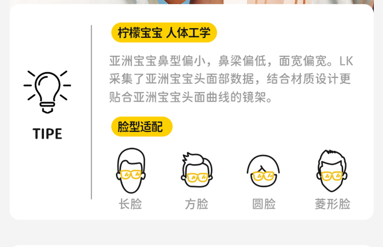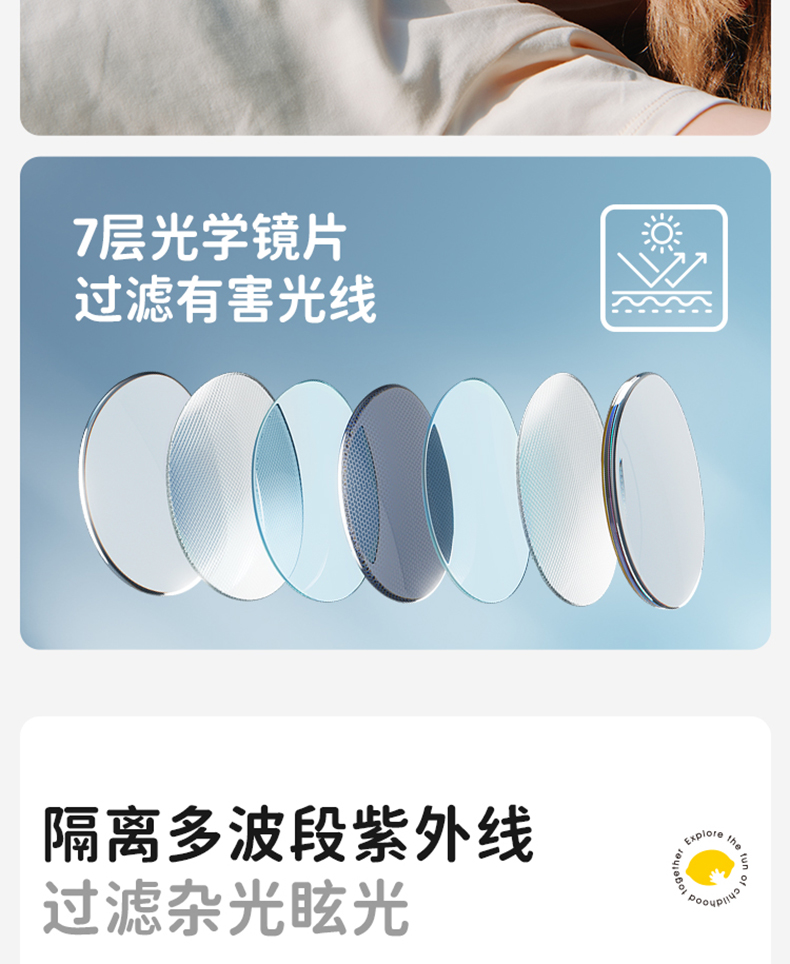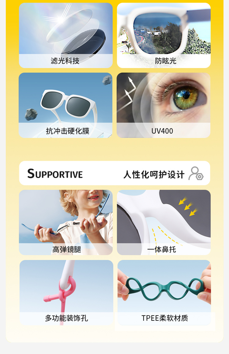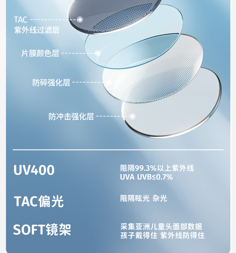 2.使用足够安全和防摔的镜片材质,镜架也要讲究,可以360度随意扭,没有小附件;