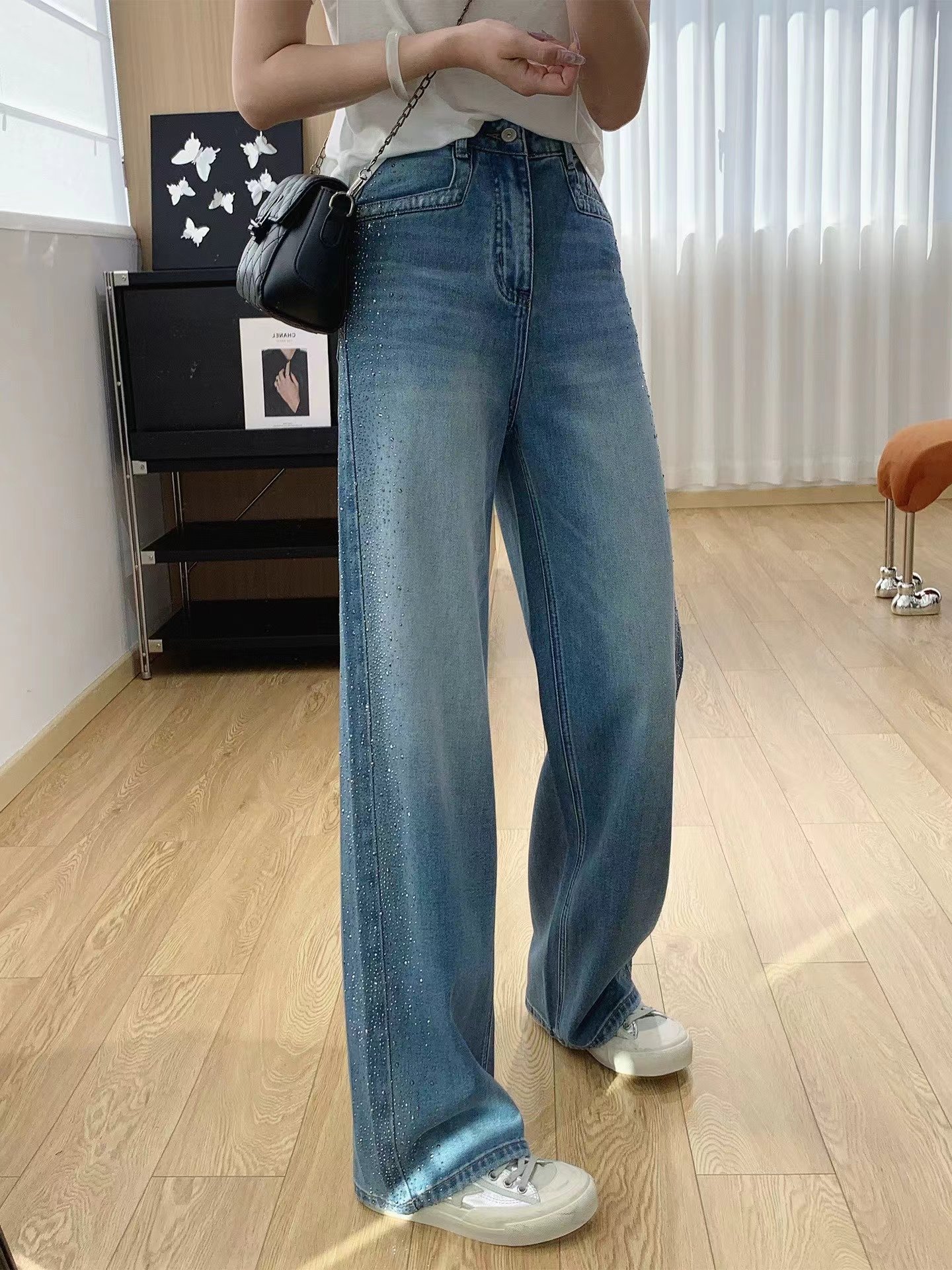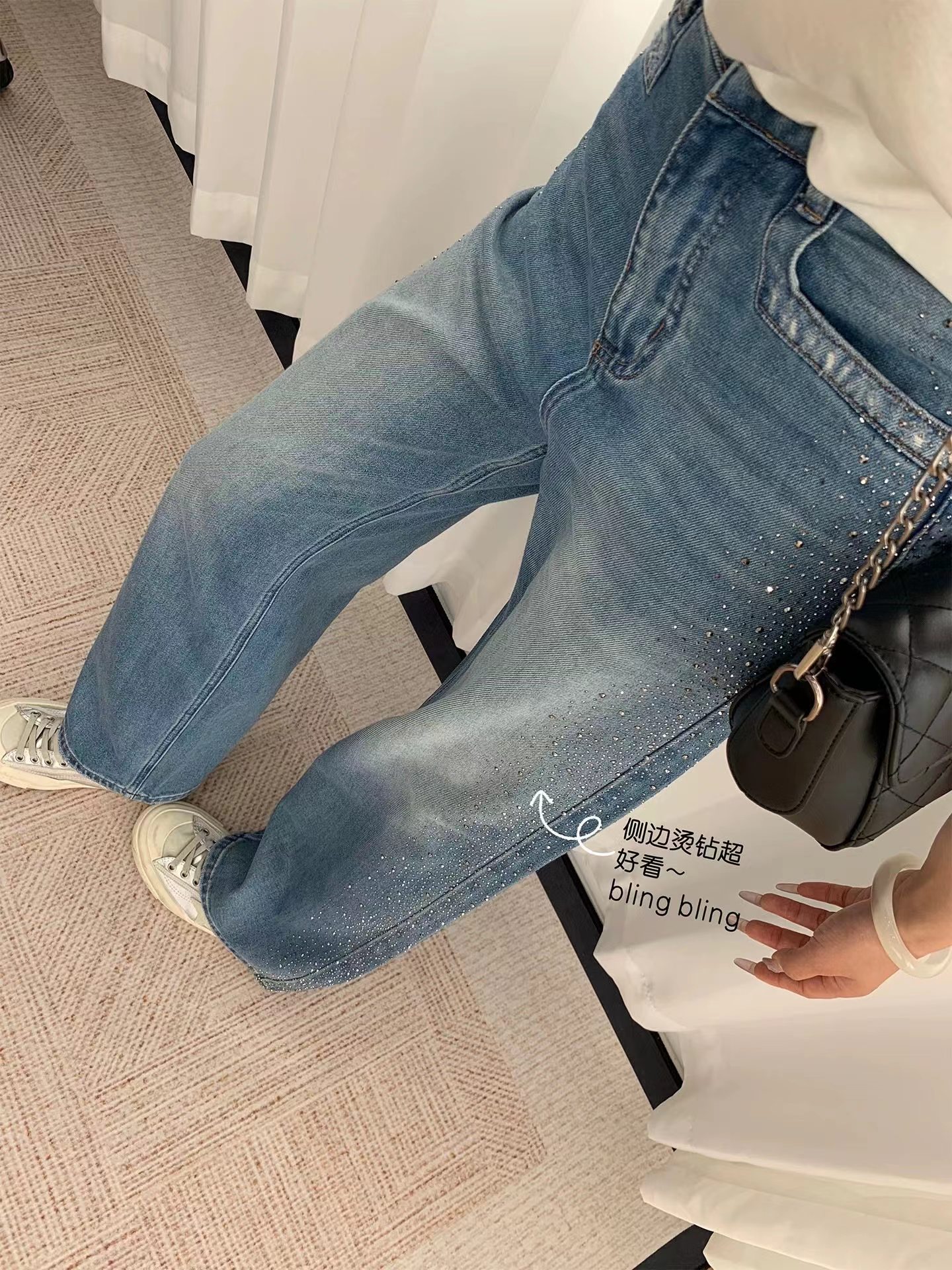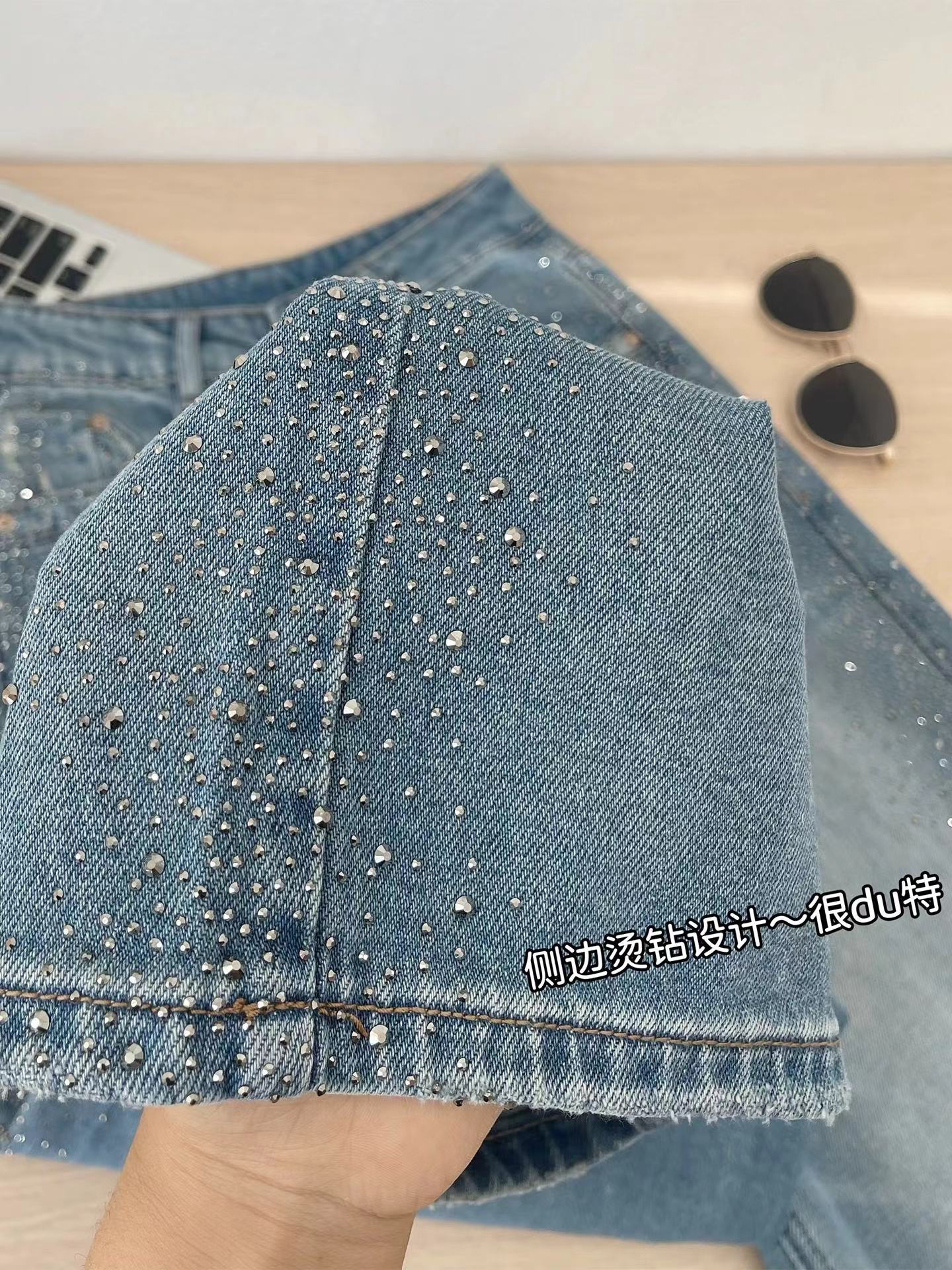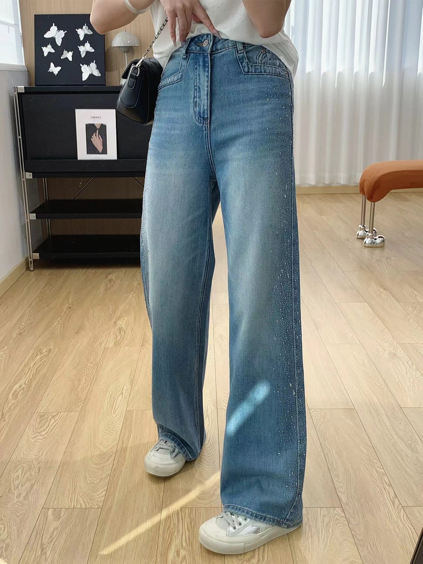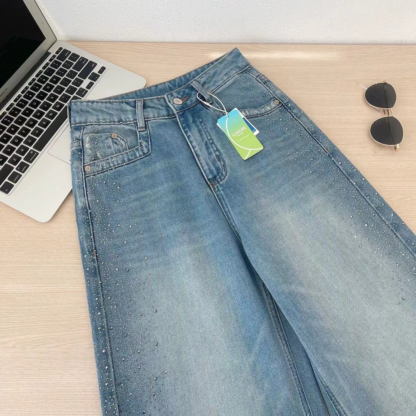 满天星爆闪烫钻春季新款阔腿牛仔裤女高腰垂感带钻直筒长裤, 闪钻阔腿牛仔裤 | 把星光穿在腿上。 版型魔法:高腰直筒阔腿剪裁,藏起胯宽腿粗,拉长比例秒变“超模腿”,走路带风又自在。细节小心机:侧边渐变闪钻点缀,低调又jing致,阳光下细碎发光,日常通勤或约会都能hold住氛围感。质感担当:天丝混纺牛仔面料,柔软垂顺不闷汗,复古水洗蓝自带慵懒滤镜,搭配小香风外套、条纹衫都超和谐。百搭wang者:配小白鞋是元气少女,搭高跟鞋秒变御姐,春秋单穿、冬天叠穿长靴,一裤承包四季造型。