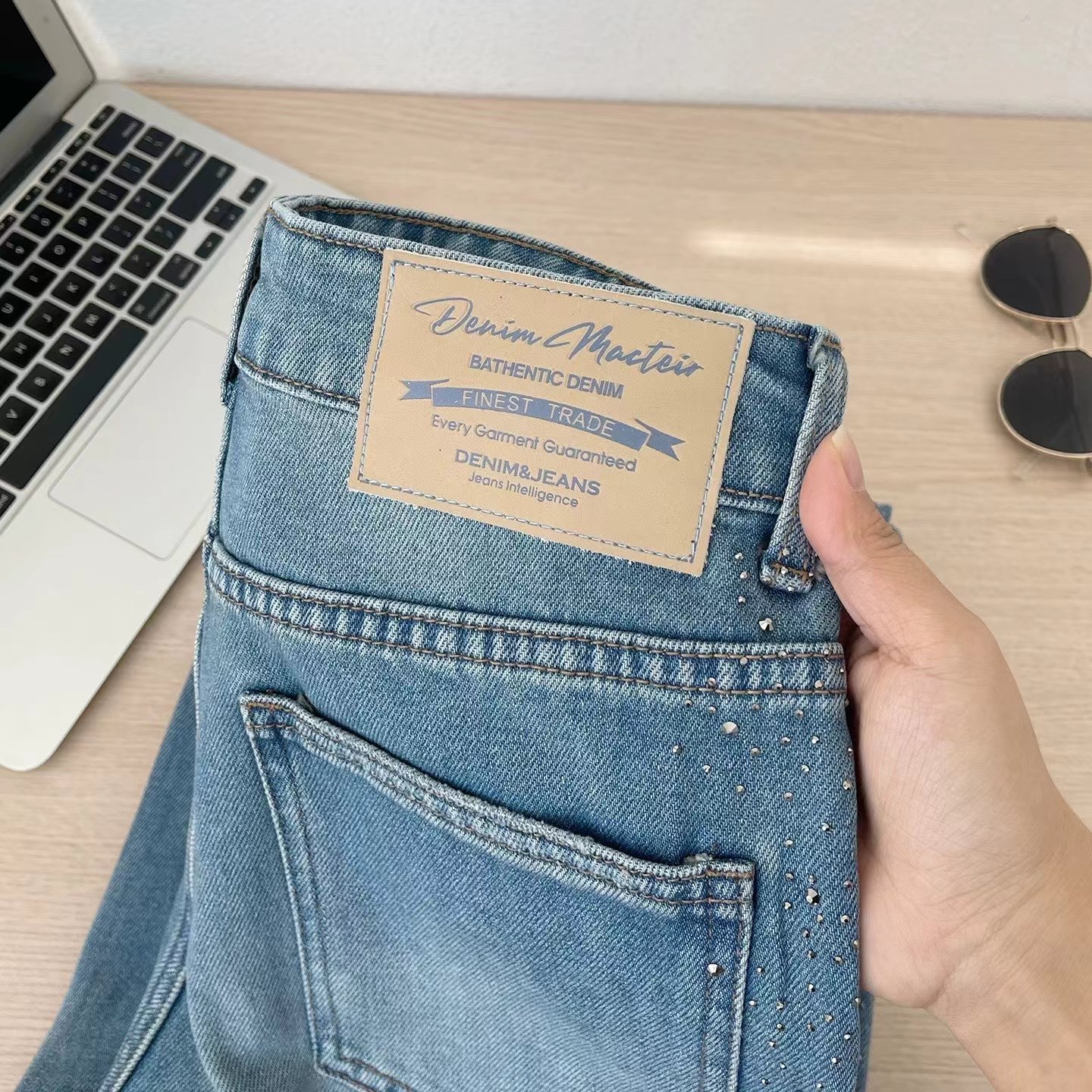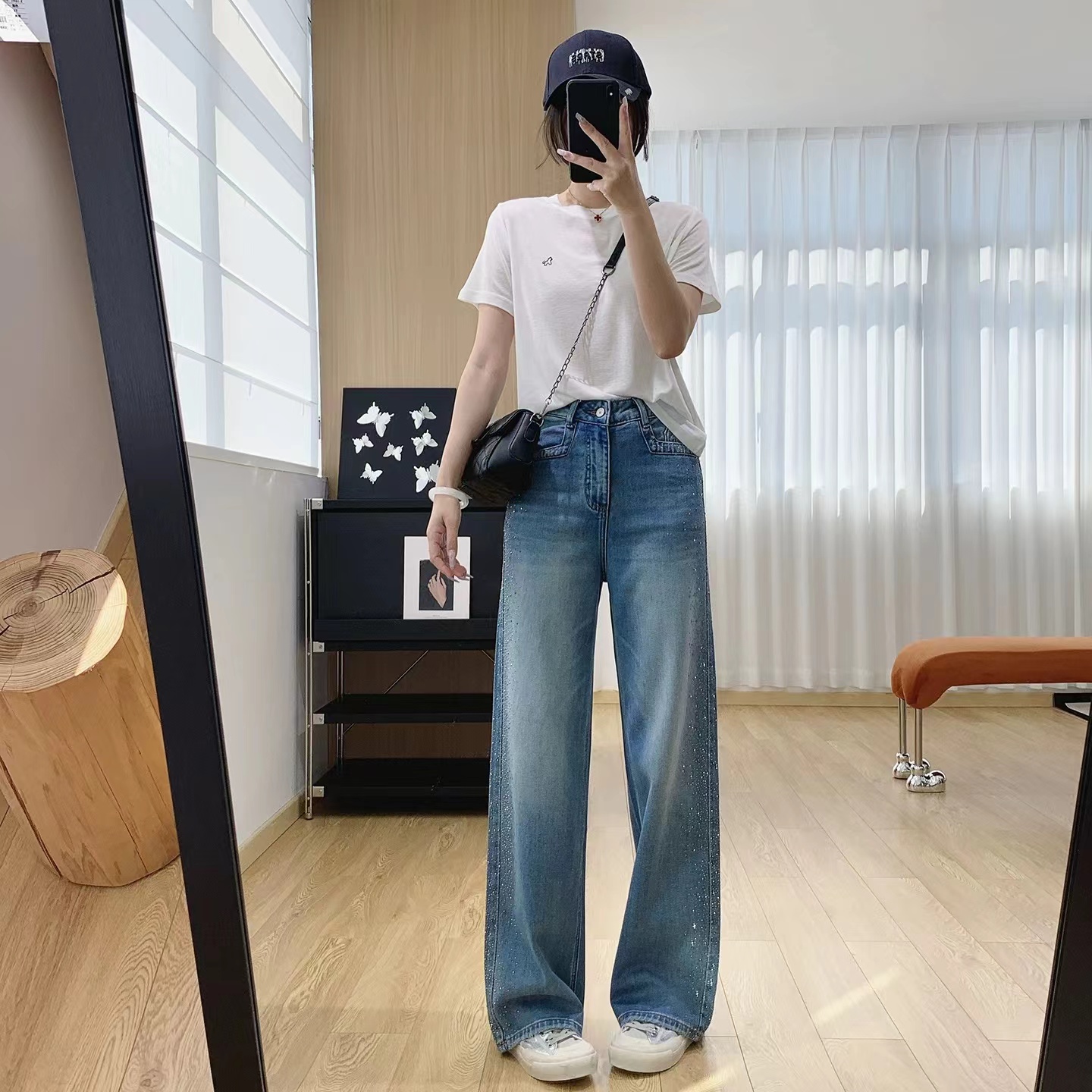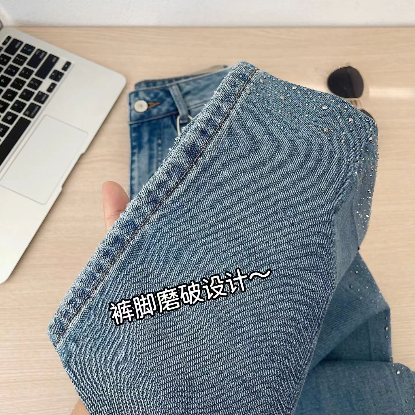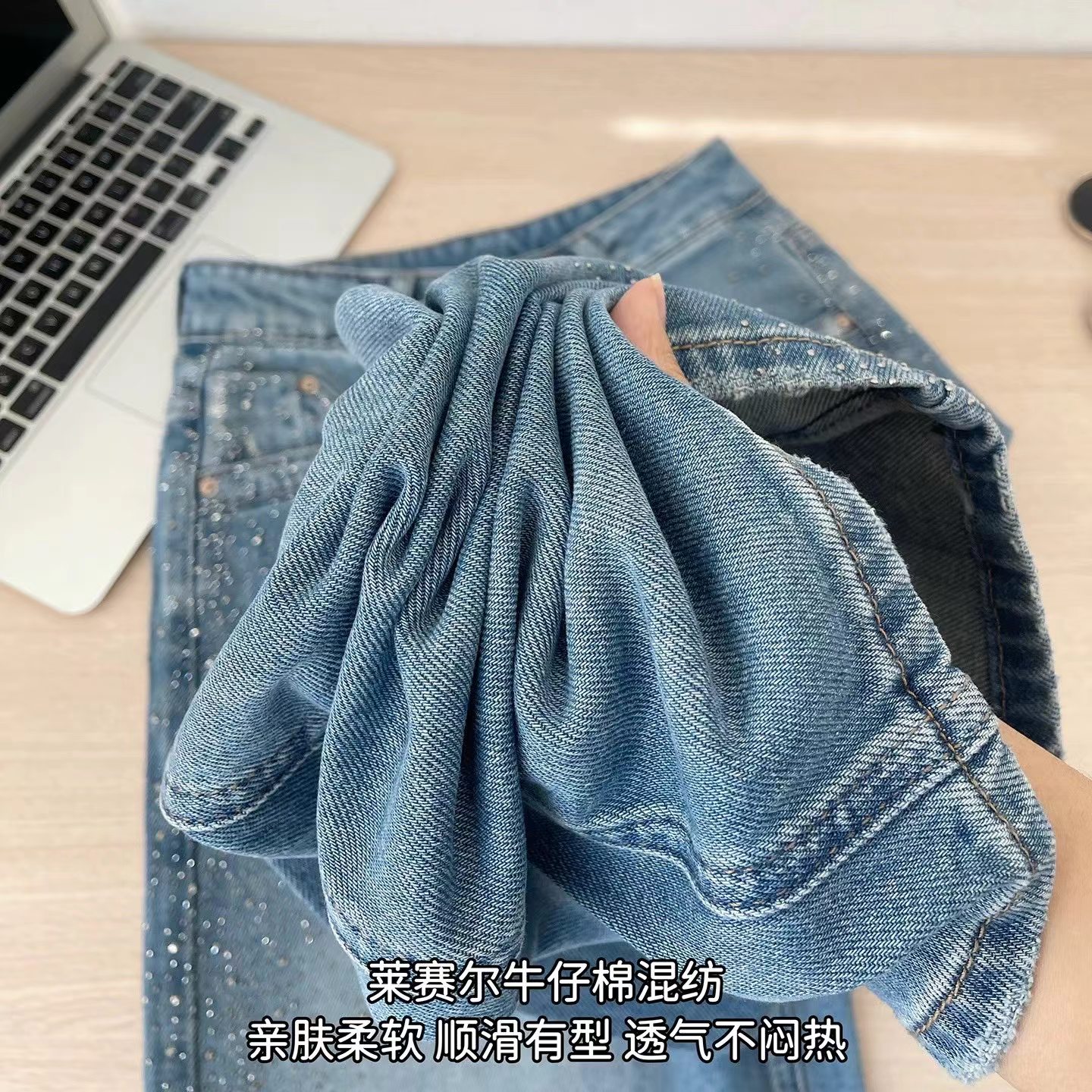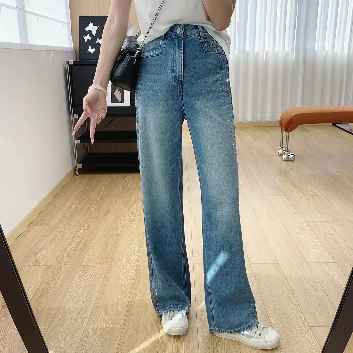 满天星爆闪烫钻春季新款阔腿牛仔裤女高腰垂感带钻直筒长裤, 闪钻阔腿牛仔裤 | 把星光穿在腿上。 版型魔法:高腰直筒阔腿剪裁,藏起胯宽腿粗,拉长比例秒变“超模腿”,走路带风又自在。细节小心机:侧边渐变闪钻点缀,低调又jing致,阳光下细碎发光,日常通勤或约会都能hold住氛围感。质感担当:天丝混纺牛仔面料,柔软垂顺不闷汗,复古水洗蓝自带慵懒滤镜,搭配小香风外套、条纹衫都超和谐。百搭wang者:配小白鞋是元气少女,搭高跟鞋秒变御姐,春秋单穿、冬天叠穿长靴,一裤承包四季造型。