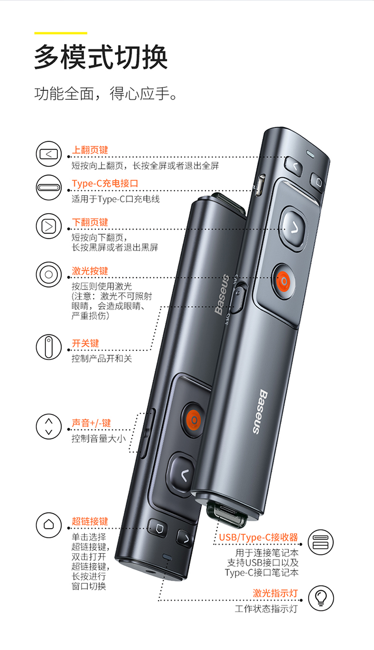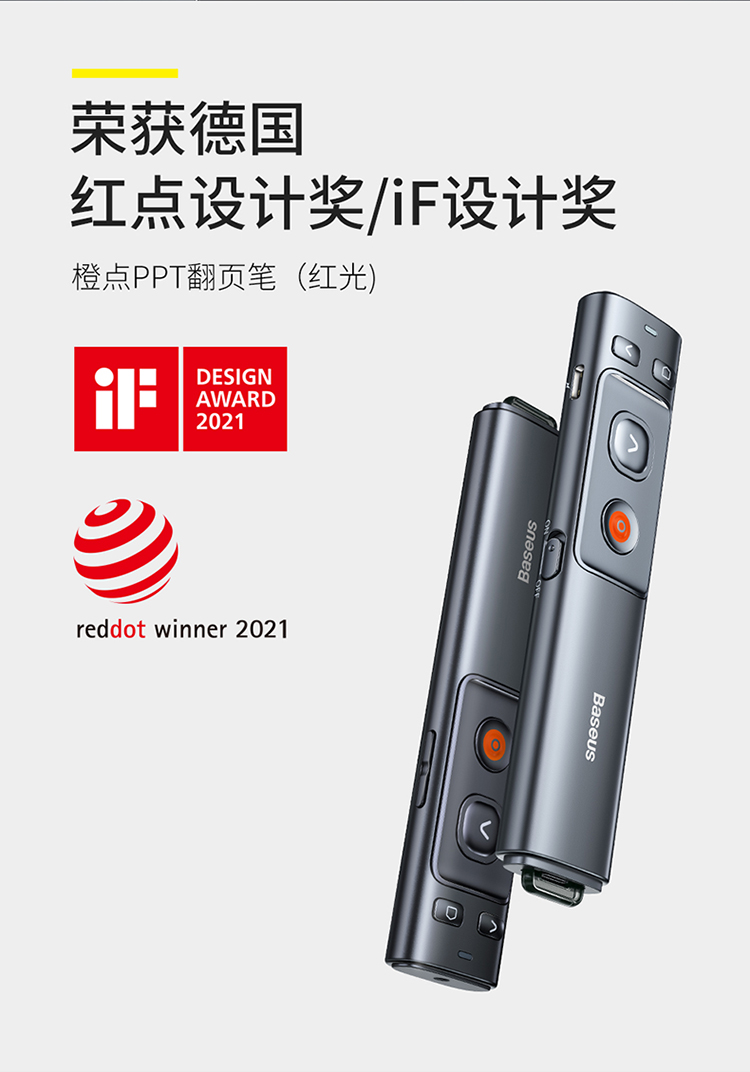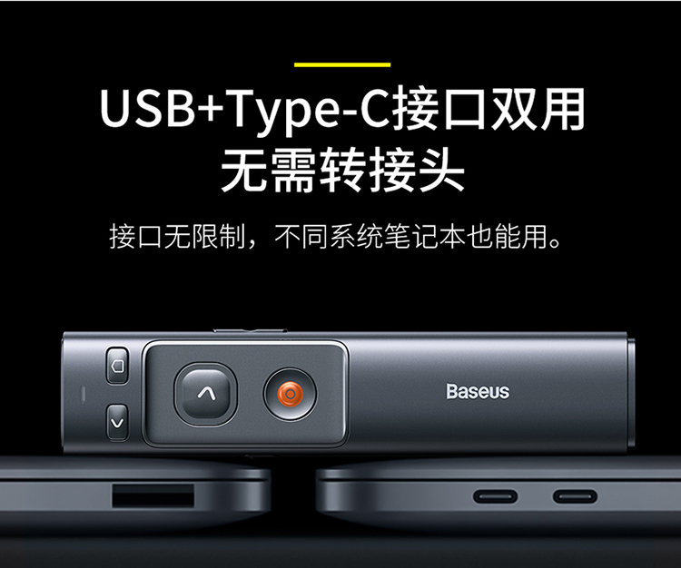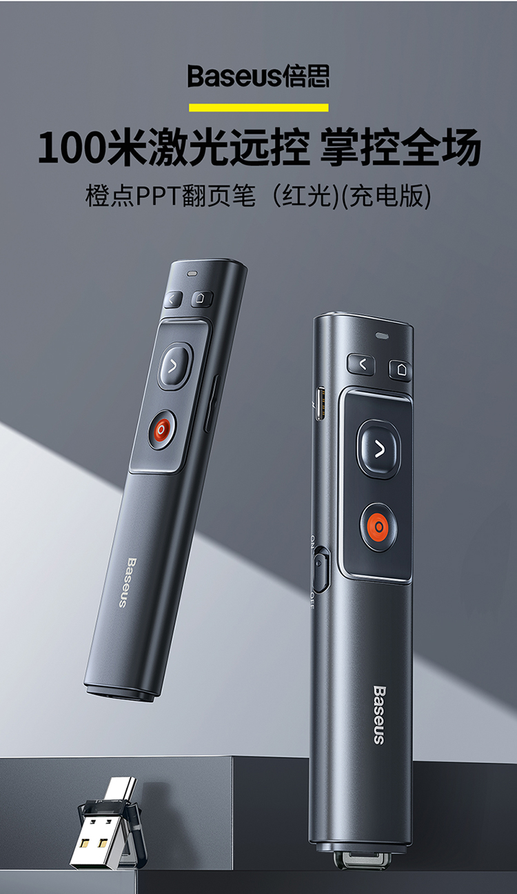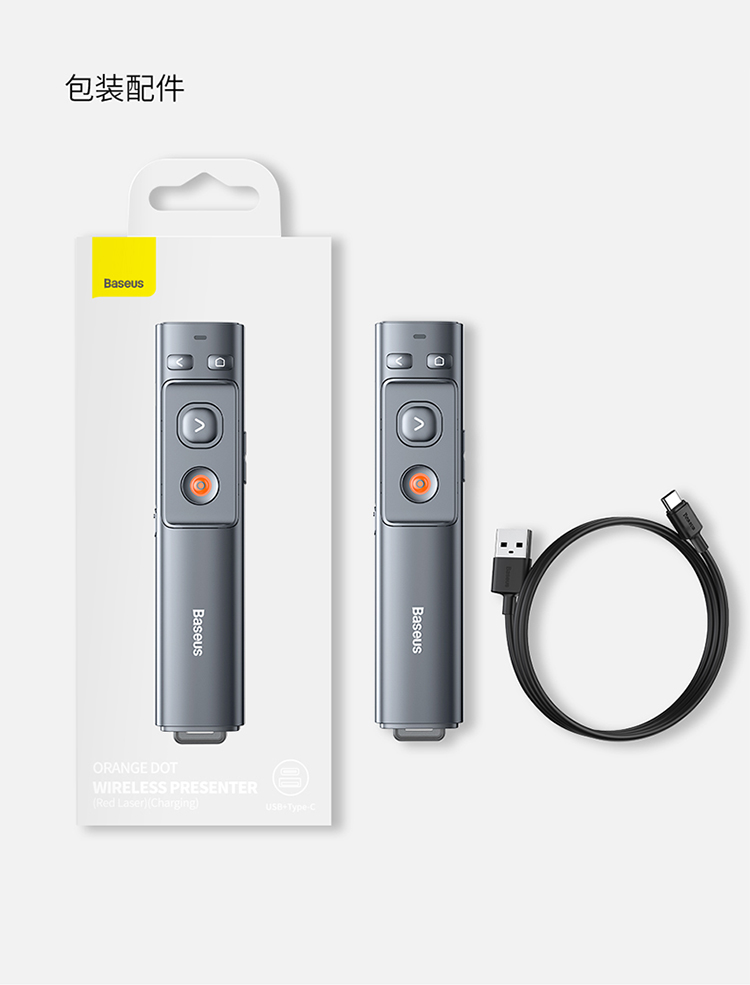 倍思 橙点PPT翻页笔(红光)(充电版)(含:简易通用数据线 Type-c 3A 0.5M 黑色)