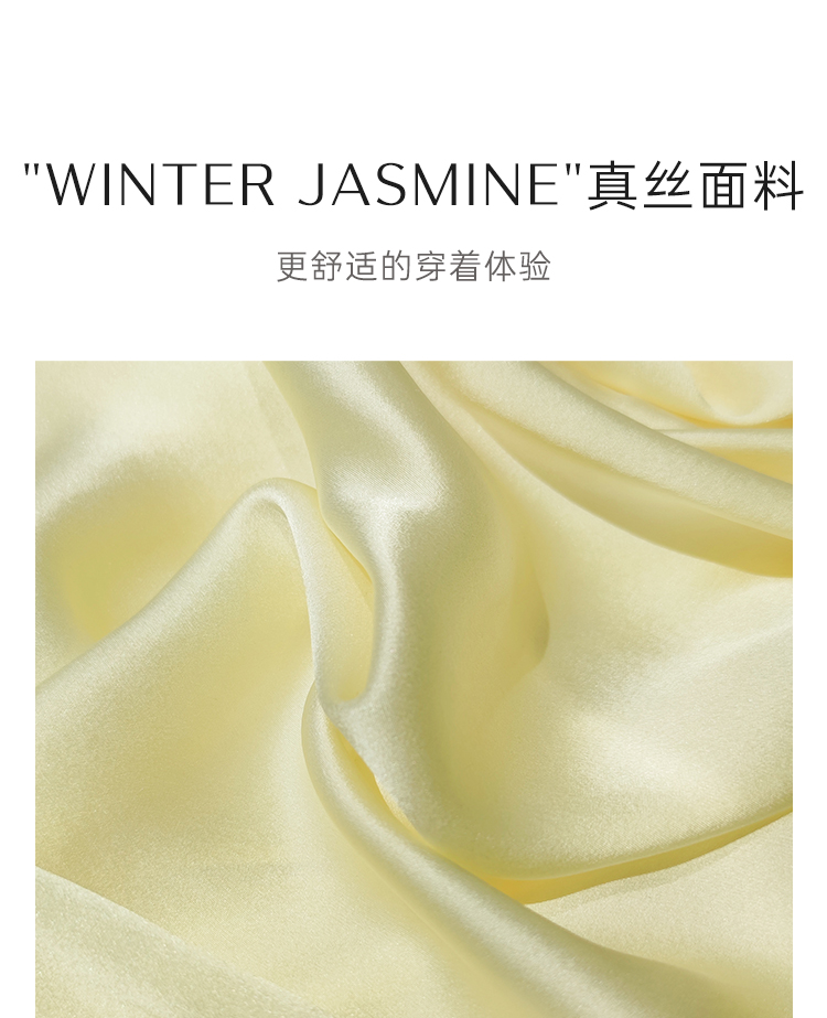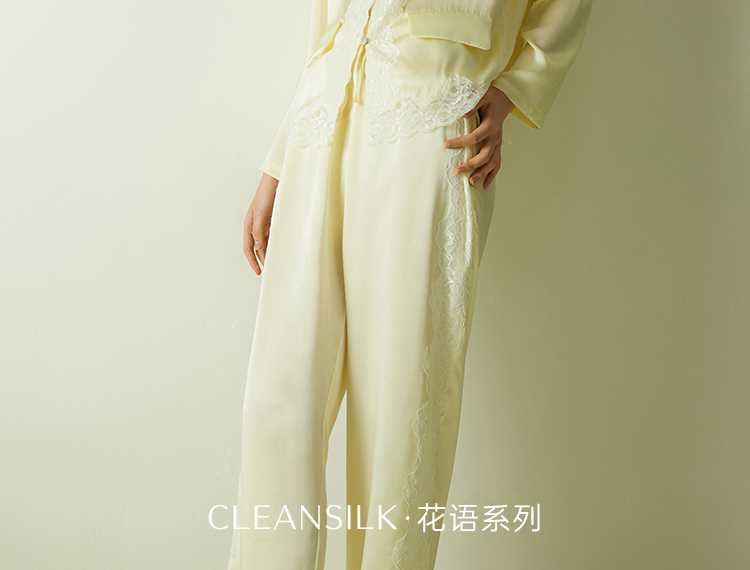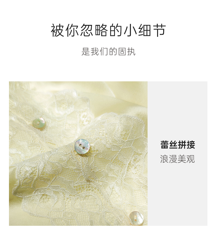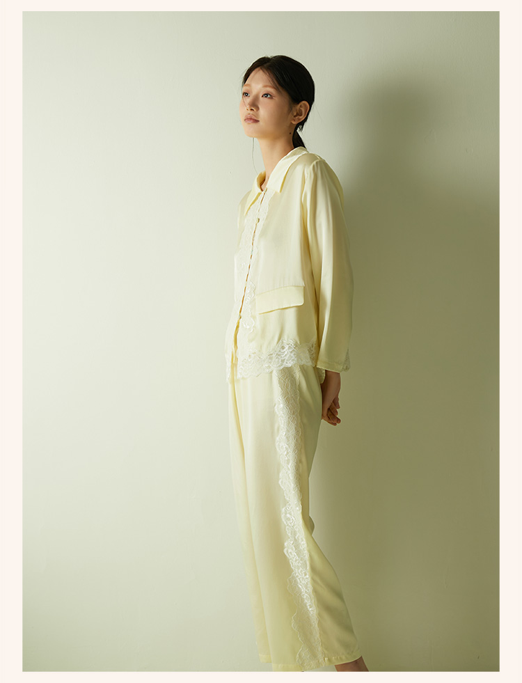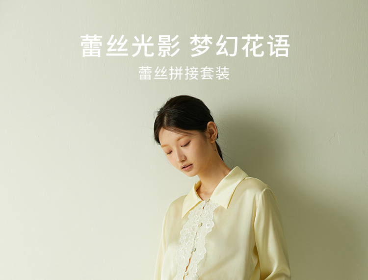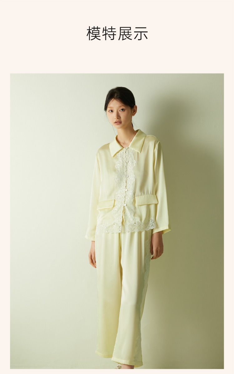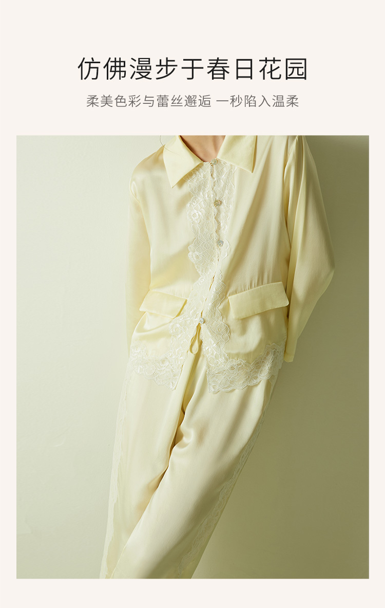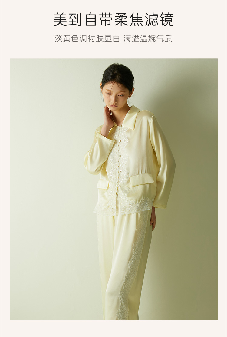 桑罗蕾丝拼接真丝睡衣套装女立领奶黄色休闲凉爽透气居家服可外穿