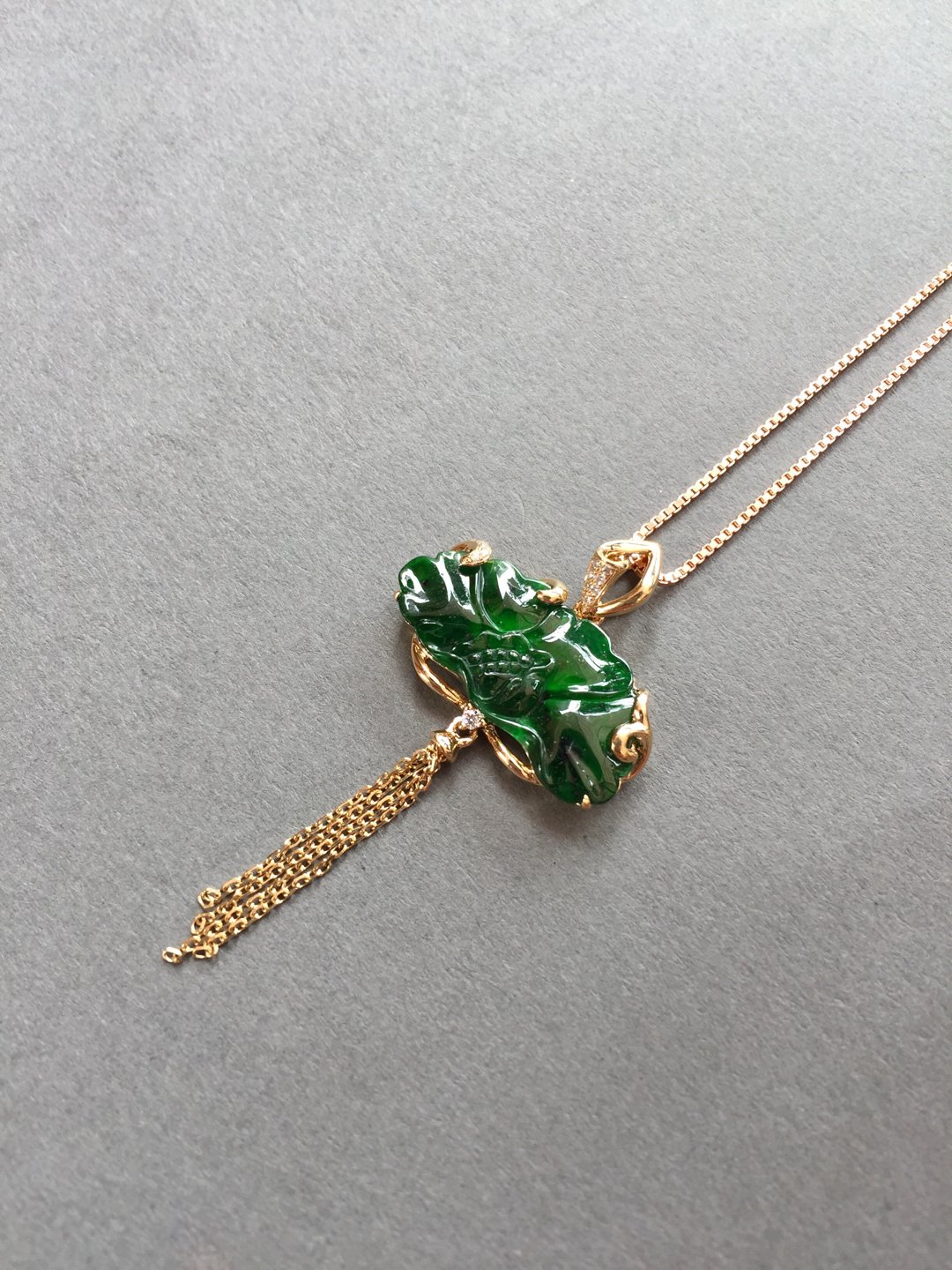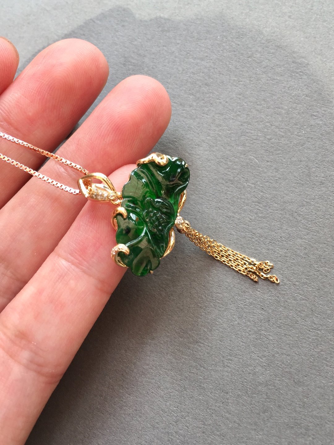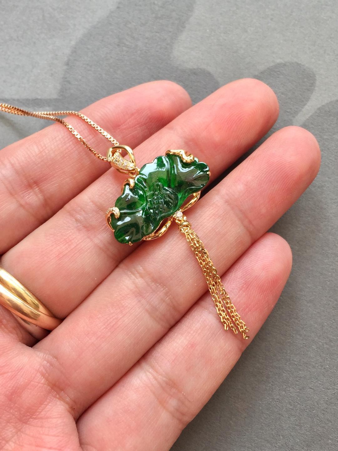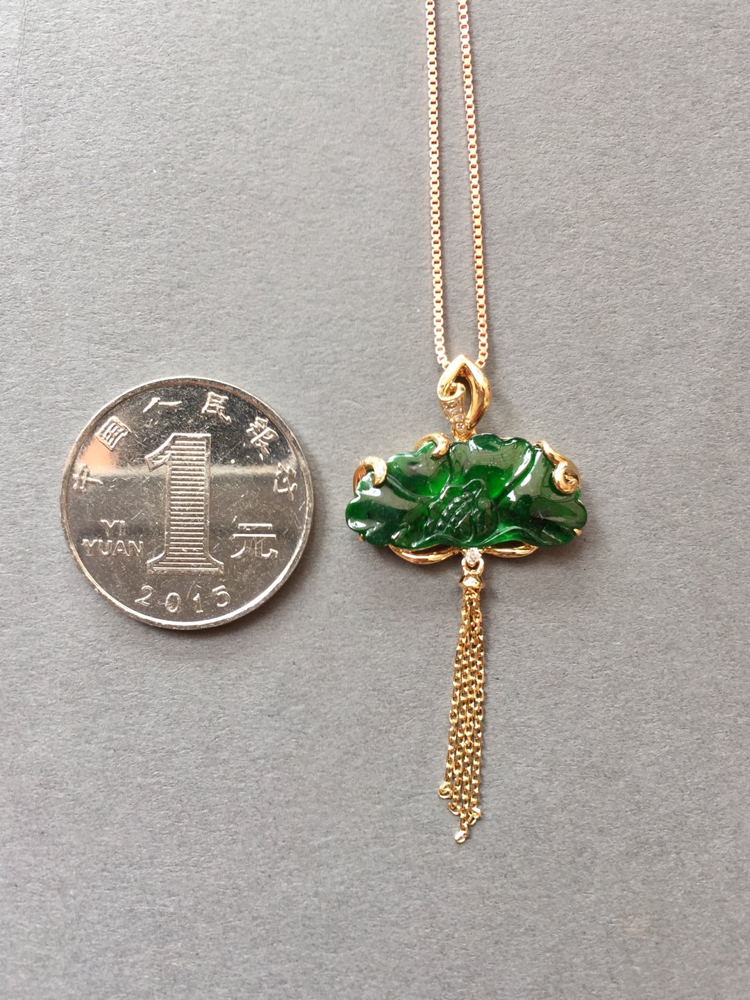 翡翠高冰种满绿和和美美,23.1*11.4*1.8mm,镶嵌后47.5*23.1*4mm。晶莹剔透的种水荧光四射。绿色艳丽浓郁,图片拍不太出来,是阳绿到菠菜绿,富贵大气。设计款独特镶嵌设计,18k黄金钻石包裹下的荷叶,流苏的设计营造出浓郁民族风情,只要小四价位即可拥有,上身别致靓丽