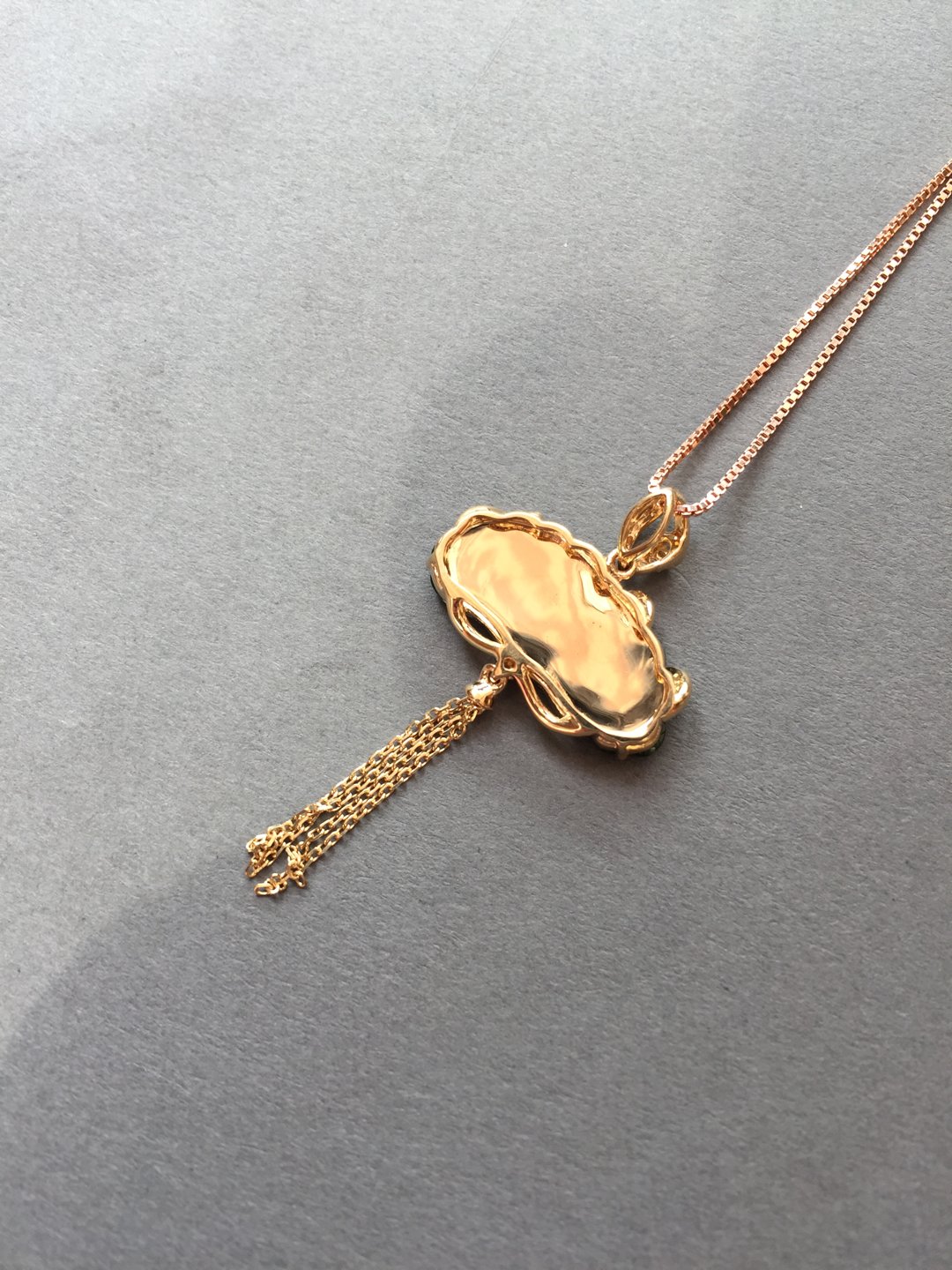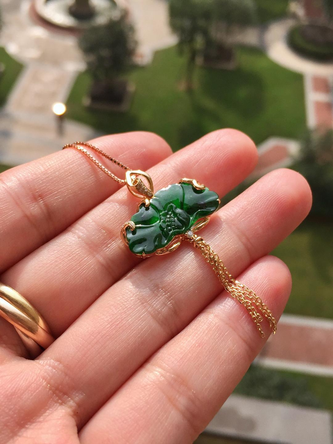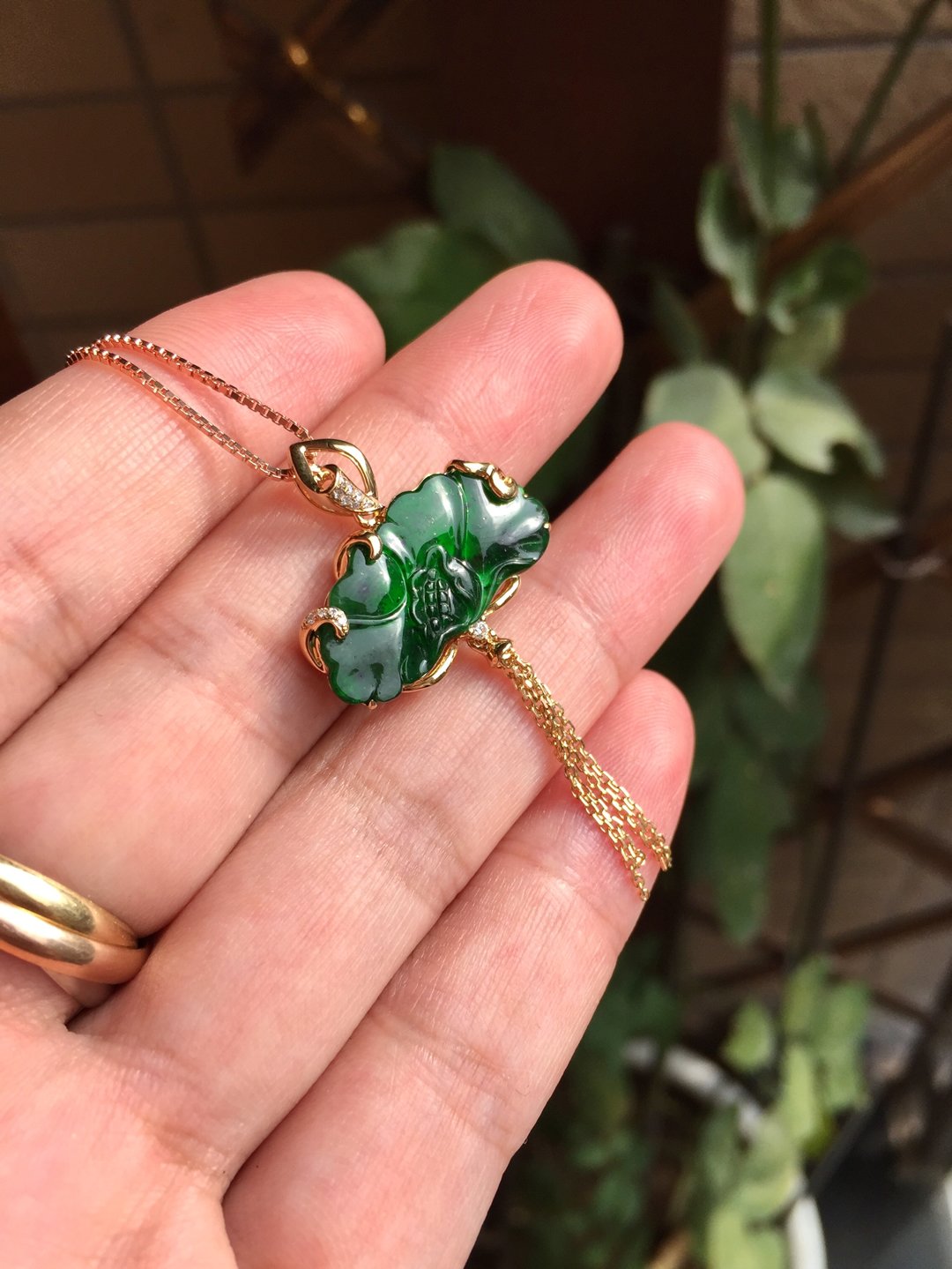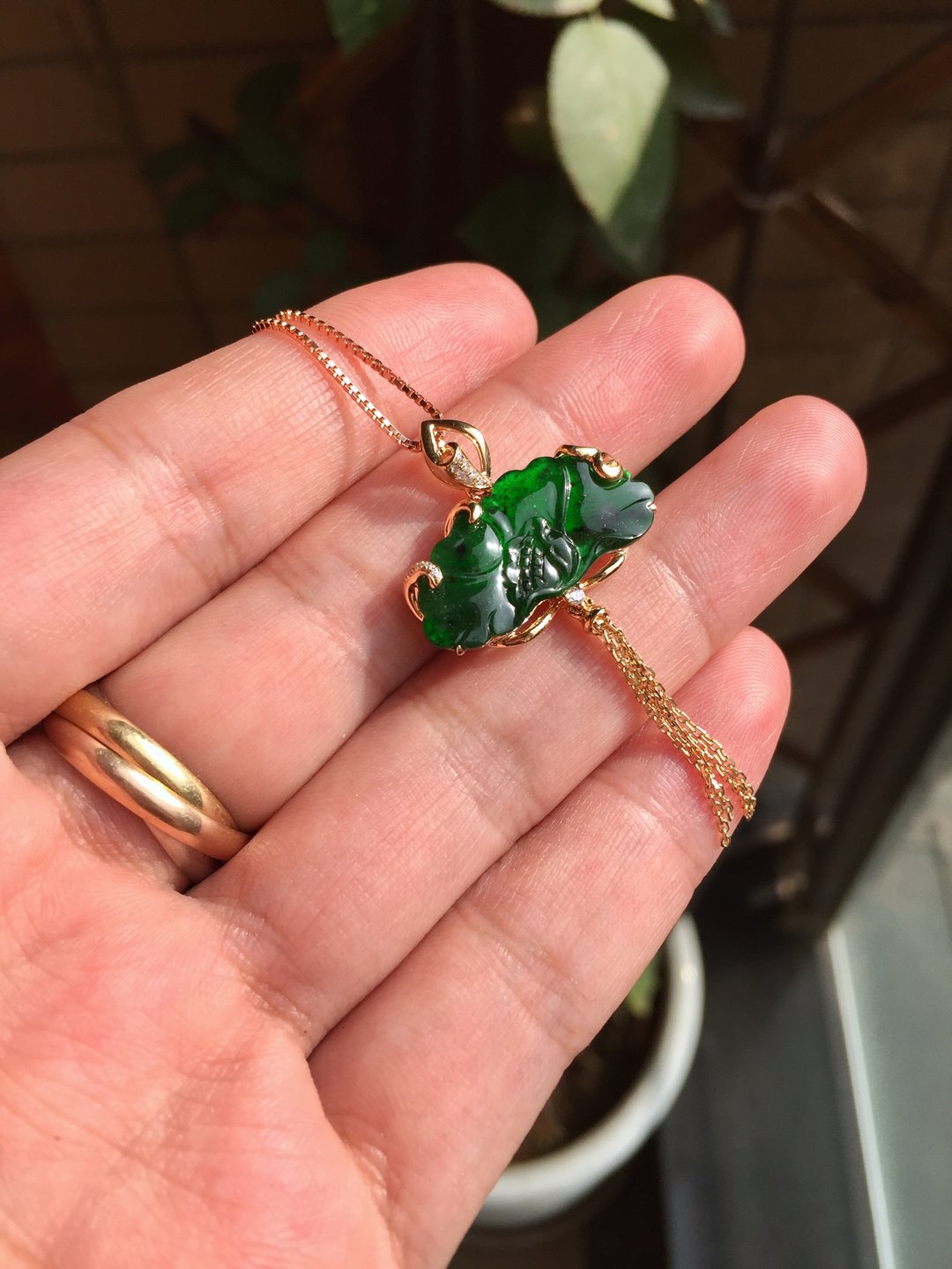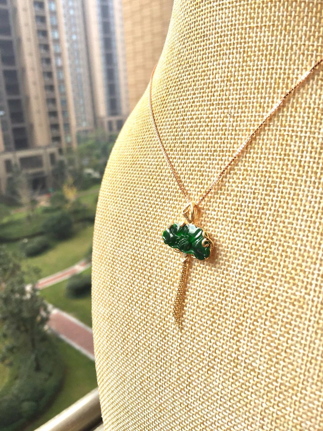 翡翠高冰种满绿和和美美,23.1*11.4*1.8mm,镶嵌后47.5*23.1*4mm。晶莹剔透的种水荧光四射。绿色艳丽浓郁,图片拍不太出来,是阳绿到菠菜绿,富贵大气。设计款独特镶嵌设计,18k黄金钻石包裹下的荷叶,流苏的设计营造出浓郁民族风情,只要小四价位即可拥有,上身别致靓丽