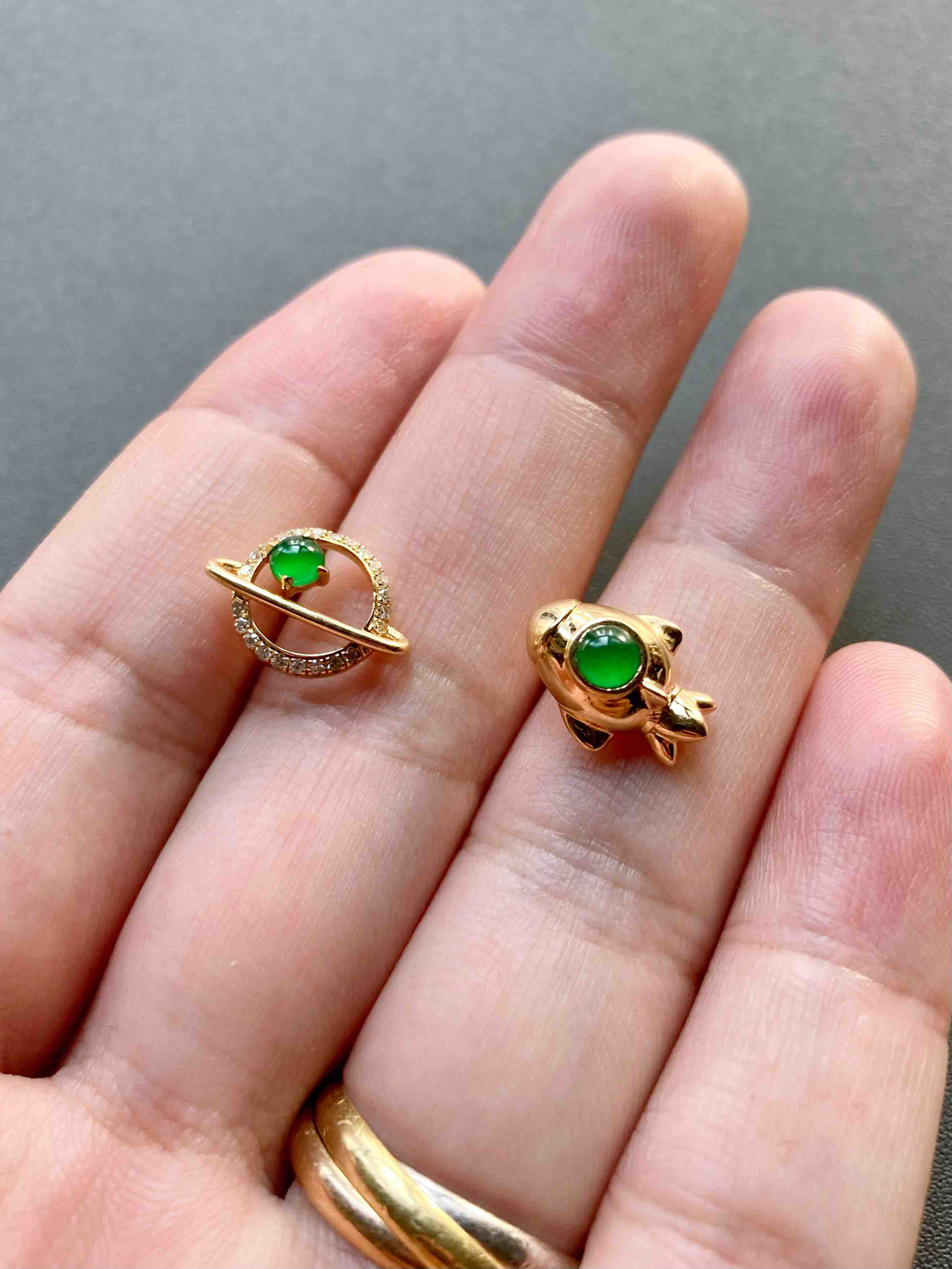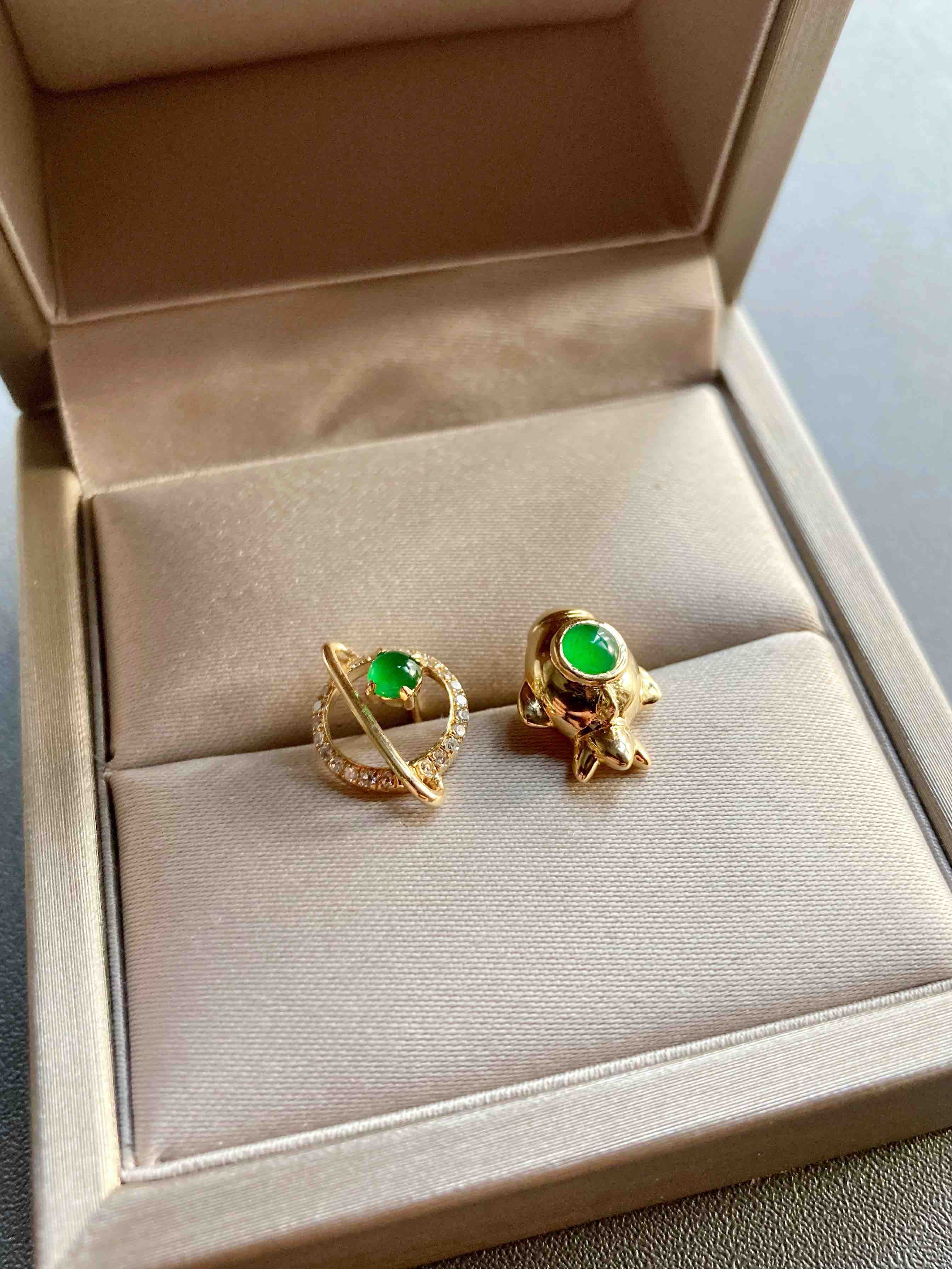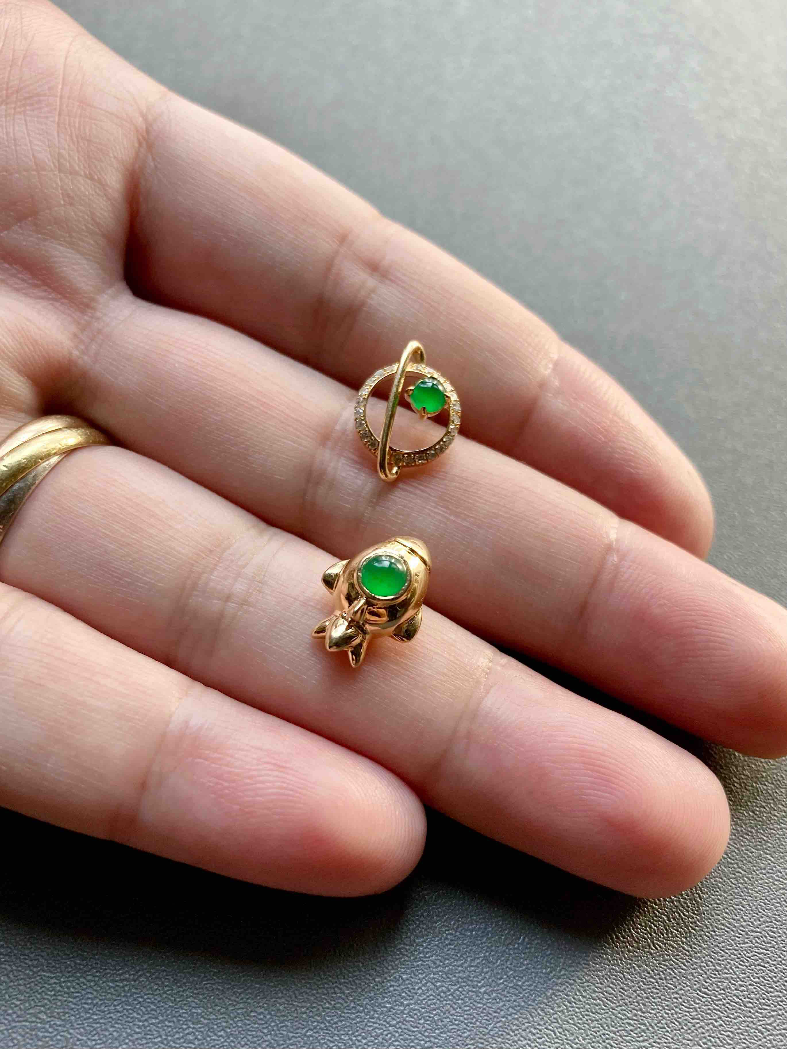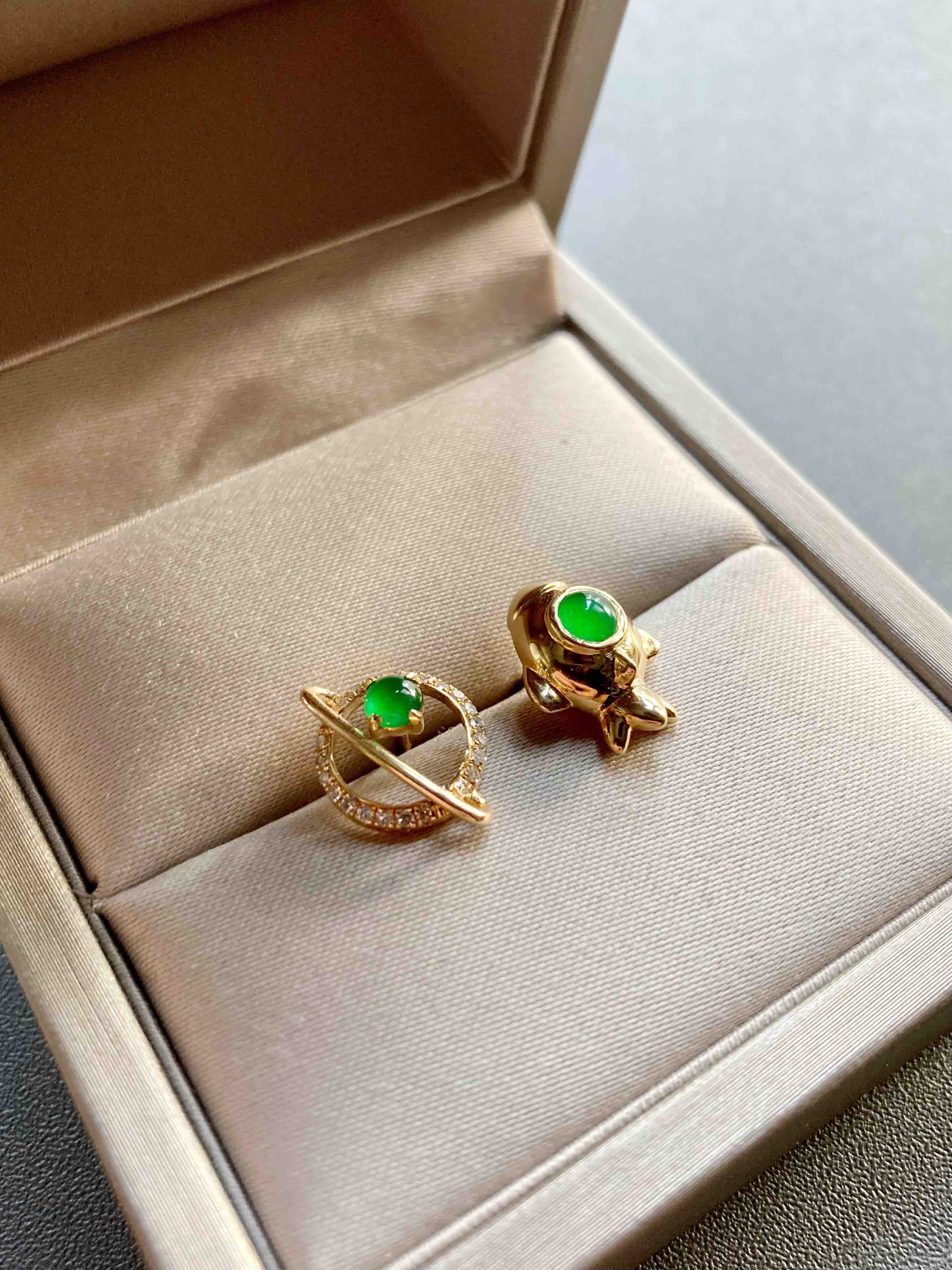 我们的征途是星辰大海,超特别的耳钉设计,高冰种阳绿翡翠蛋面荧光四射,艳丽无比,18k黄金钻石镶嵌,这么小的耳钉能做得这么精致,一艘宇宙飞船带你到浩瀚无垠的宇宙中遨游,蛋面3.7mm和3.4mm,飞船镶嵌后12.7×9.5×6.7mm
