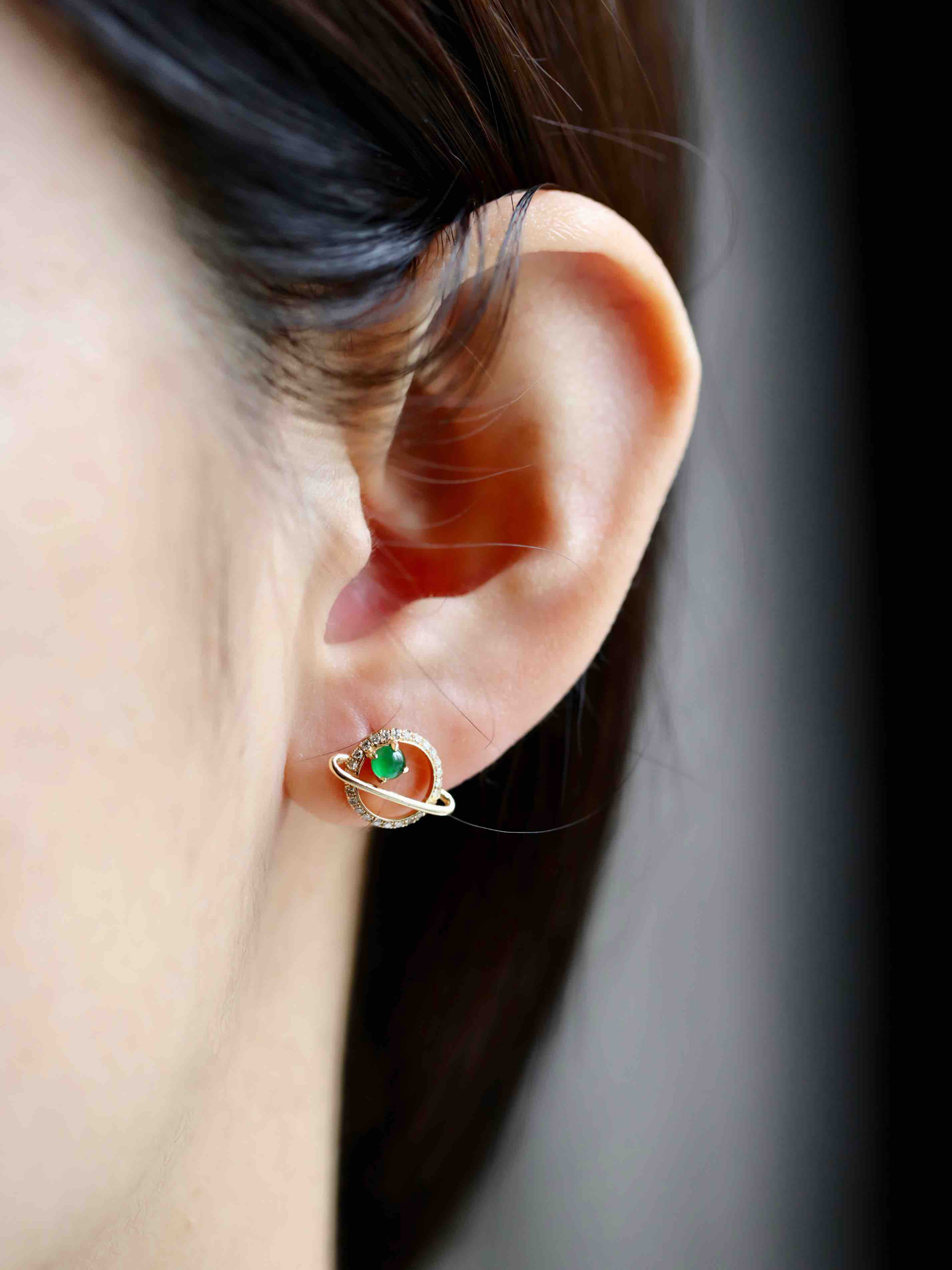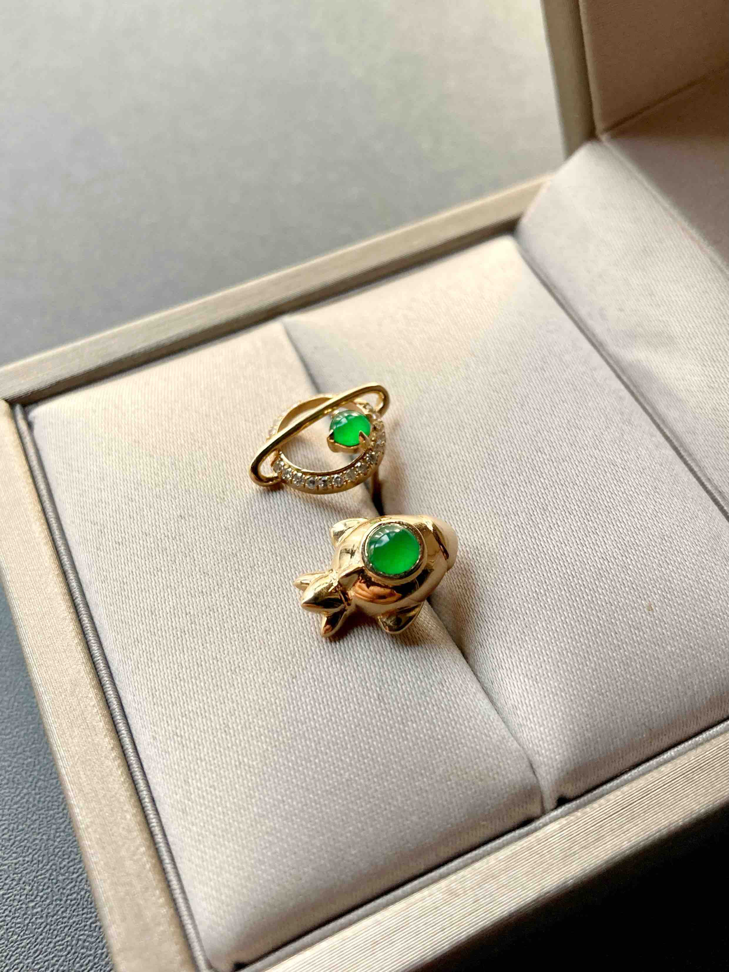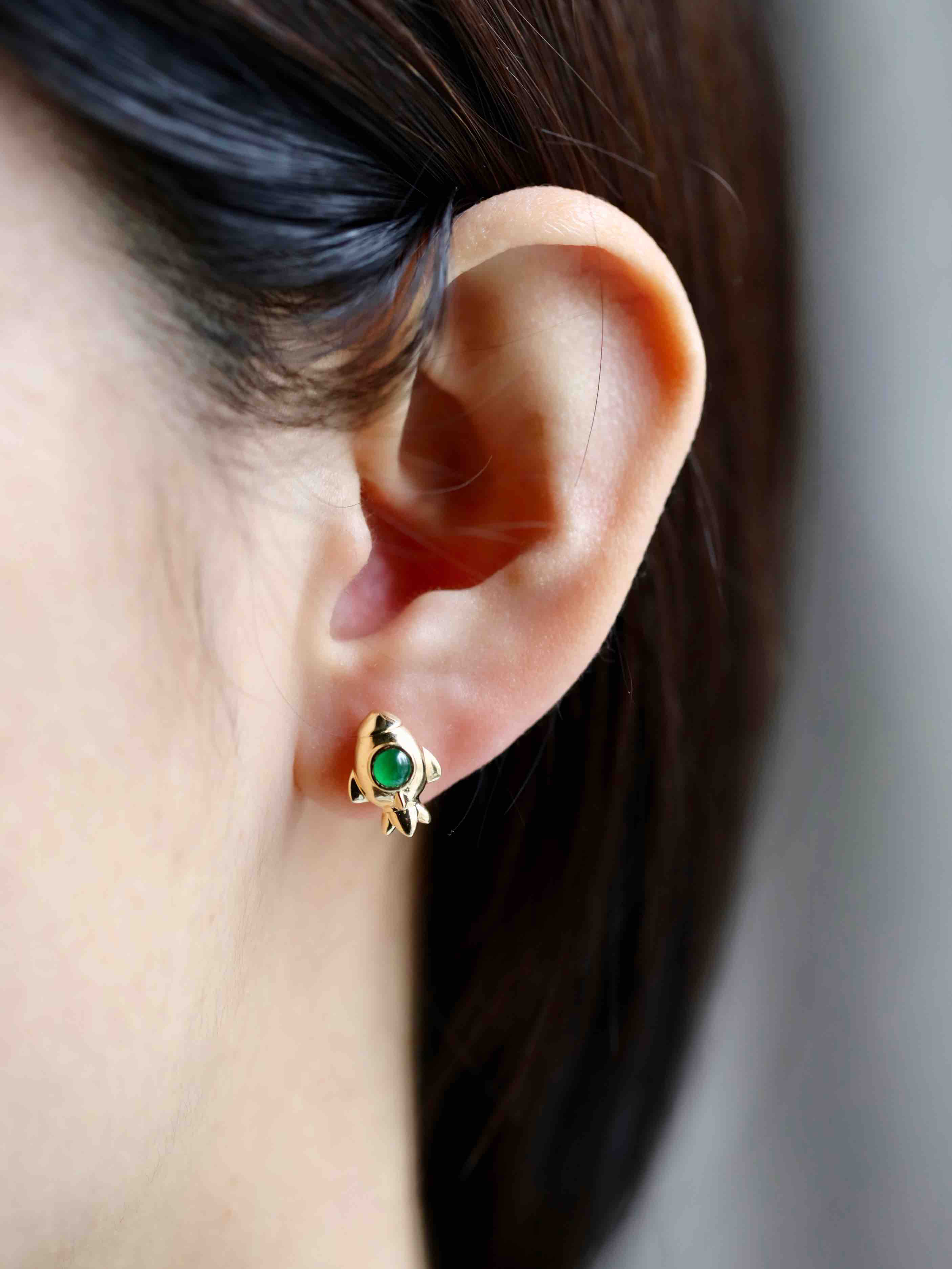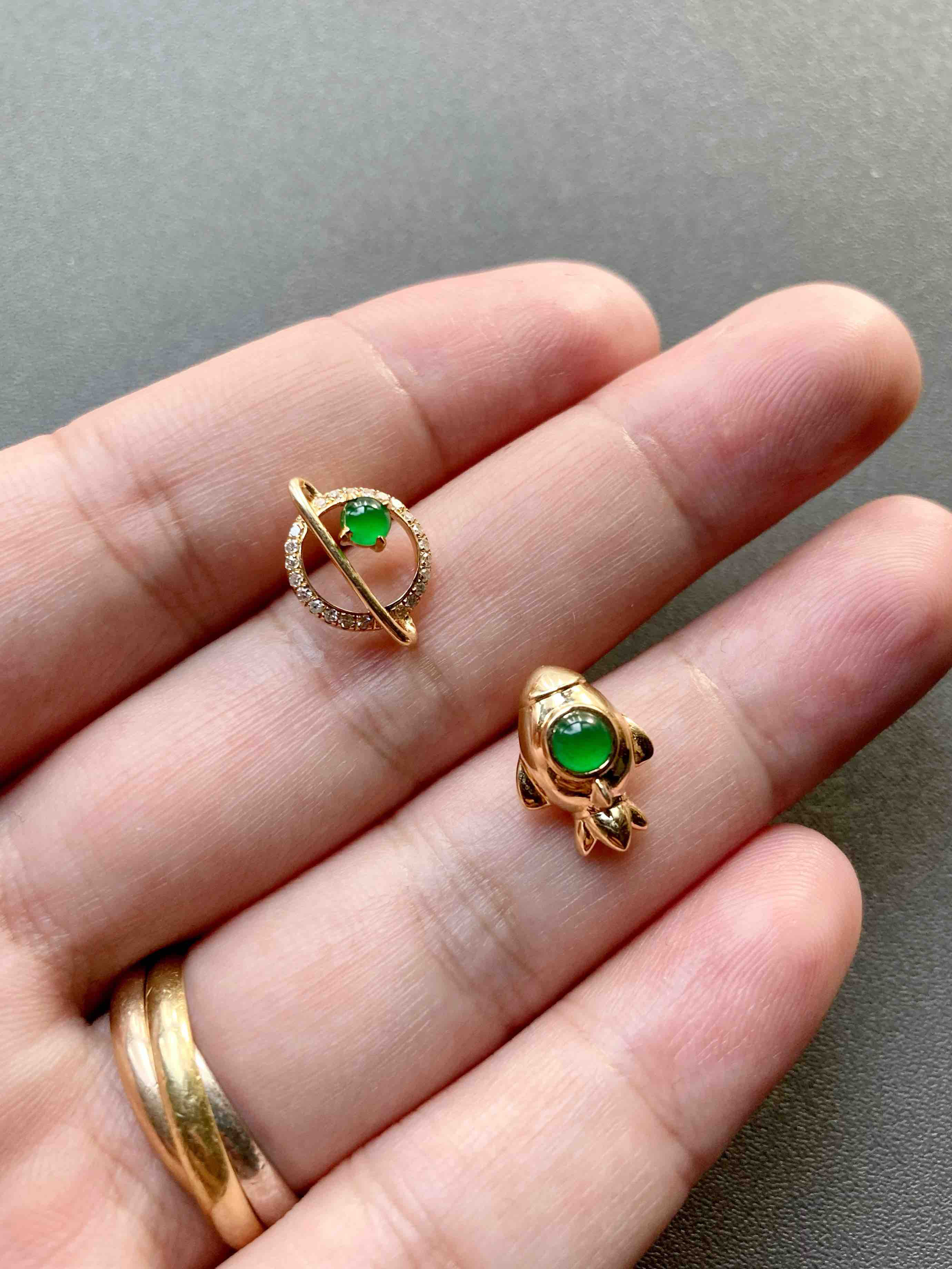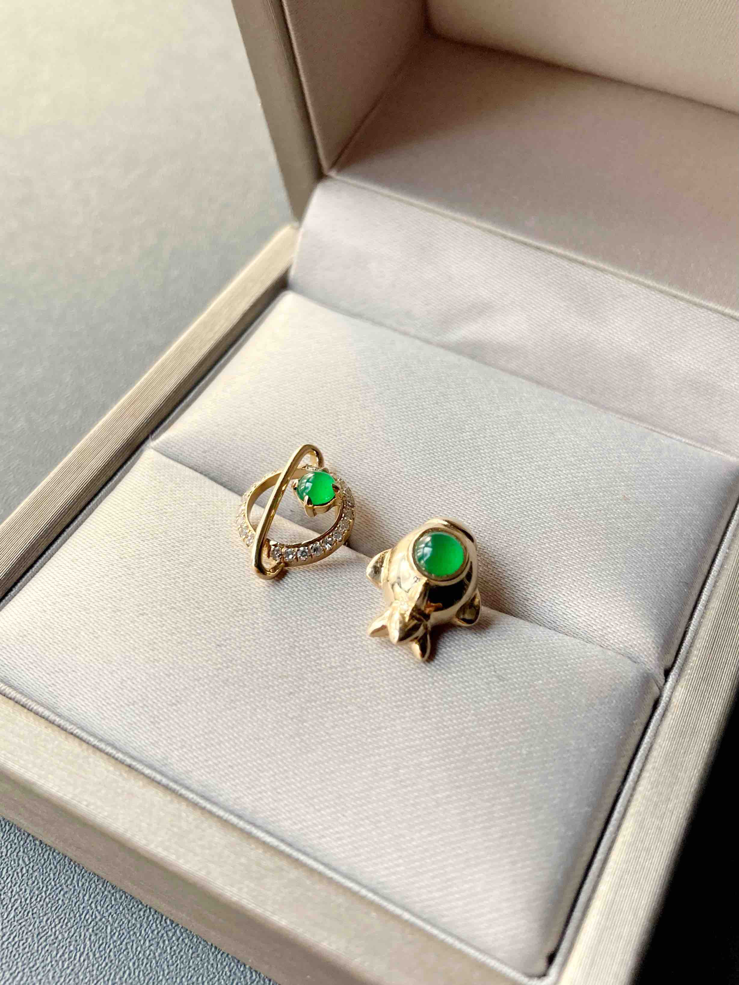 我们的征途是星辰大海,超特别的耳钉设计,高冰种阳绿翡翠蛋面荧光四射,艳丽无比,18k黄金钻石镶嵌,这么小的耳钉能做得这么精致,一艘宇宙飞船带你到浩瀚无垠的宇宙中遨游,蛋面3.7mm和3.4mm,飞船镶嵌后12.7×9.5×6.7mm